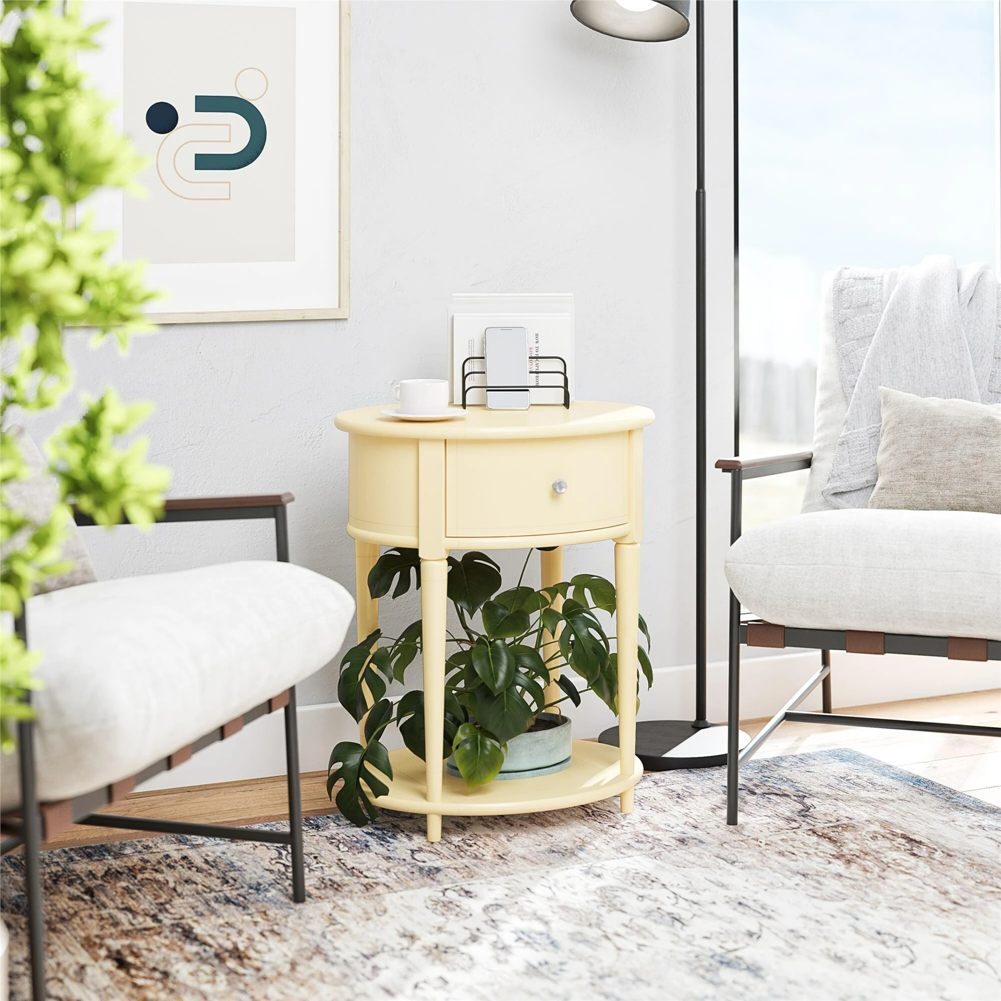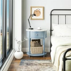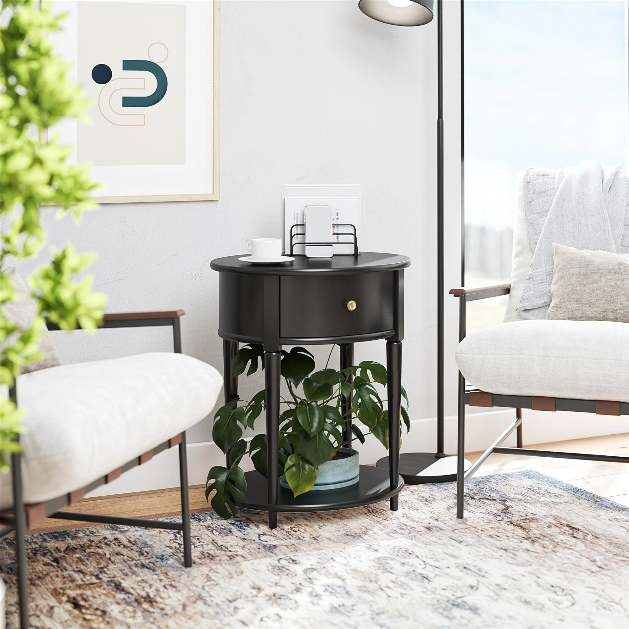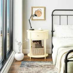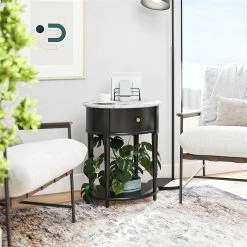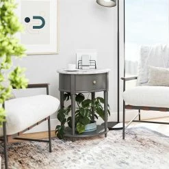 Introducing the Abbington End Table by Avenue Greene. ย The classic elegance of the rounded top and tapered legs creates a vintage and sophisticated feel perfect for any dรฉcor. ย The End Table features a spacious drawer for storing remotes, coasters or clutter out of sight, and the lower shelf is perfect for books, magazines or even decorative items to cozy up the room. ย Because of its charming round design and storage, The Abbington End Table looks gorgeous as a bedside table as well! ย Made of plywood and painted MDF, the Abbington End Table is as durable as it is affordable and assembly is a snap! ย With the preassembled table top and drawer all ready to go right out of the box, just attach the legs and bottom shelf, and you’re off to more important things, like basking in the ambiance of a well decorated room. ย Assembled dimensions: 21.6″ W x 17.6″ D x 26″ H. ย Assembled weight 29 lbs.