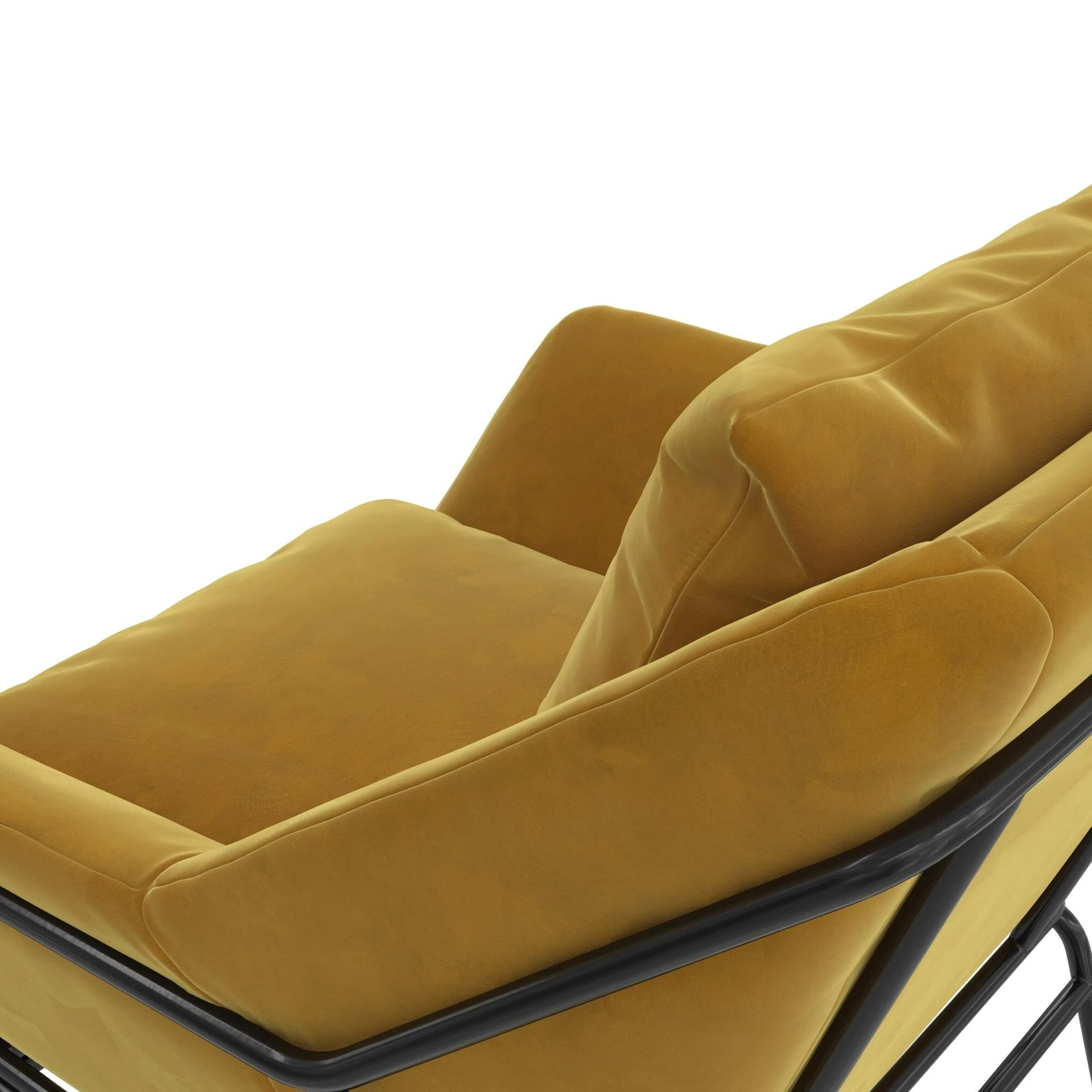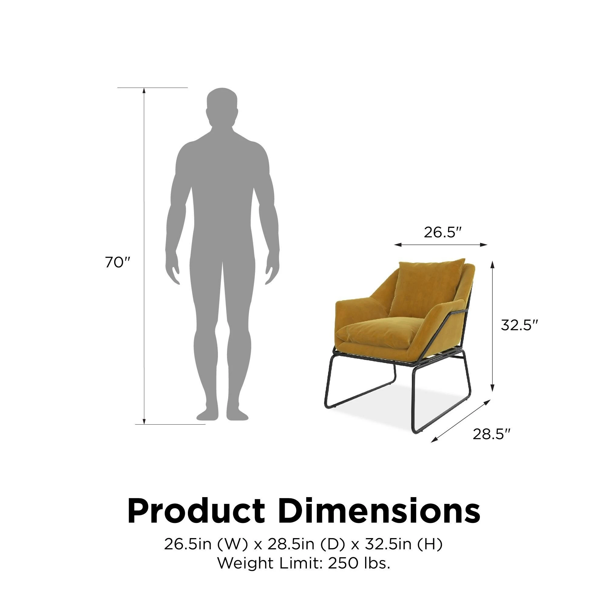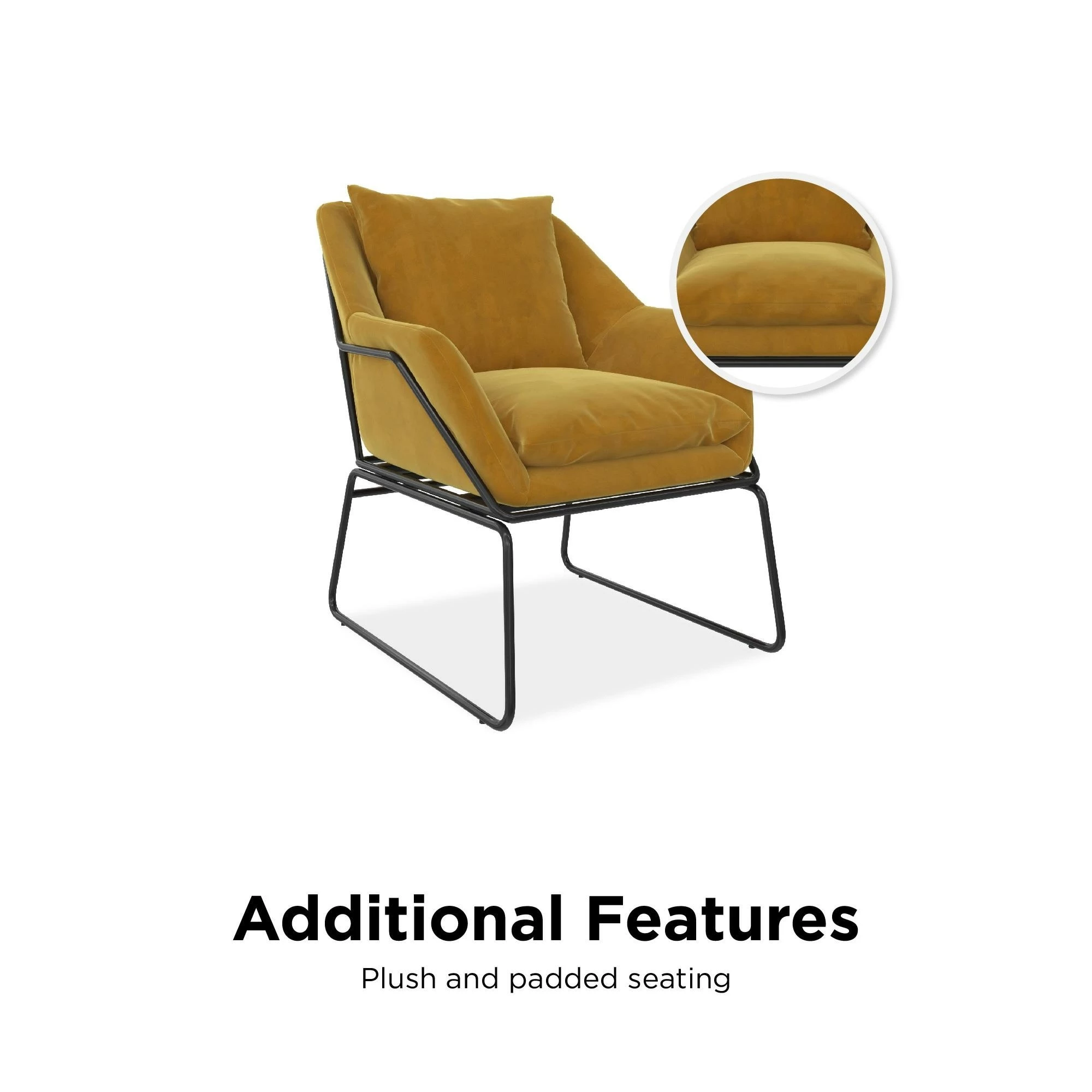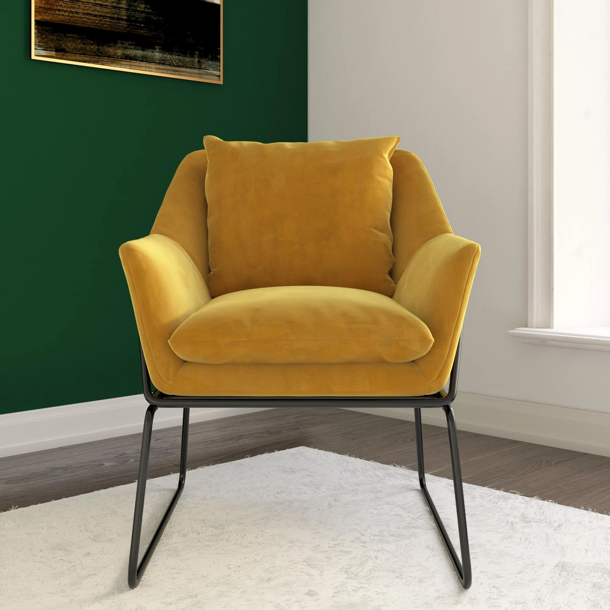 Upholstered in lush velvet, this accent armchair flaunts a striking figure, along with sloped armrests, a robust metal frame, and cushioned seating fit for royalty, all in a sleek black metal and mustard velvet package as gorgeous as it is unique.