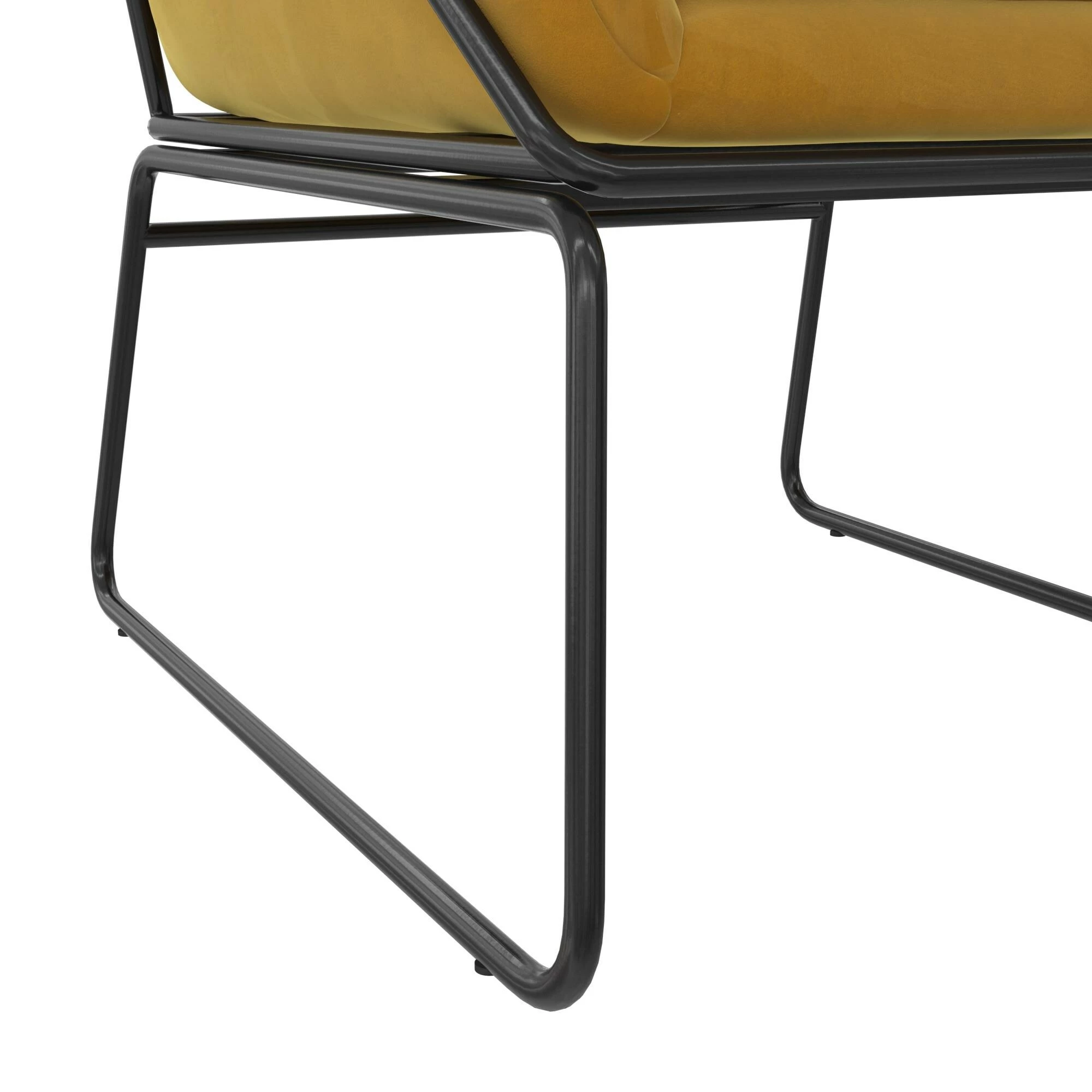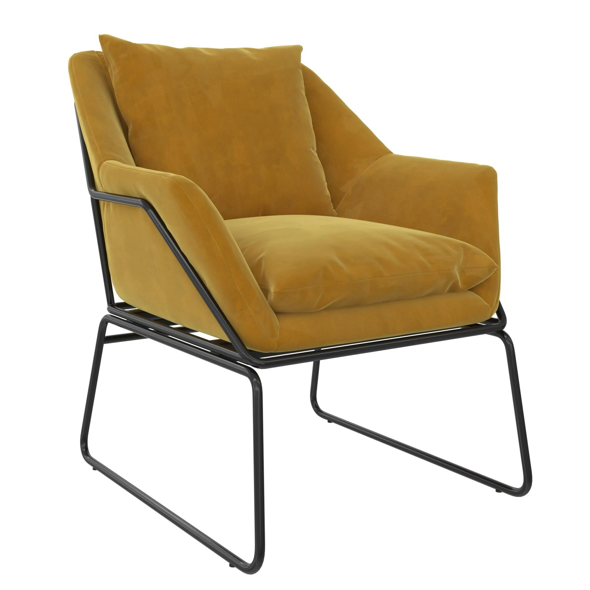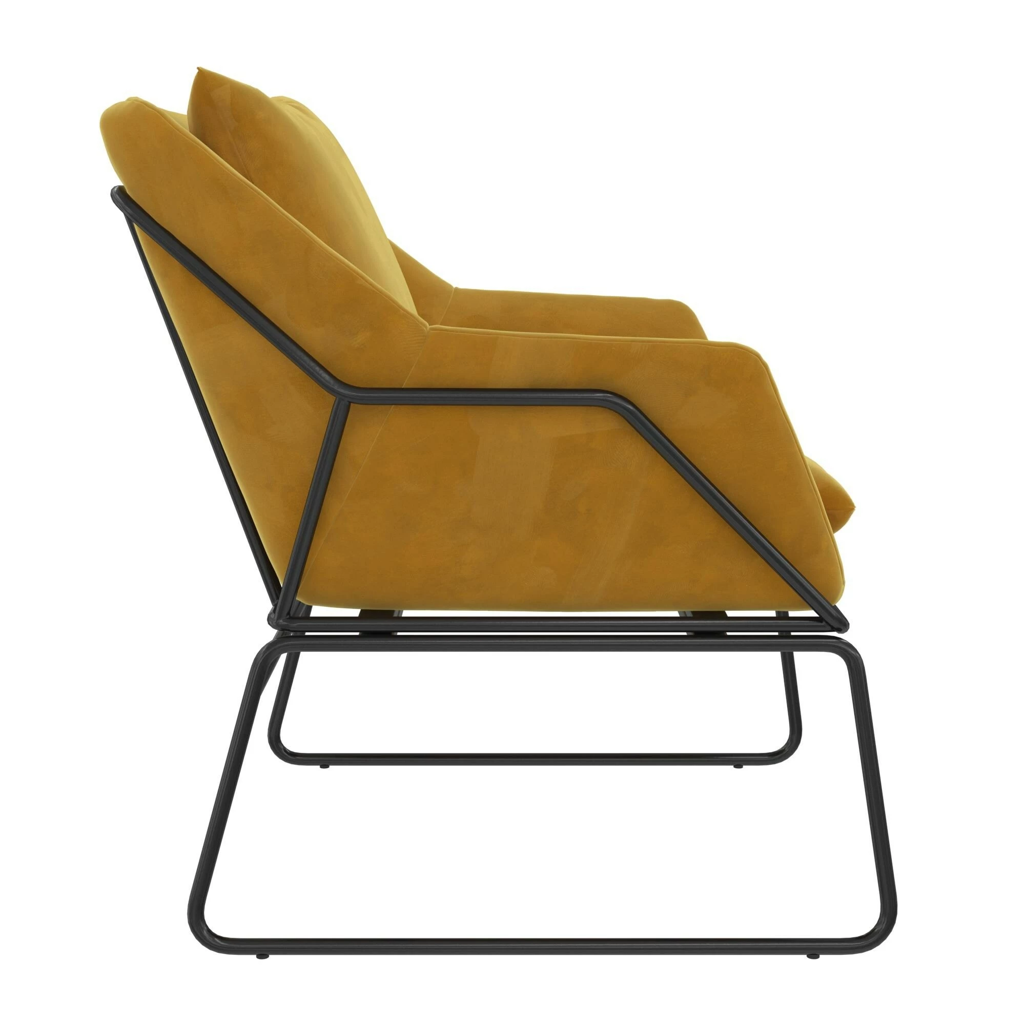 Upholstered in lush velvet, this accent armchair flaunts a striking figure, along with sloped armrests, a robust metal frame, and cushioned seating fit for royalty, all in a sleek black metal and mustard velvet package as gorgeous as it is unique.