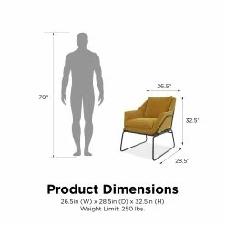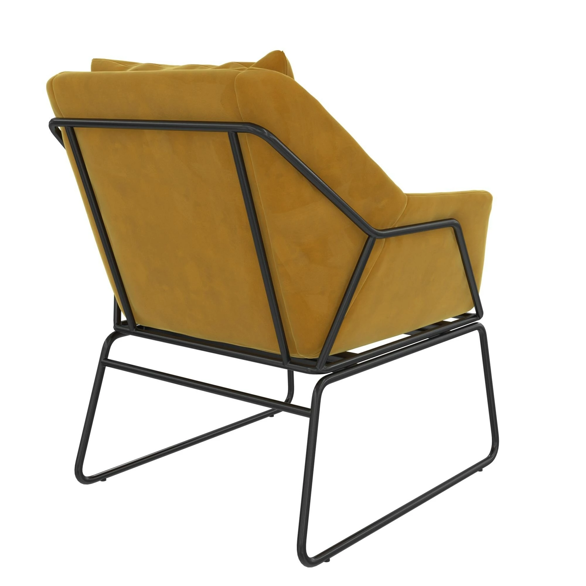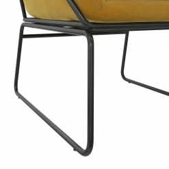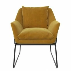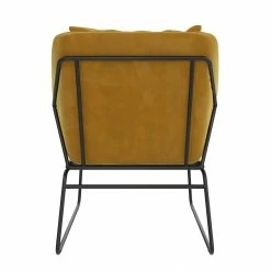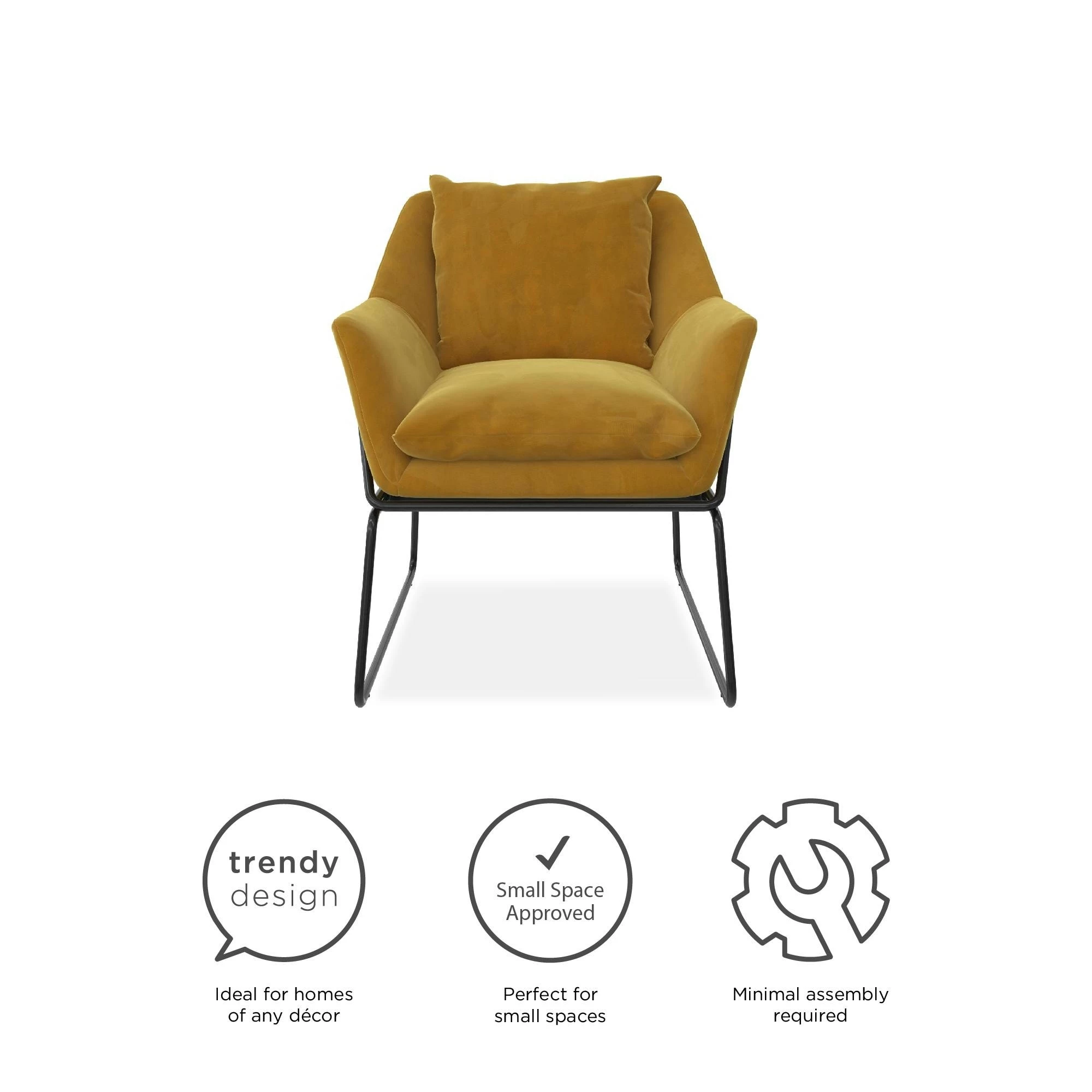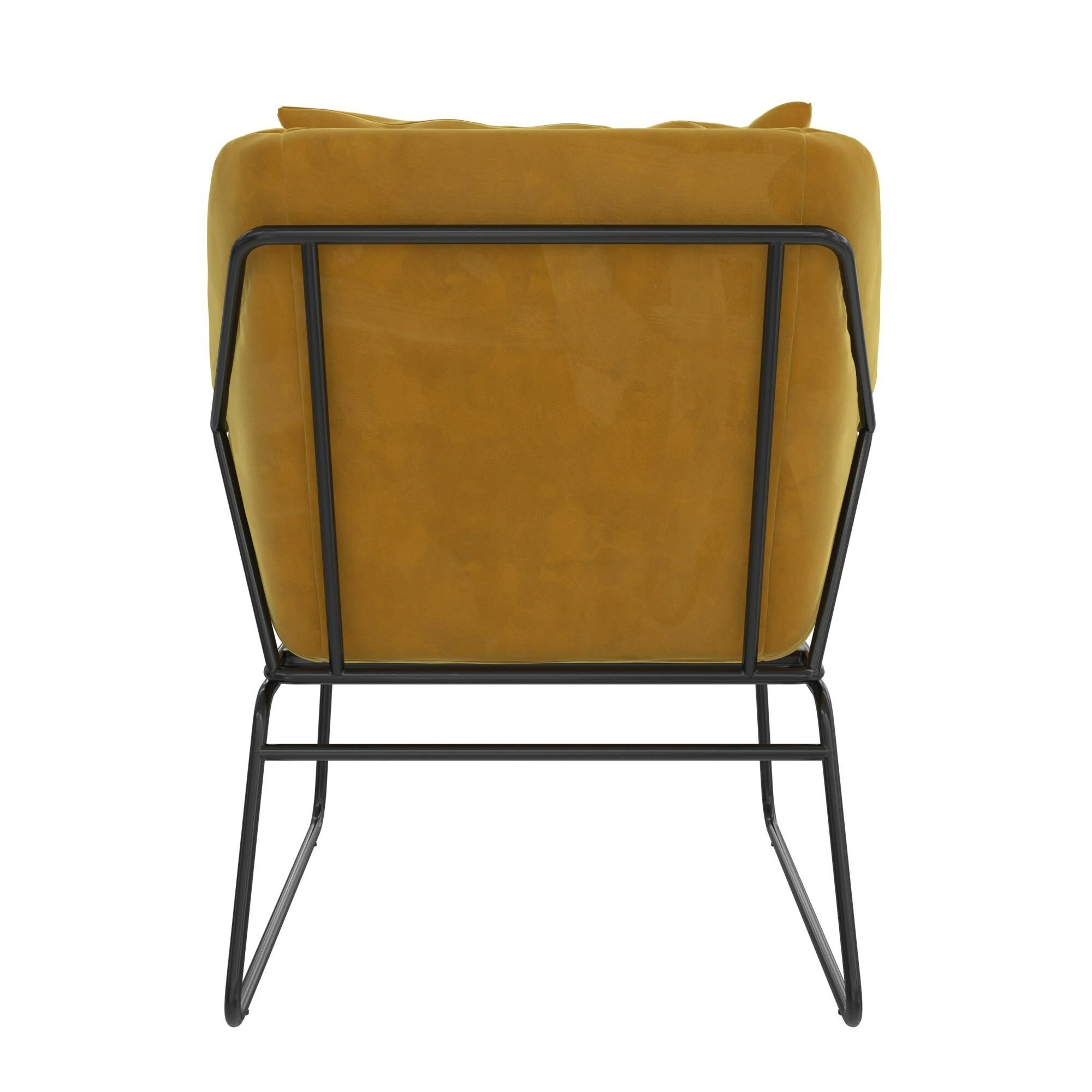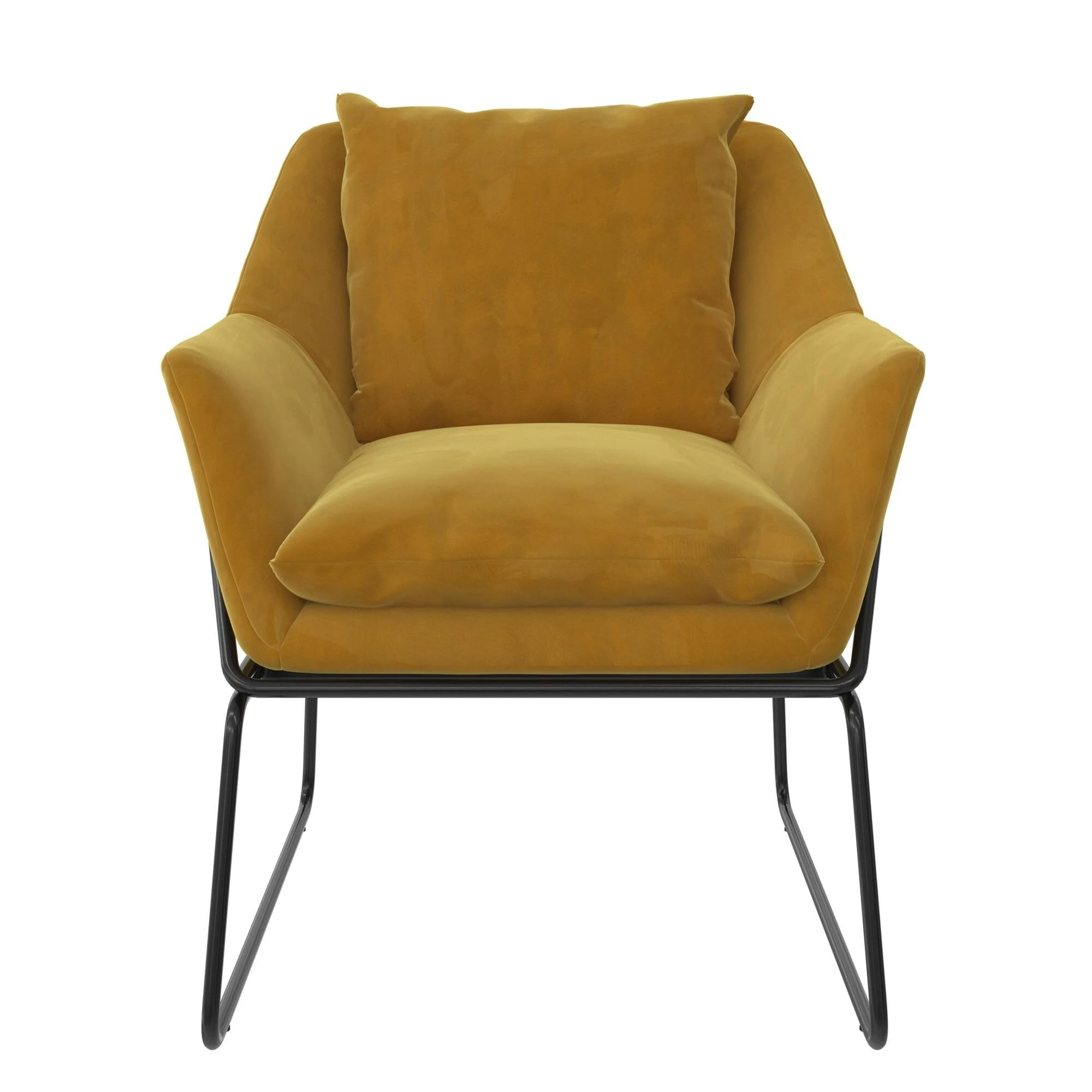 Upholstered in lush velvet, this accent armchair flaunts a striking figure, along with sloped armrests, a robust metal frame, and cushioned seating fit for royalty, all in a sleek black metal and mustard velvet package as gorgeous as it is unique.