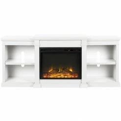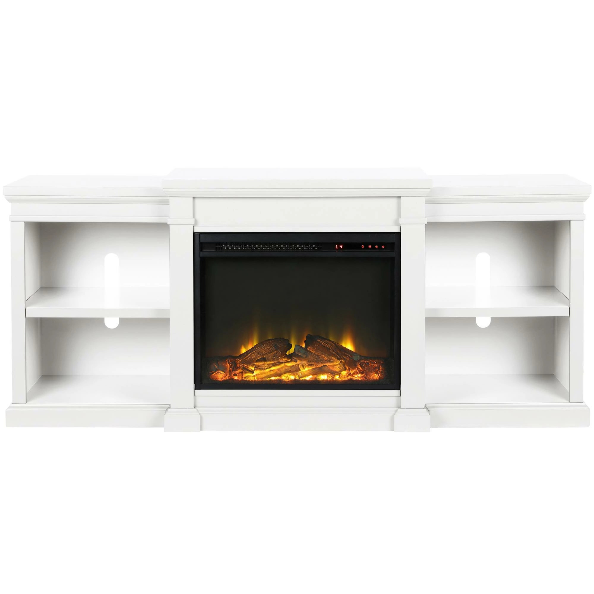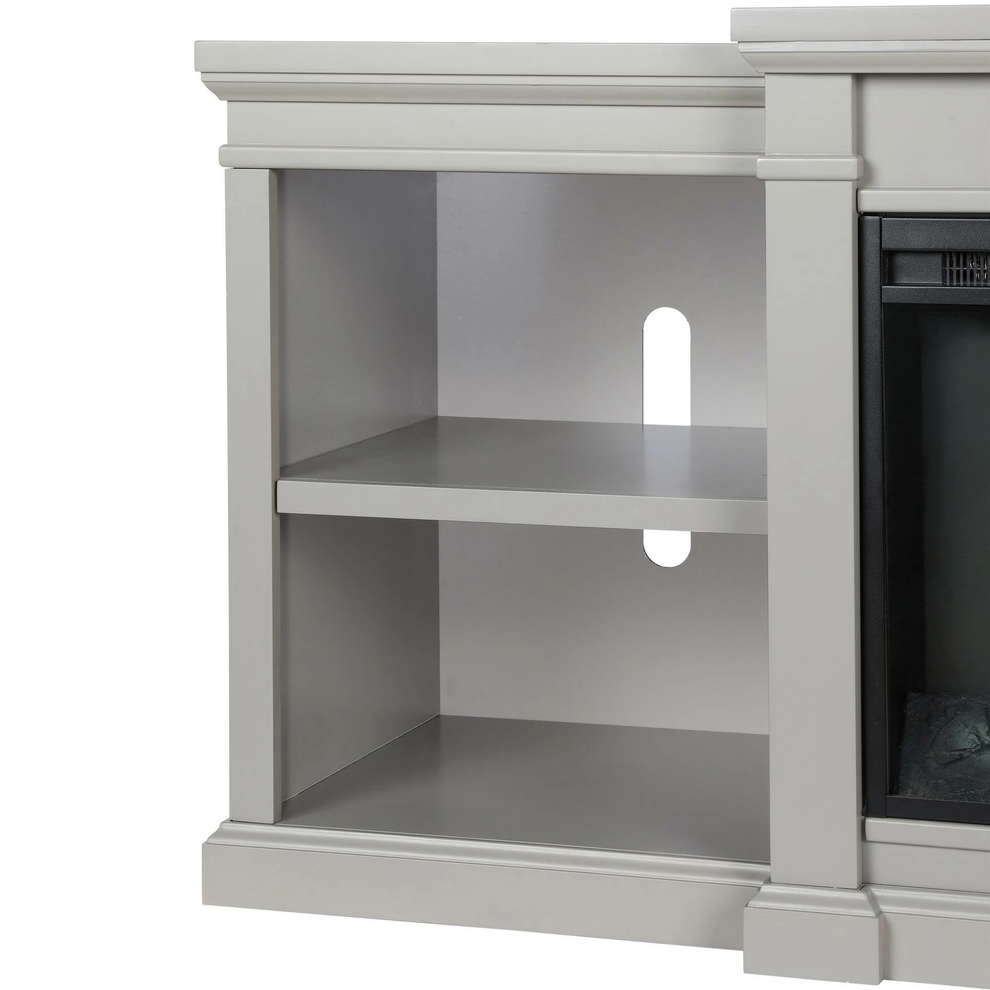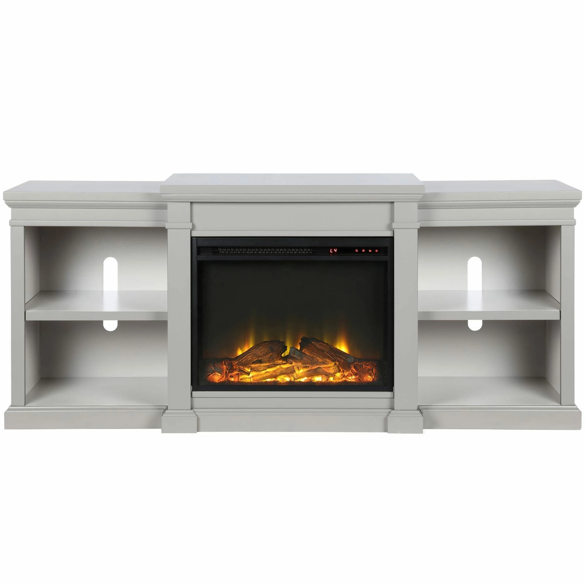 Add this modern Avenue Greene Anderson Fireplace TV Console to your home and create a beautiful focal point in your room. The TV Stand supports flat screen TVs up to 70 inches wide with a maximum weight of 135 pounds. so you can enjoy movies or the big game in style. It’s finished off with detailed moldings and a stair-step effect to give the piece and elegant look to fit your style. The TV Console also has 4 shelves, 2 adjustable, for storing your cable box, gaming systems, books, movies and more. The best feature about this TV Console is the 23 inch electric fireplace insert that can heat up a room up to 400 sq. ft. Or, enjoy the flame feature without the heat for those warmer days. The handy touch panel in the upper corner of the fireplace box allows you to turn the unit off and on, set a timer, change the flame brightness and turn the heater on and off. The included remote also gives you the luxury to adjust these settings from across the room. This Fireplace TV Console is constructed of sturdy MDF and particleboard and laminated in a light grey or white finish with a metal fireplace insert. Two adults are recommended for the proper assembly of this unit.