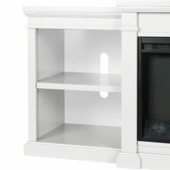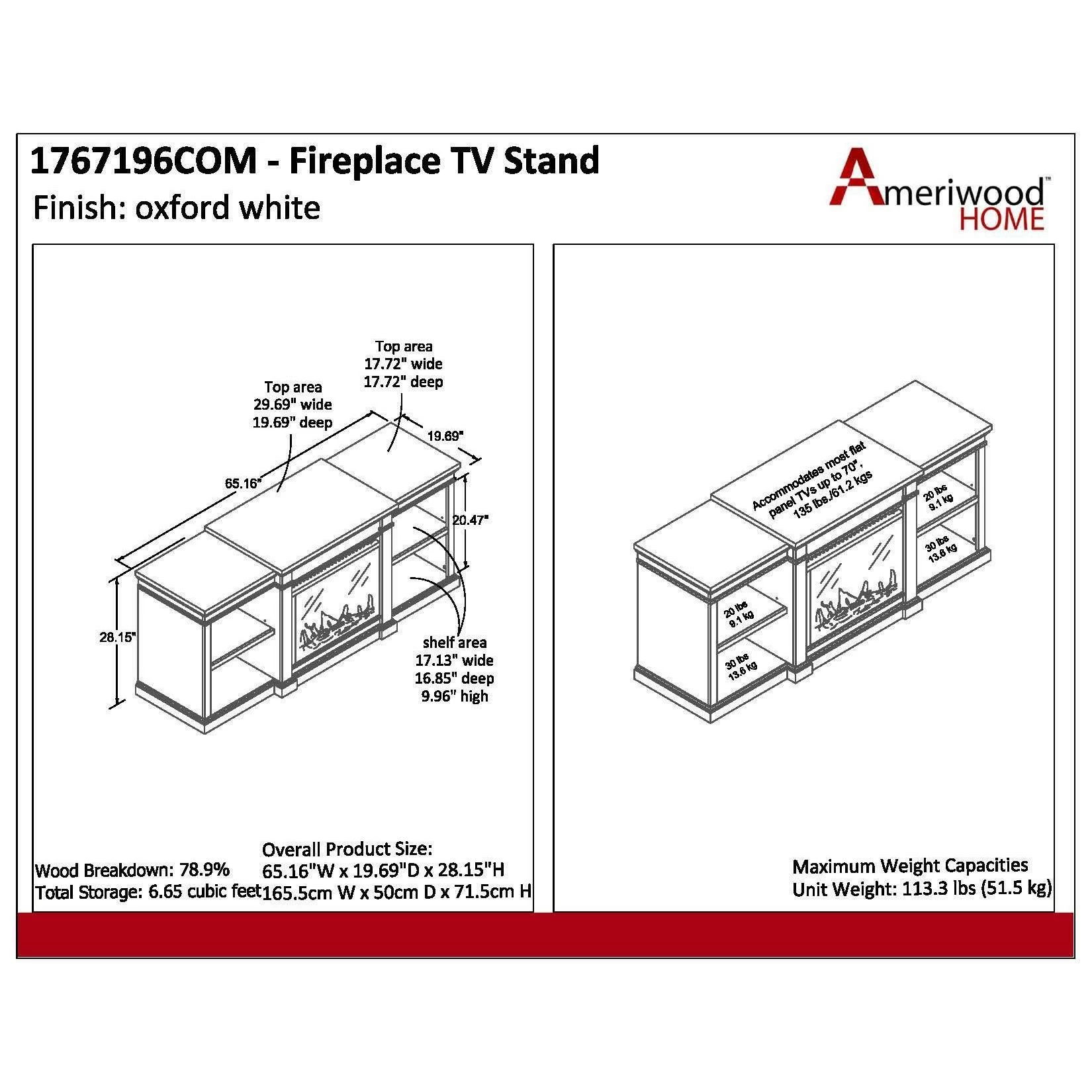 - Each fireplace TV console ships flat to your door and needs to be assembled upon opening. Top surface supports up to 135 pounds. while the 2 adjustable shelves support up to 20 pounds. The 2 fixed shelves support up to 30 pounds.