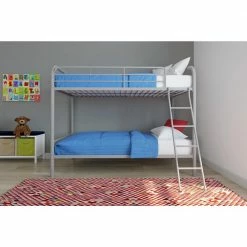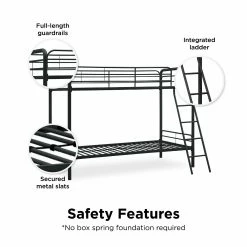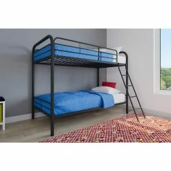 The Edison Twin over Twin Metal Bunk Bed from Avenue Greene is the perfect addition to your childโs room! With space for two Twin size mattresses (sold separately), this bunk bed is the solution for kids sharing a room and for pajama parties. It was designed in sturdy metal with simple, sleek lines and bold colors. It offers top safety with guardrails in the top bunk and a ladder that is attached to the frame. This bunk bed includes as well strong steel slats that offer the right support. Whether you need a space for siblings, family or friends, the Edison Twin over Twin is a top choice.