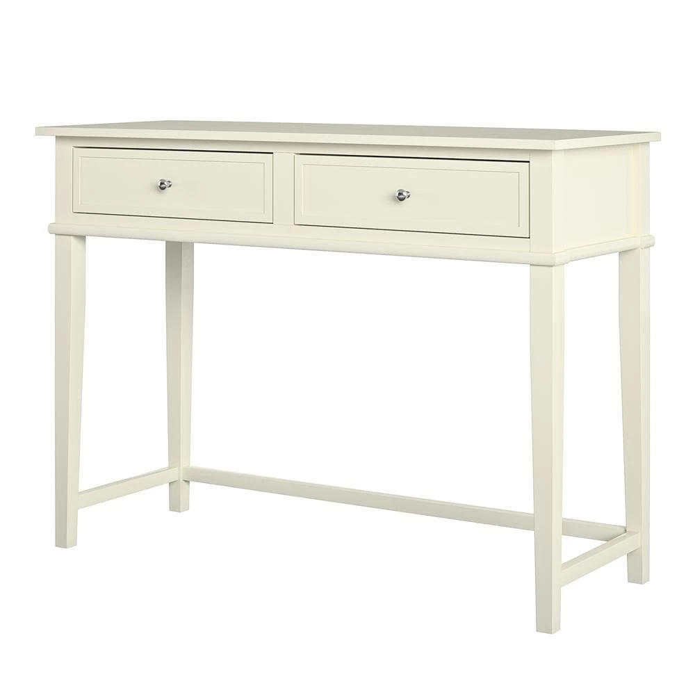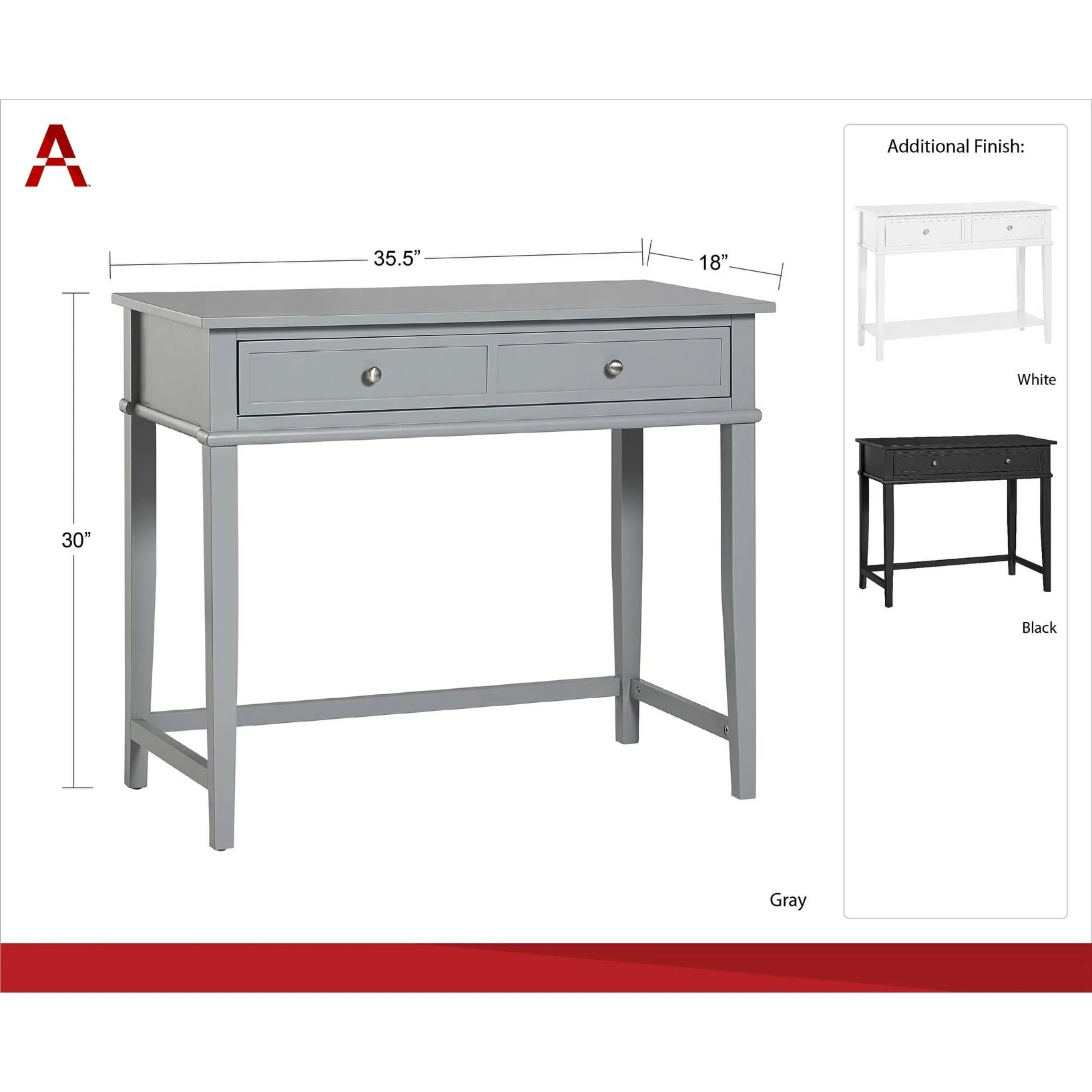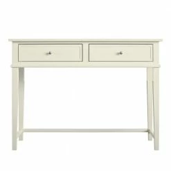Get all the workspace and storage you need to finish paperwork on the Avenue Greene Bantum Writing Desk. This sturdy desk is made of painted MDF and solid wood legs and has a neutral finish to easily add to your existing decor. The decorative molding and tapered legs give this Desk an elegant look for an instant upgrade for your living room or home office. The desktop can accommodate your laptop, notebook, and family photos. The drawer features silver knobs and a double framed front for the look of 2 drawers and is spacious enough to store away your stationary, office supplies, and extra paper. Complete your room with the entire Bantum collection for a coordinated look (each sold separately). The Writing Desk ships flat to your door and requires assembly upon opening. Two adults are recommended to assemble. Once assembled, the Desk measures to be 30″H x 35.5″W x 18″D.
