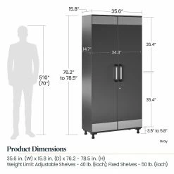 The Avenue Greene Barwood Tall Storage Cabinet is the perfect solution for your cluttered garage, basement or other workspaces. ย Made of durable MDF and laminated particleboard, this sleek charcoal grey Cabinet offers a secure space to store all your tools, including your dangerous items that need to stay out of kids’ hands. The 2 large cabinet doors are lockable, so your tools remain safe. Behind the 2 doors are 4 shelves, 2 of which are adjustable so you can customize your space. ย This must-have storage solution also has heavy-duty metal handles and a matching metal kick plates. The 4 adjustable plastic feet allow you to adapt to uneven floor and keep your Cabinet away from moisture. ย A wall anchor kit is included to secure the Cabinet to the wall and prevent tipping injuries. The Cabinet ships flat to your door and requires assembly upon opening. Two adults are recommended to assemble. Once assembled, the Cabinet measures to be 76.34″H x 35.63″W x 15.75″D.