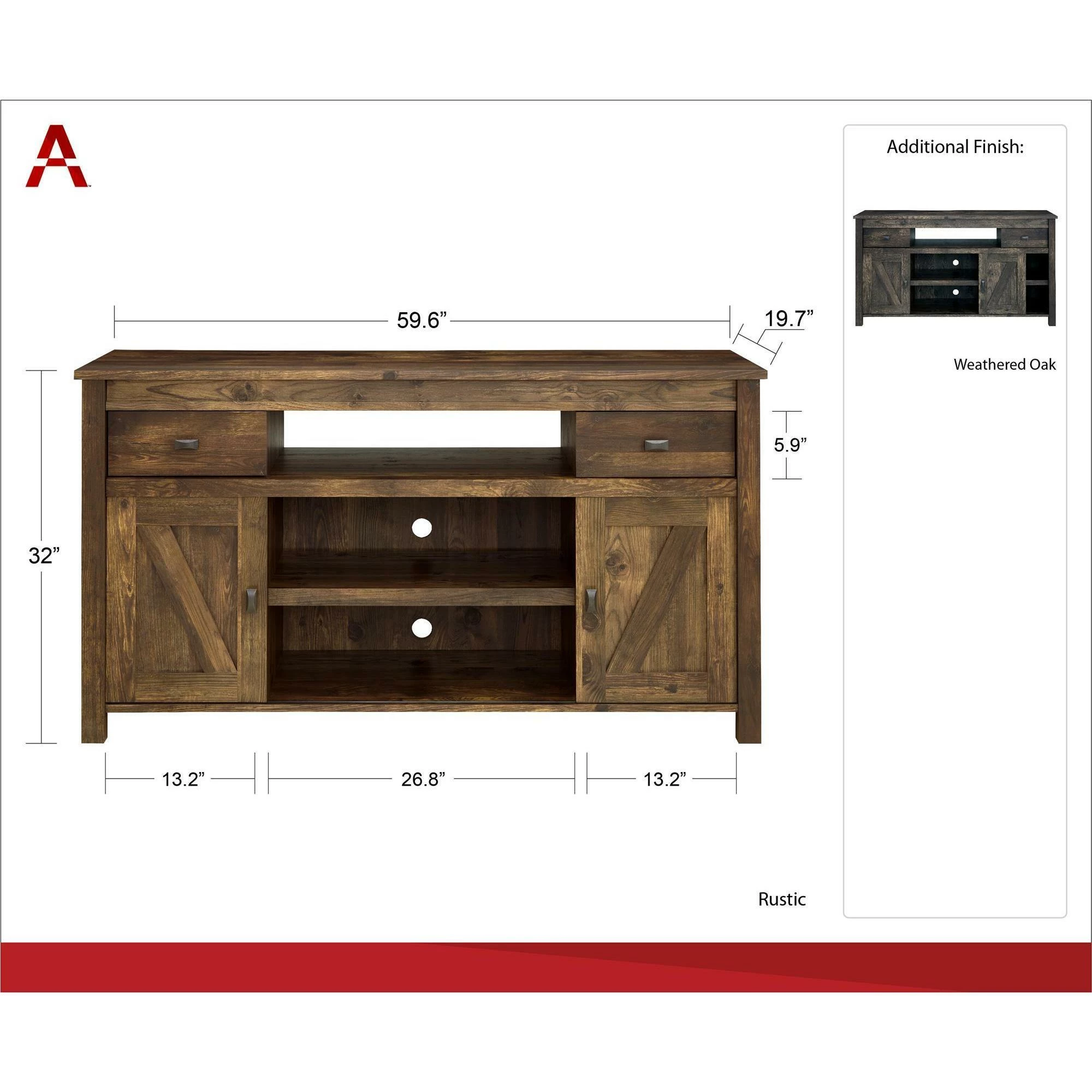 Your guests will love the old rustic look of the Avenue Greene Becken Ridge TV Stand. This TV Stand holds up to a 60 inch flat panel TV with a maximum weight of 135 pounds Inspired by the weathered look of an old barn, this TV stand is full of character and brings a unique style element to your space. Made from laminated MDF and particleboard, the textured rustic finish gives this TV stand its worn appearance and feel, but don?t worry ? this incredible piece of furniture is designed to last. Take advantage of various open compartments and closed storage to keep all of your media essentials like your DVD player, cable box and video game systems organized. The sliding doors can be placed in the center or on the ends ? however you like it best! The Becken Ridge TV Stand comes in 2 boxes, ships flat to your door and requires assembly upon opening. Two adults recommended for assembly. The top shelf holds up to 135 pounds and each shelf and drawer below can hold up to 25 pounds. After assembly, the TV Stand measures to be 32 inches high x 59.61 inches wide x 19.69 inches deep.