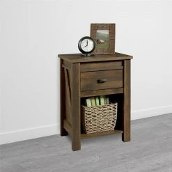 Bring a little rustic charm to your space with this nightstand. Inspired by the farmhouse style, this rustic nightstand resembles a wooden barn door and adds a unique touch to your space. The textured weathered medium brown finish has an old reclaimed wood appearance that has been further enhanced with an oil rubbed bronze pull.