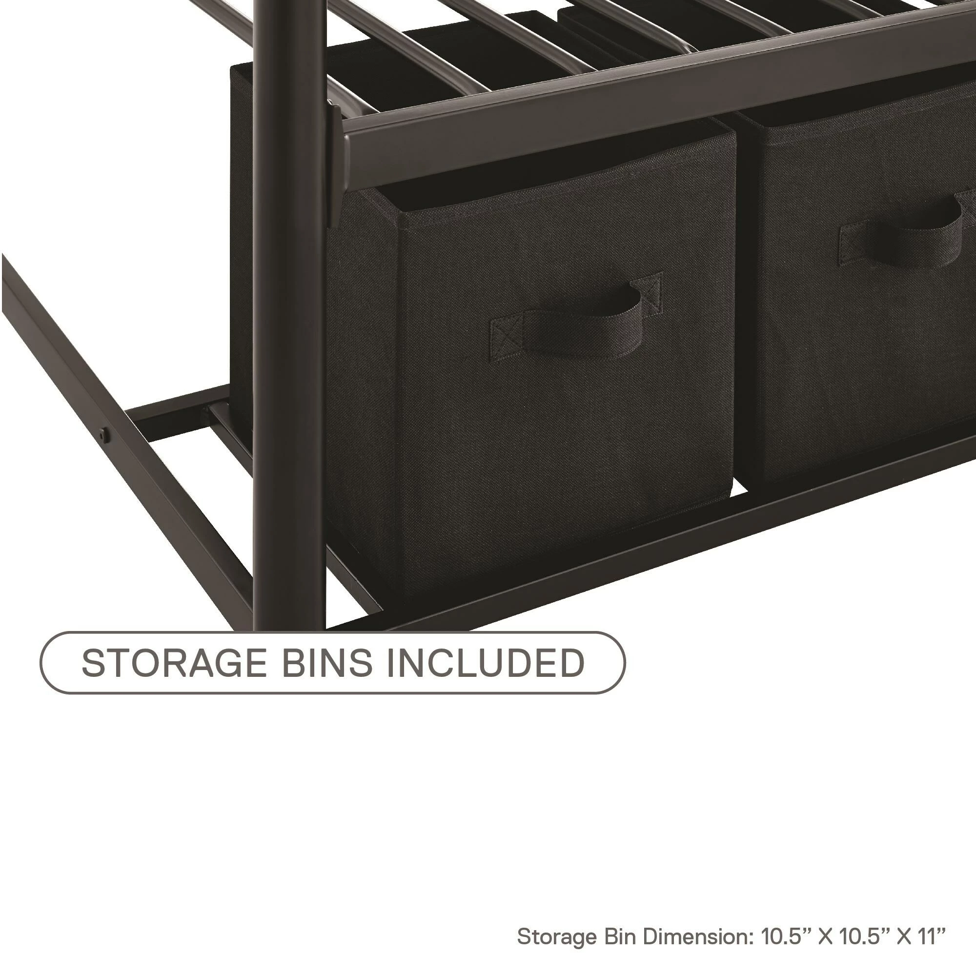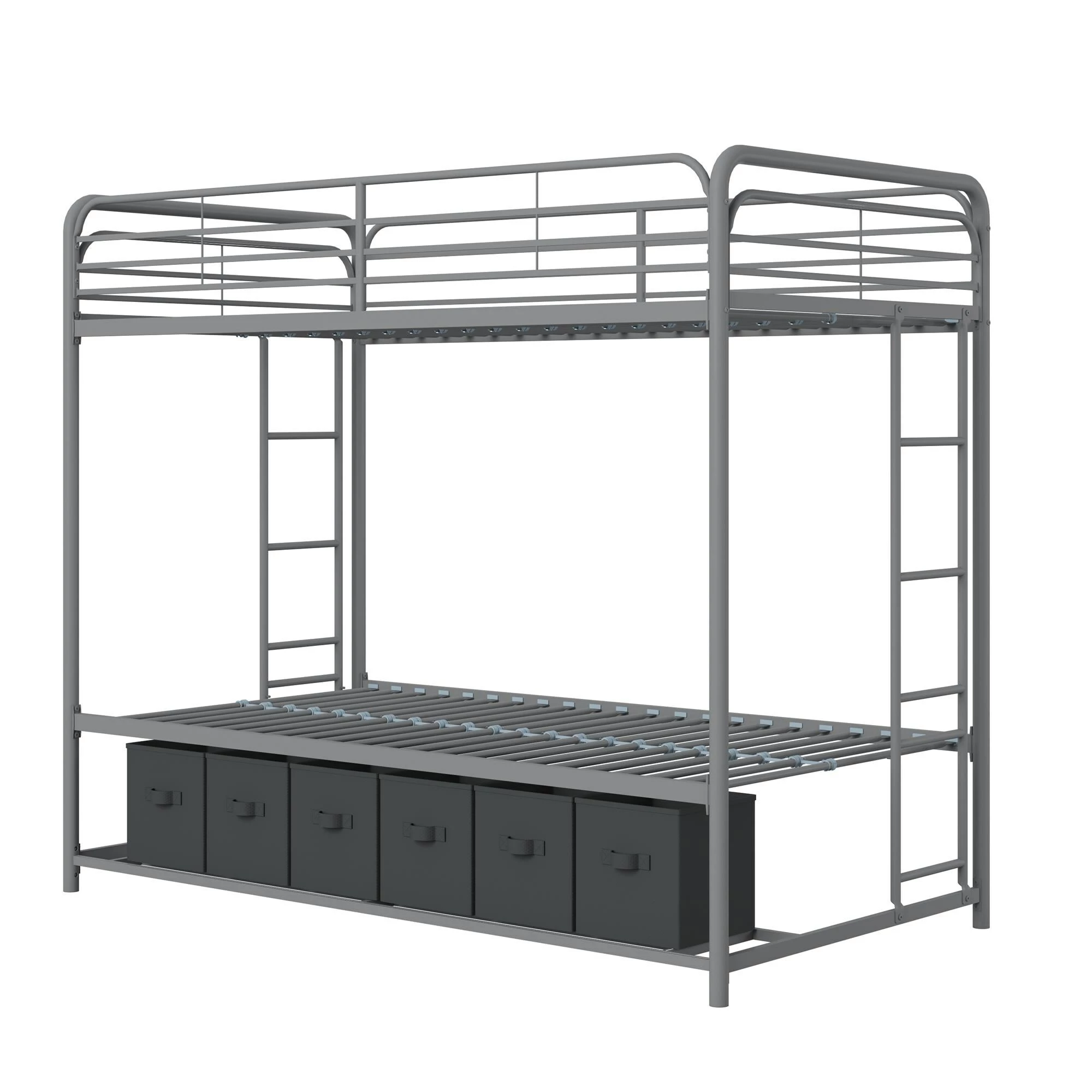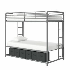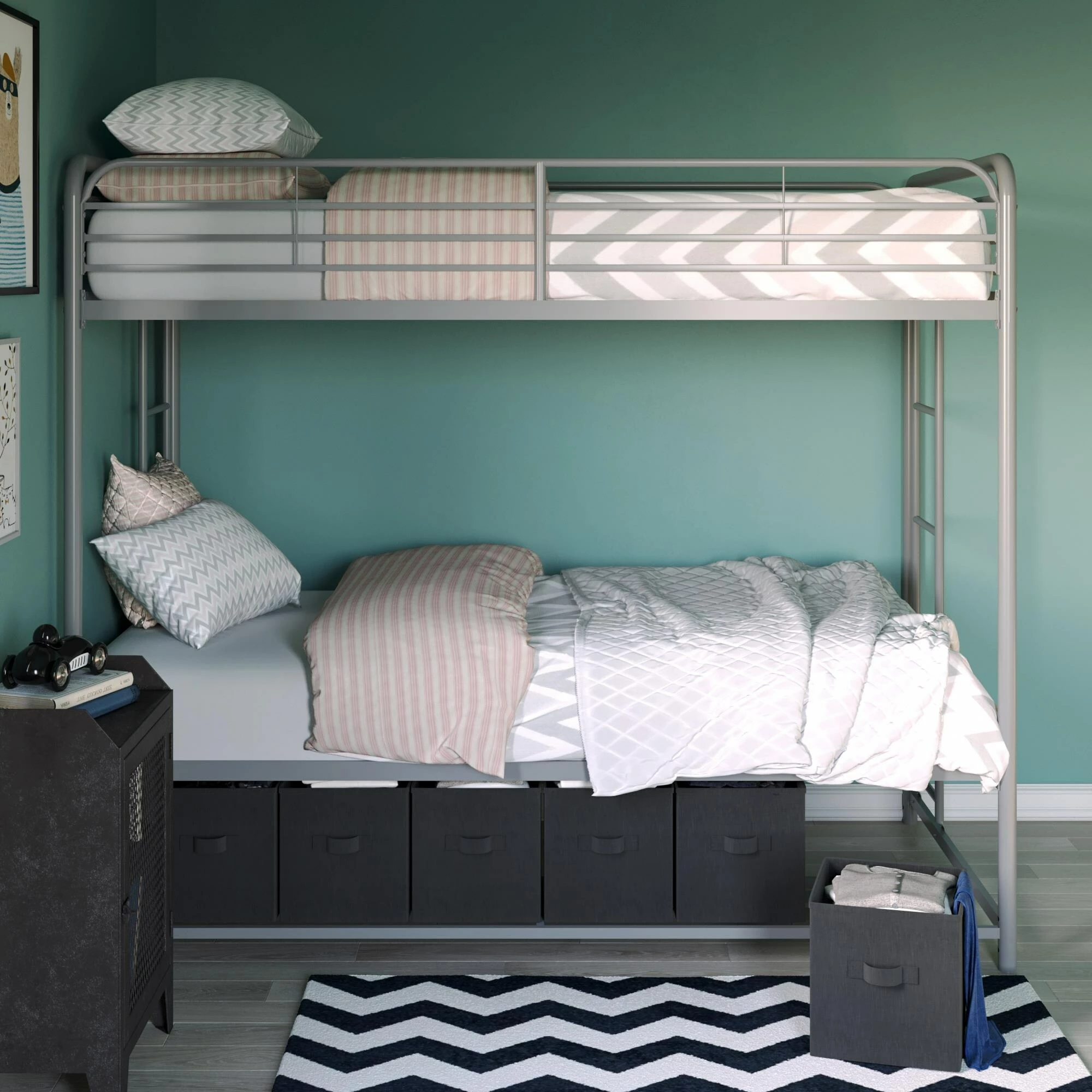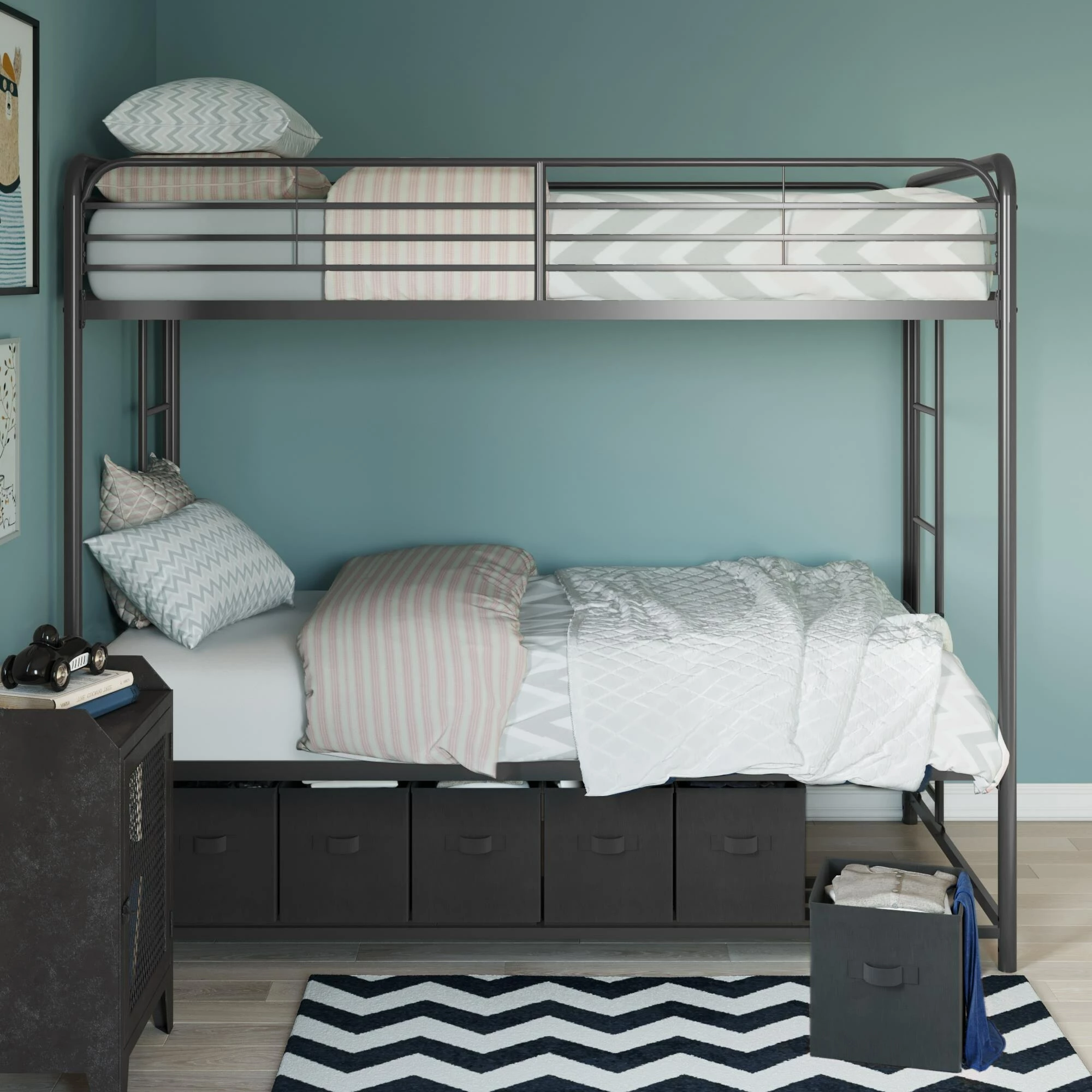 - Sturdy metal frame construction will last for years to come. Includes 6 storage bins beneath bottom bunk making ideal for neatly tucking away books and toys.