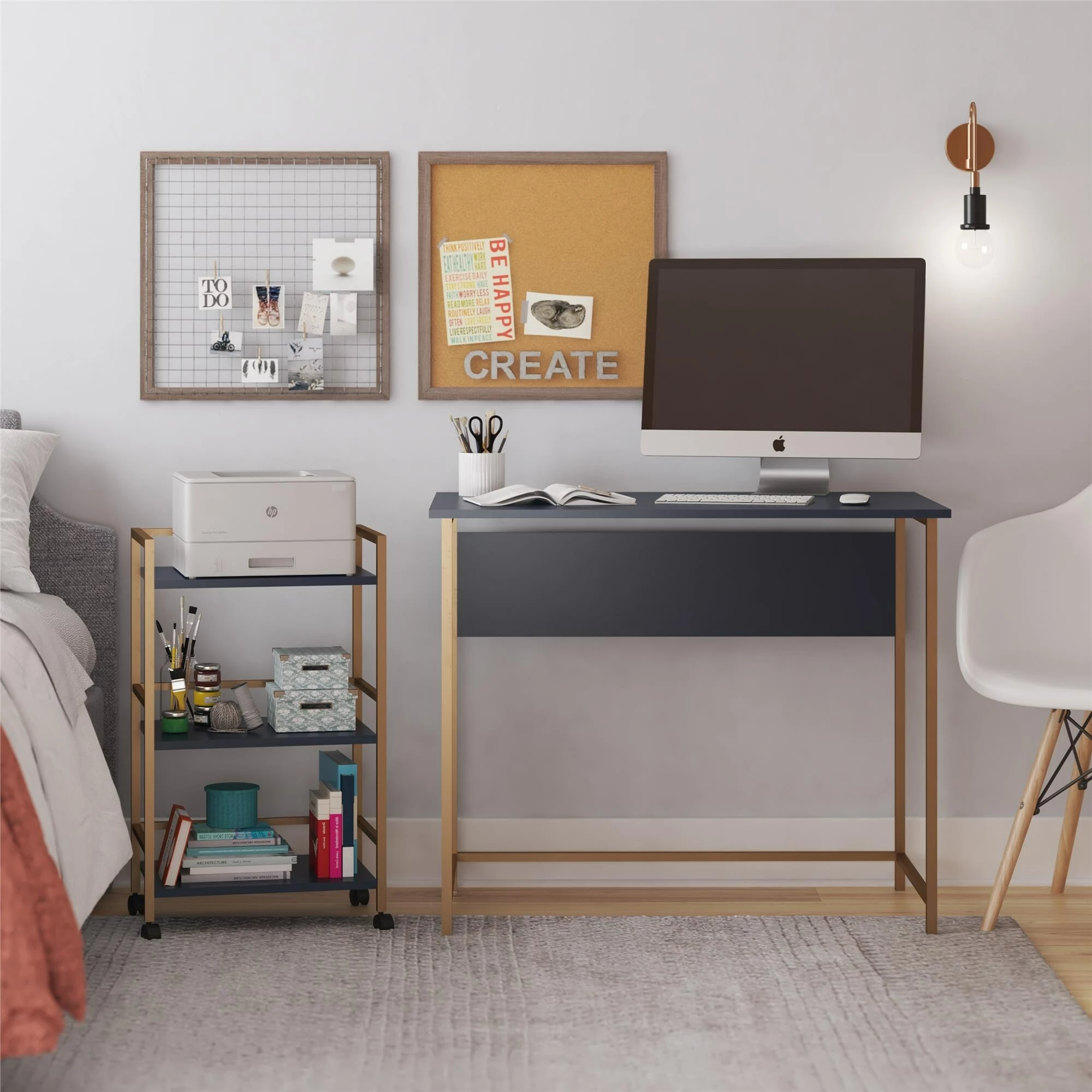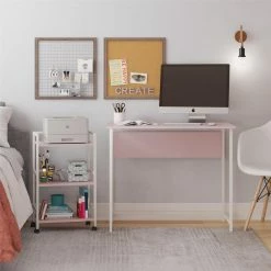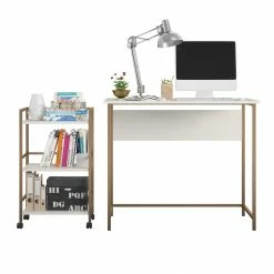 Work from home, pay bills, or study for the big exam at the Avenue Greene Broxton Desk with Rolling Cart. Β Perfect for smaller spaces, the Broxton Desk and rolling cart allows you to keep everything you need within reach while keeping your desktop clutter free. Β Store writing utensils, notebooks or files off to the side while at the desk, then roll them all away at the end of the day to tuck them discretely in a closet or out of sight. Β The modesty panel across the back of the desk allows for flexible room placement, not confining you to just the wall. Β The Broxton Desk is made of engineered wood and a metal frame and ships flat to your door in one box. Β Assembly required. Β Assembled desk measurements: 36″ W x 20″ D x 29.92″ H Β Assembled cart measurements: 16.8″ W x 11.42″ D x 28.1″ H Β Product assembled weight: 40.24 lbs.