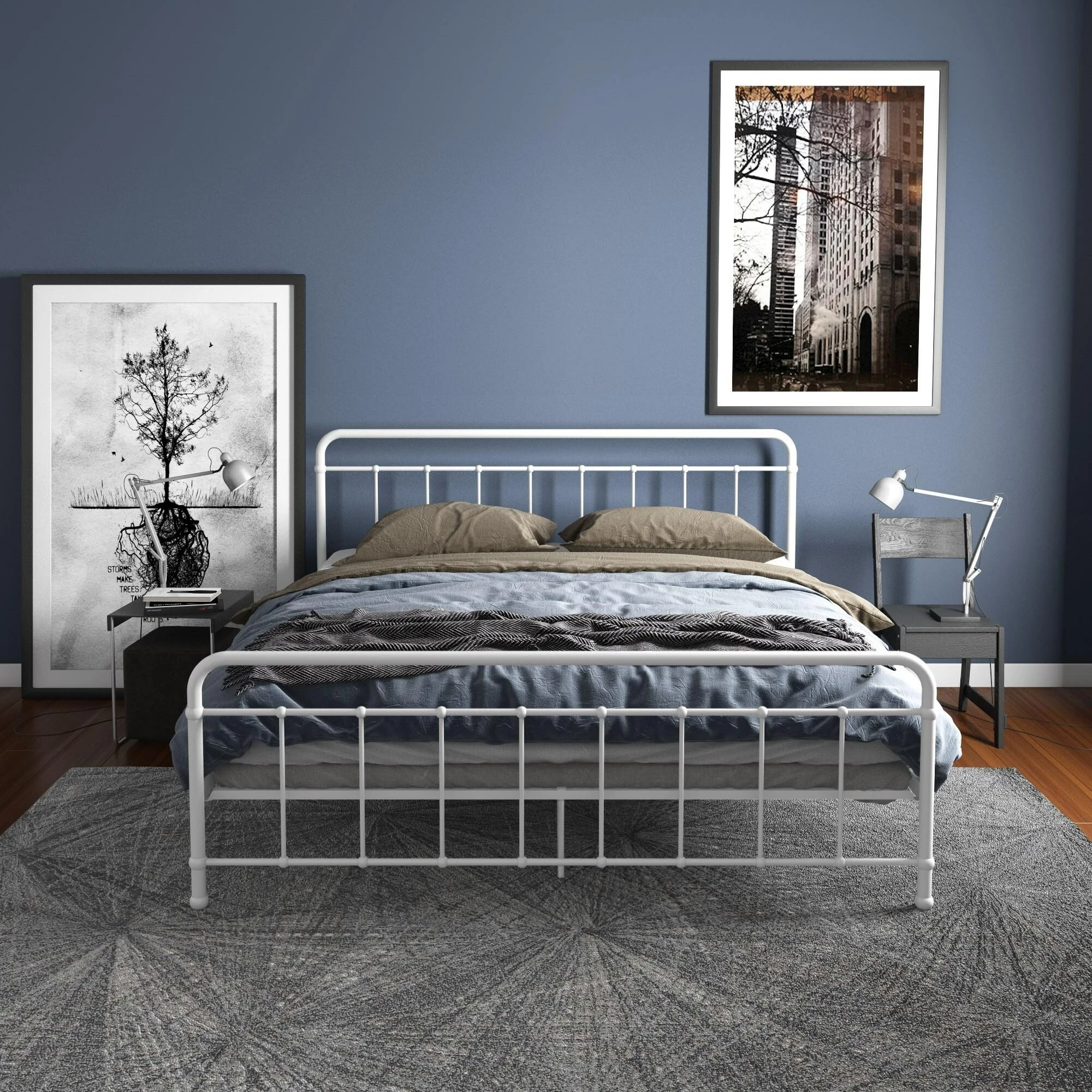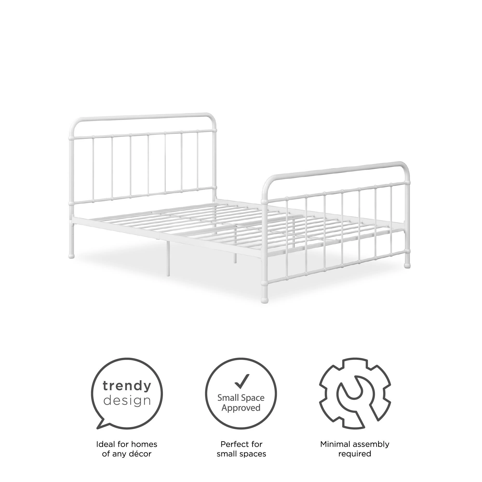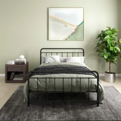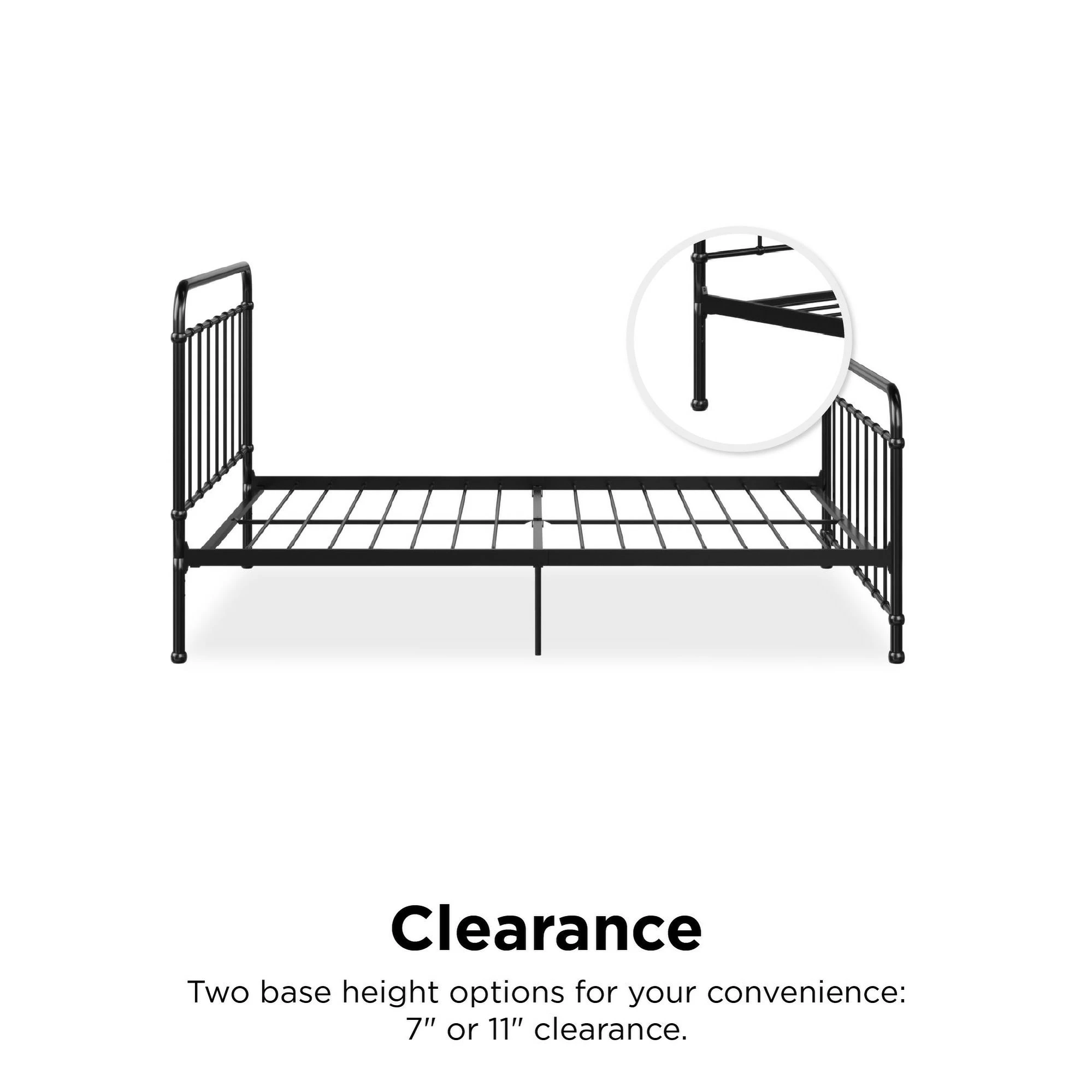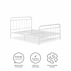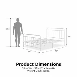 Simplicity is key with our Avenue Greene Bryn Metal Bed. Its timeless elegance and bed frame gives off a calming and contemporary feel that is perfect to complement any sized bedroom. Carefully designed with a metal frame, side rails and supporting legs, we guarantee you long lasting support and durability. Benefit from added support for both the bed and mattress thanks to its secured metal slats. Choose from two base heights: either a 7 or 11 inch clearance, to enjoy extra space right under your bed. Practical additional storage space – because let’s face it, you could never have enough! Available in white and black in all Twin, Full, Queen and King sizes. Ships in one box for easy handling and assembles effortlessly. Our Avenue Greene Bryn Metal Bed will make your sleeping experience blissful.