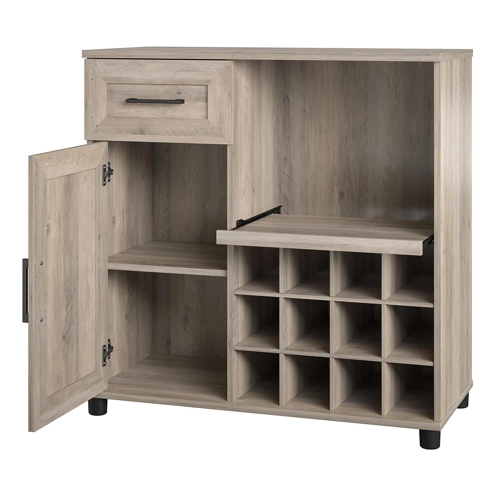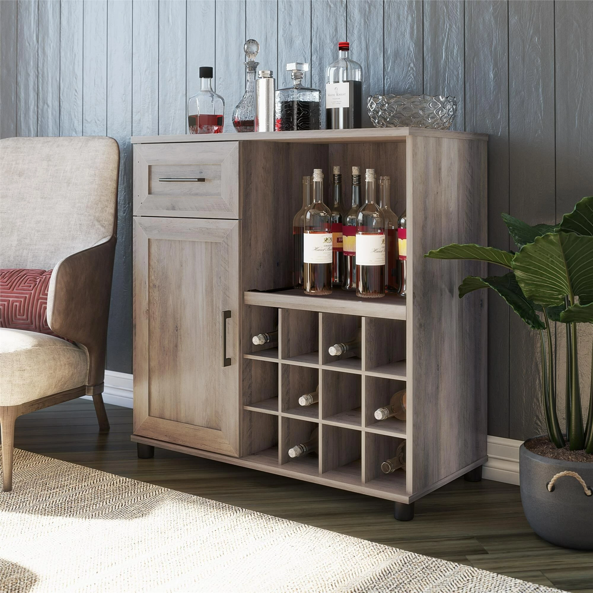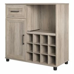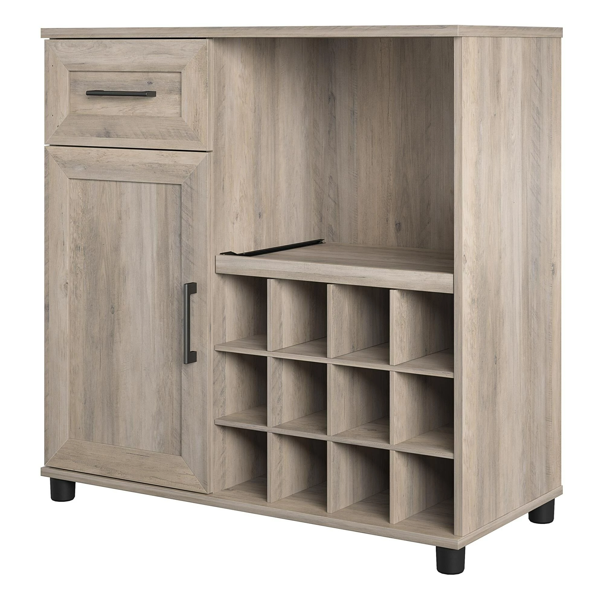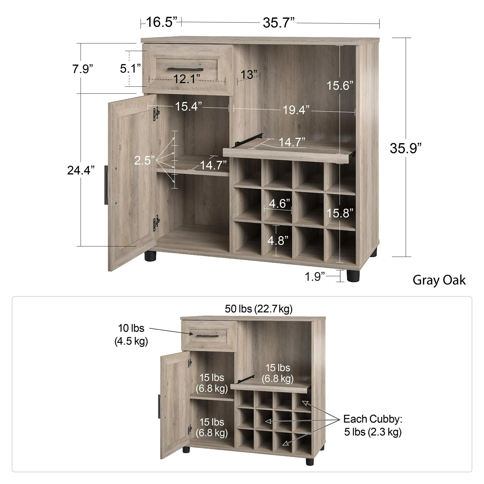 Be the host with the most with the Avenue Greene Derzig Bar Cabinet. ย The beautiful grey oak finish pairs with black modern farmhouse hardware to create a warm and inviting rustic look. ย The top surface is ideal for setting out snacks or serving cocktails, and the generous open cubby below boasts of storage for tall bottles, decanters, and glasses. ย It’s the small things that count, so of course a nice spacious drawer is a must have for spoons, bottle openers, napkins, corkscrews and the like. ย Let’s not forget, built in to the Derzig Bar Cabinet are 12 bottle cubbies, perfect for organizing your wine and liquor collection while the 2 shelves ( 1 fixed, 1 adjustable) behind the lower door offer storage for tumblers, shakers, and stemware. ย Got a tall blender or margarita mixer you need to tuck away when not in use? ย Adjust or remove the adjustable shelf to fit your storage needs, and easily store tall items out of sight for clutter free kitchen counters. ย Complete the look with the entire Derzig Collection (each sold separately). ย The Bar Cabinet ships flat to your door and requires assembly upon opening. Two adults are recommended to assemble. Once assembled, the Bar Cabinet measures to be 35.67″ W x 16.54″ D x 35.98″ H.