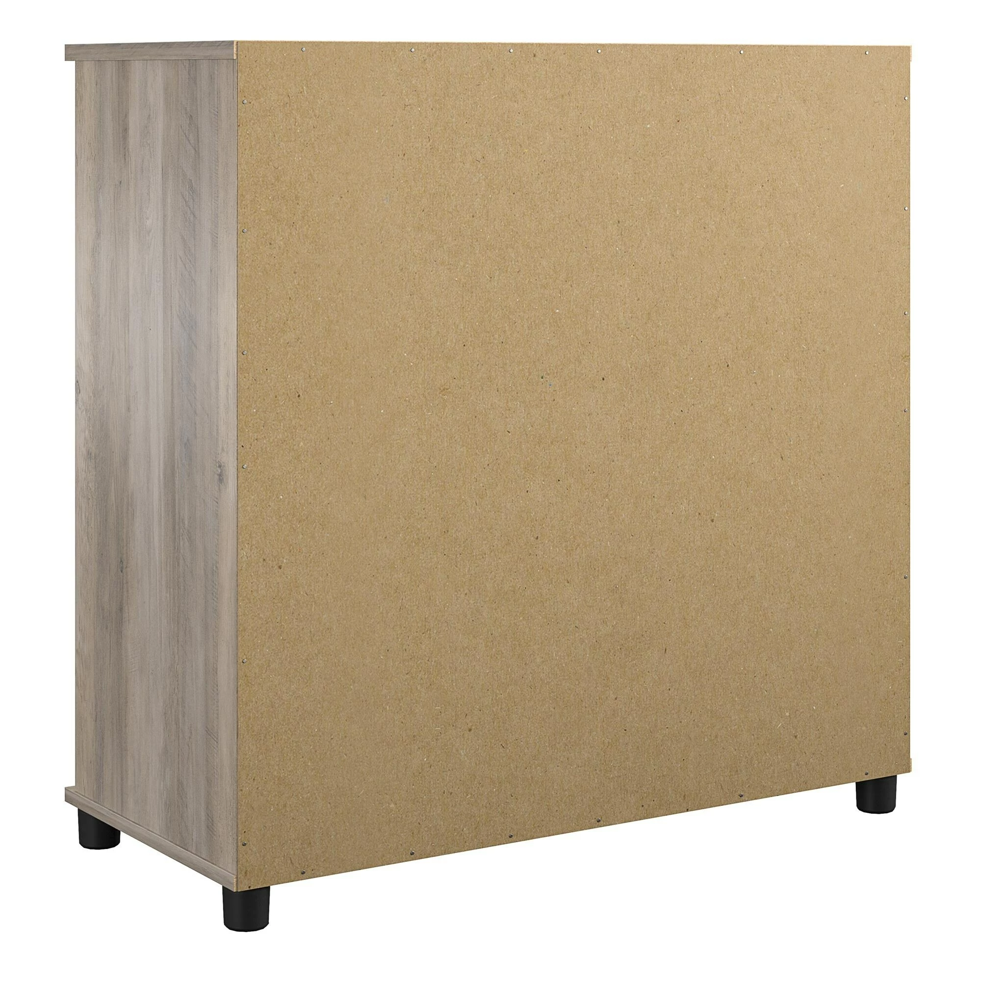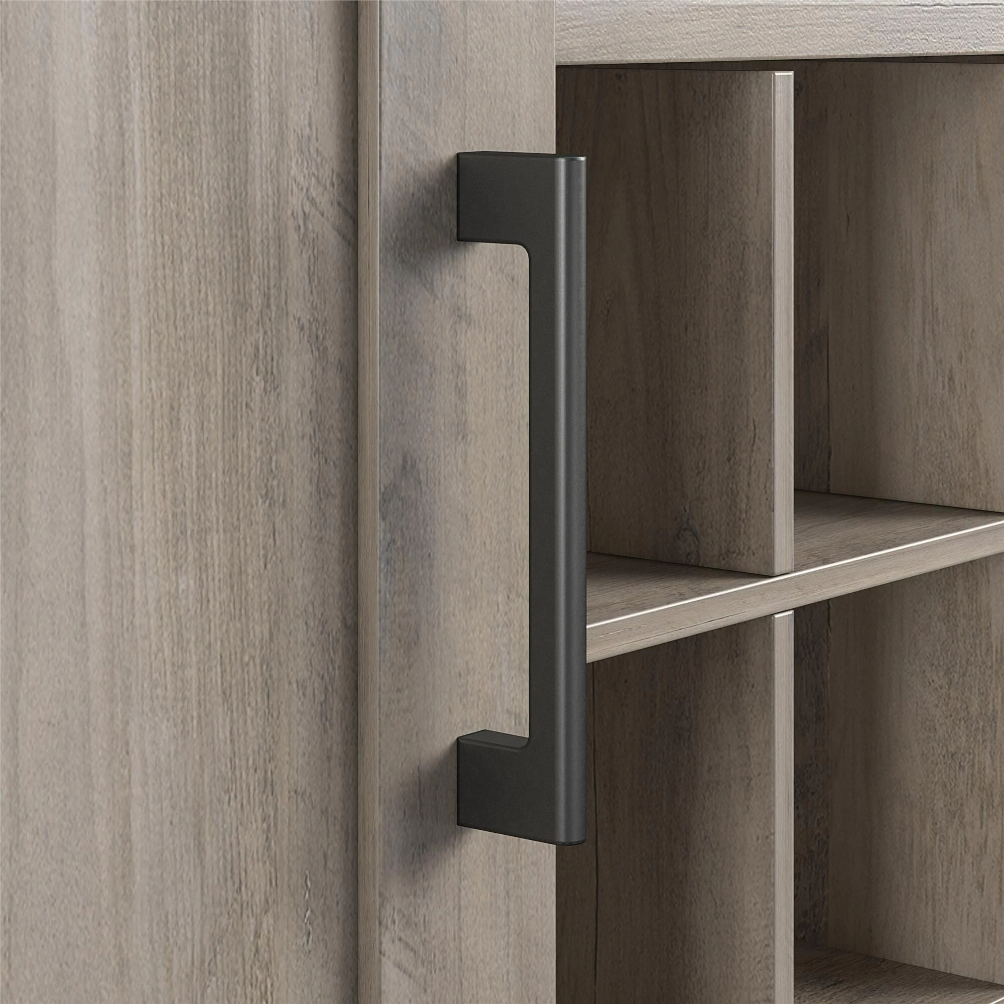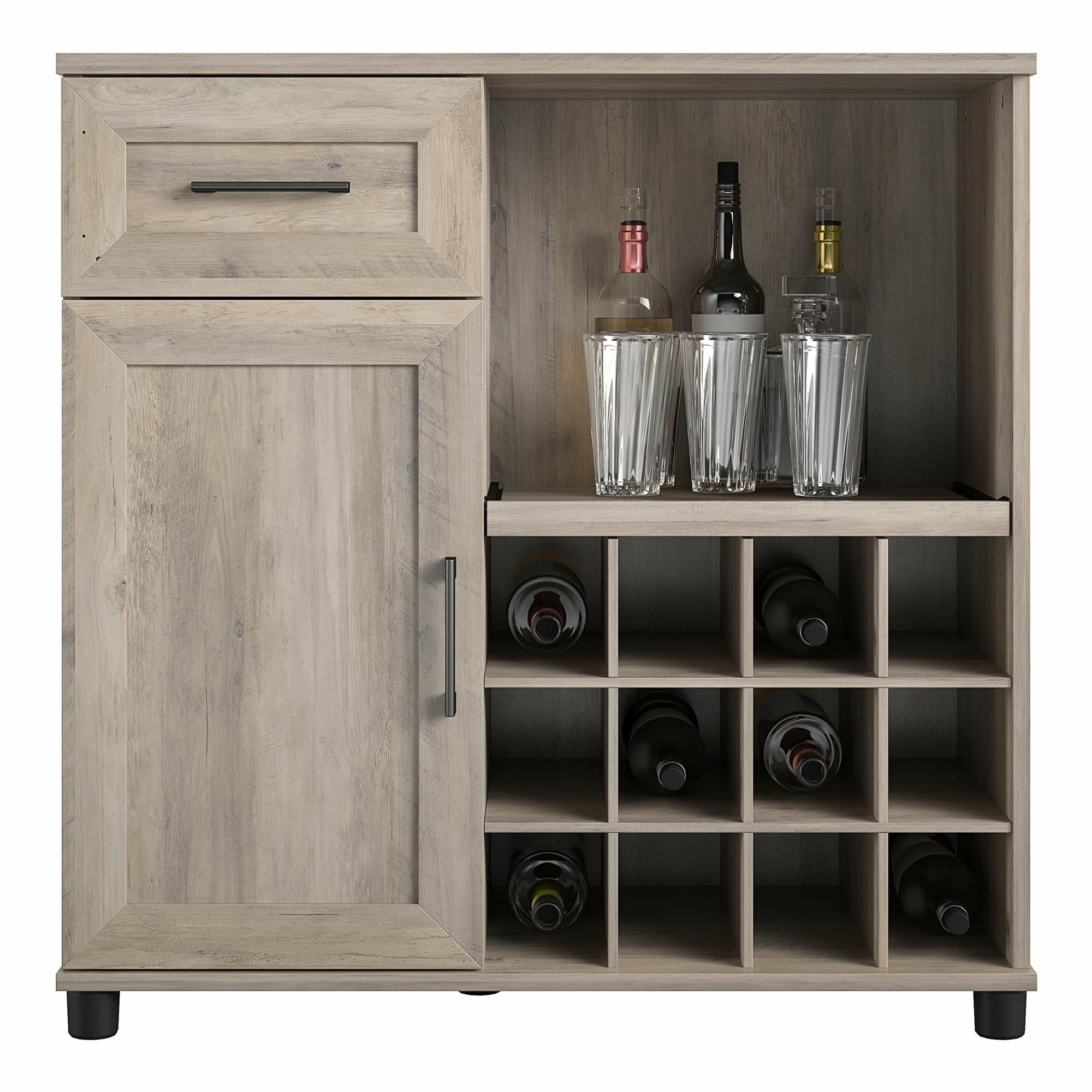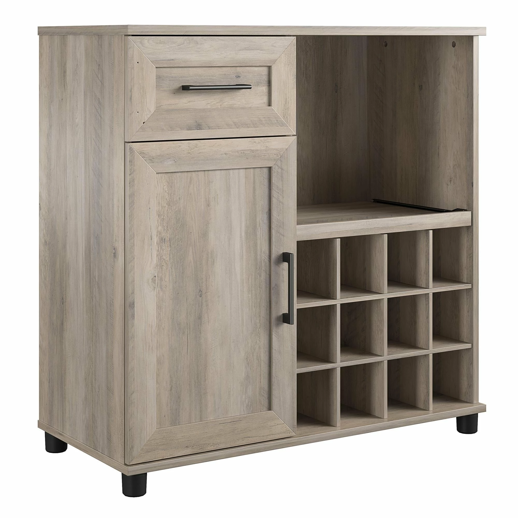 Be the host with the most with the Avenue Greene Derzig Bar Cabinet. ย The beautiful grey oak finish pairs with black modern farmhouse hardware to create a warm and inviting rustic look. ย The top surface is ideal for setting out snacks or serving cocktails, and the generous open cubby below boasts of storage for tall bottles, decanters, and glasses. ย It’s the small things that count, so of course a nice spacious drawer is a must have for spoons, bottle openers, napkins, corkscrews and the like. ย Let’s not forget, built in to the Derzig Bar Cabinet are 12 bottle cubbies, perfect for organizing your wine and liquor collection while the 2 shelves ( 1 fixed, 1 adjustable) behind the lower door offer storage for tumblers, shakers, and stemware. ย Got a tall blender or margarita mixer you need to tuck away when not in use? ย Adjust or remove the adjustable shelf to fit your storage needs, and easily store tall items out of sight for clutter free kitchen counters. ย Complete the look with the entire Derzig Collection (each sold separately). ย The Bar Cabinet ships flat to your door and requires assembly upon opening. Two adults are recommended to assemble. Once assembled, the Bar Cabinet measures to be 35.67″ W x 16.54″ D x 35.98″ H.