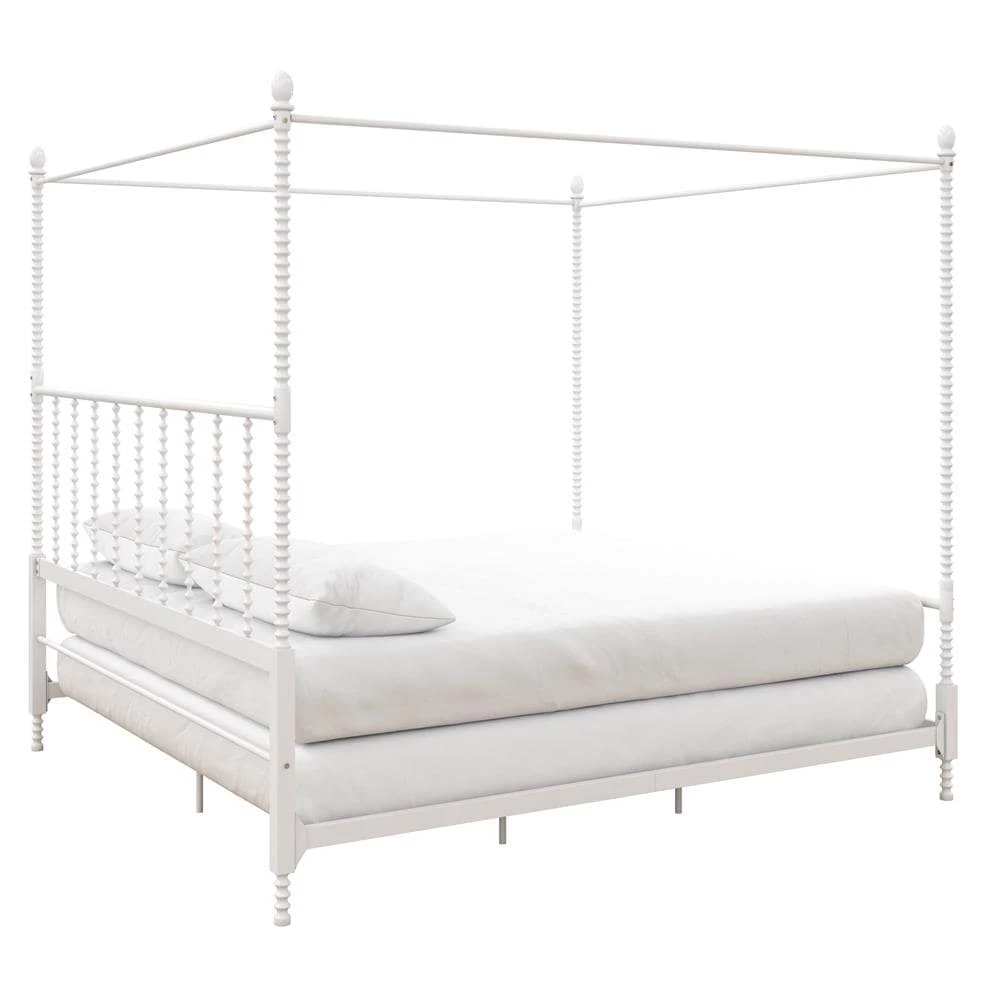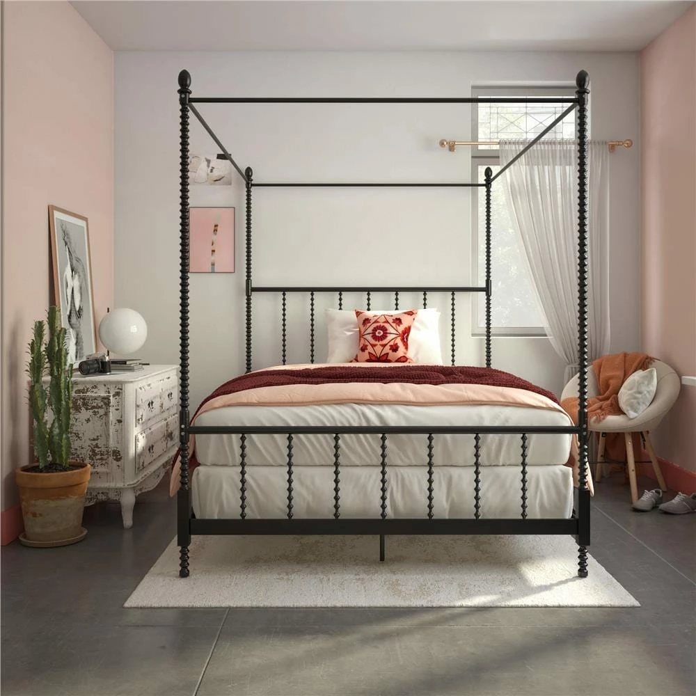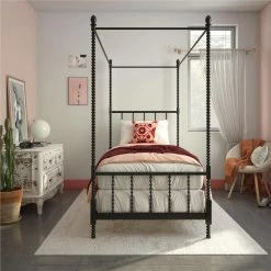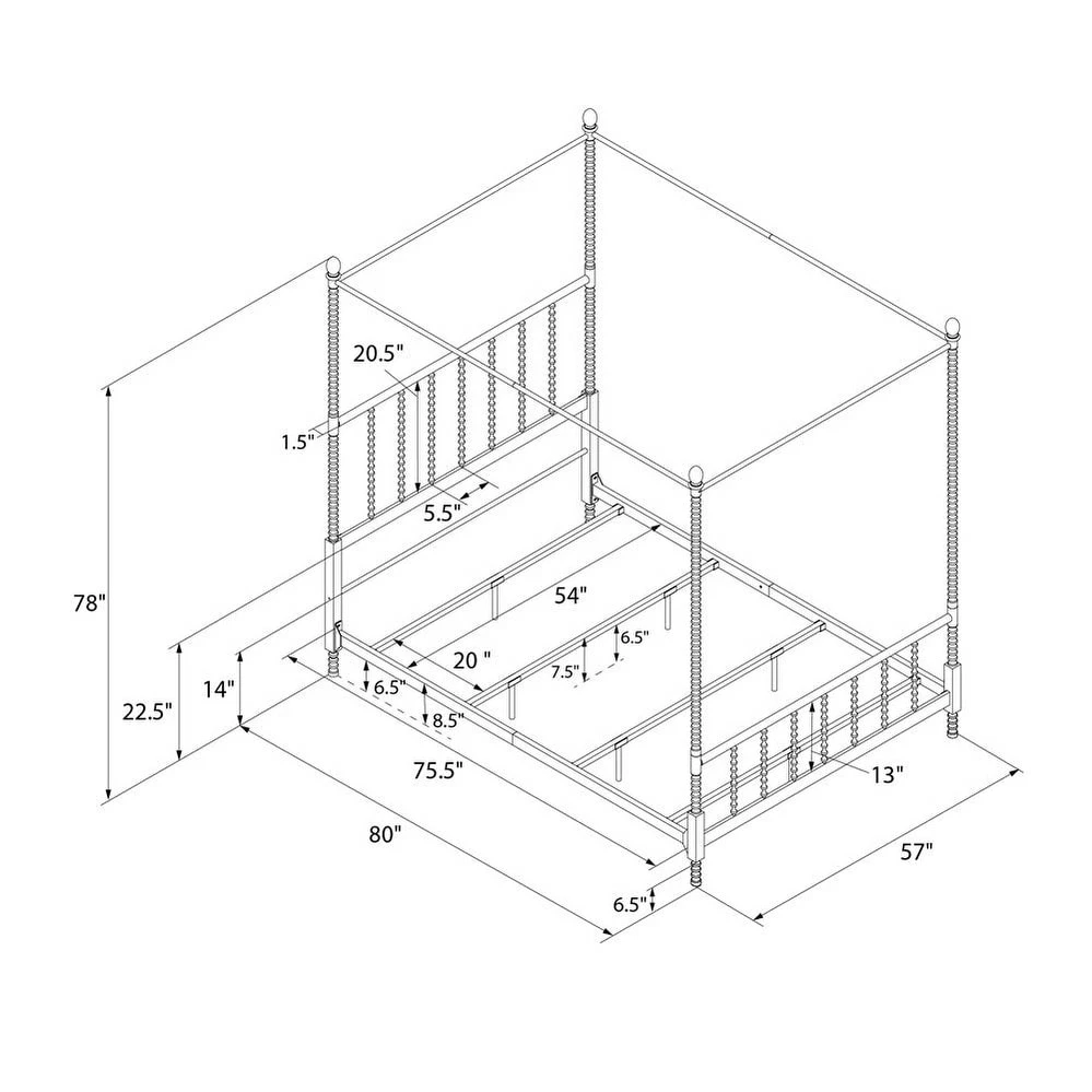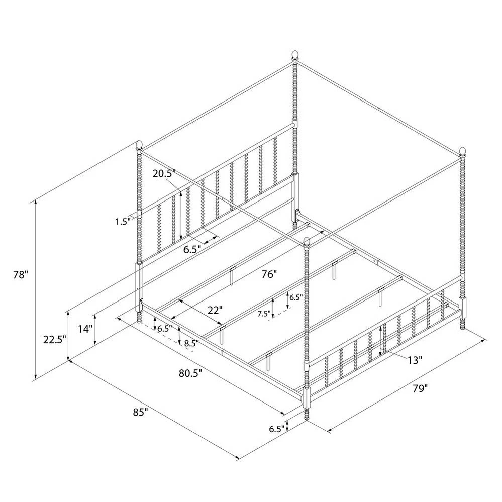 Add traditional elegance to your bedroom decor with this beautiful canopy bed. The bed features sturdy, all-metal construction and features oblong finials, and scrollwork detailing on the footboard, headboard, and the tall canopy posts. Side rails, center legs, and secured slats ensure extra stability, while elegant details complete the timeless look of this gorgeous bed.