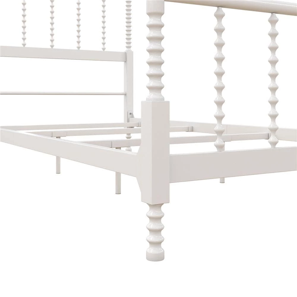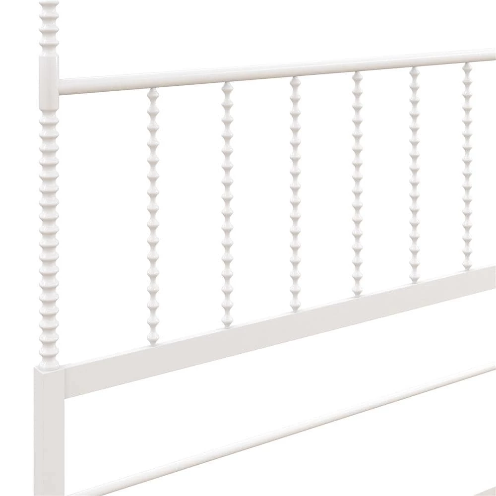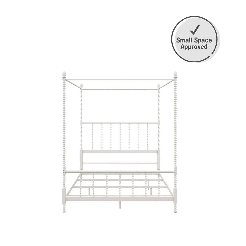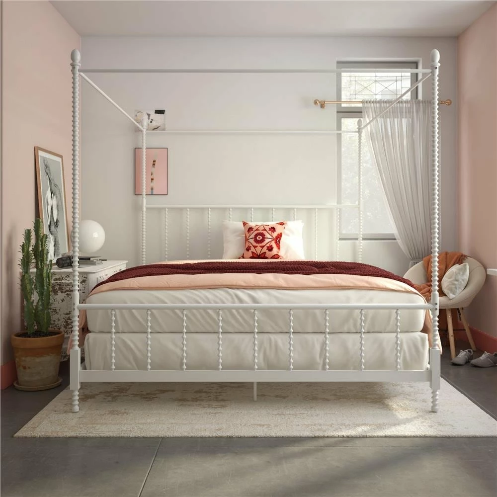 Add traditional elegance to your bedroom decor with this beautiful canopy bed. The bed features sturdy, all-metal construction and features oblong finials, and scrollwork detailing on the footboard, headboard, and the tall canopy posts. Side rails, center legs, and secured slats ensure extra stability, while elegant details complete the timeless look of this gorgeous bed.