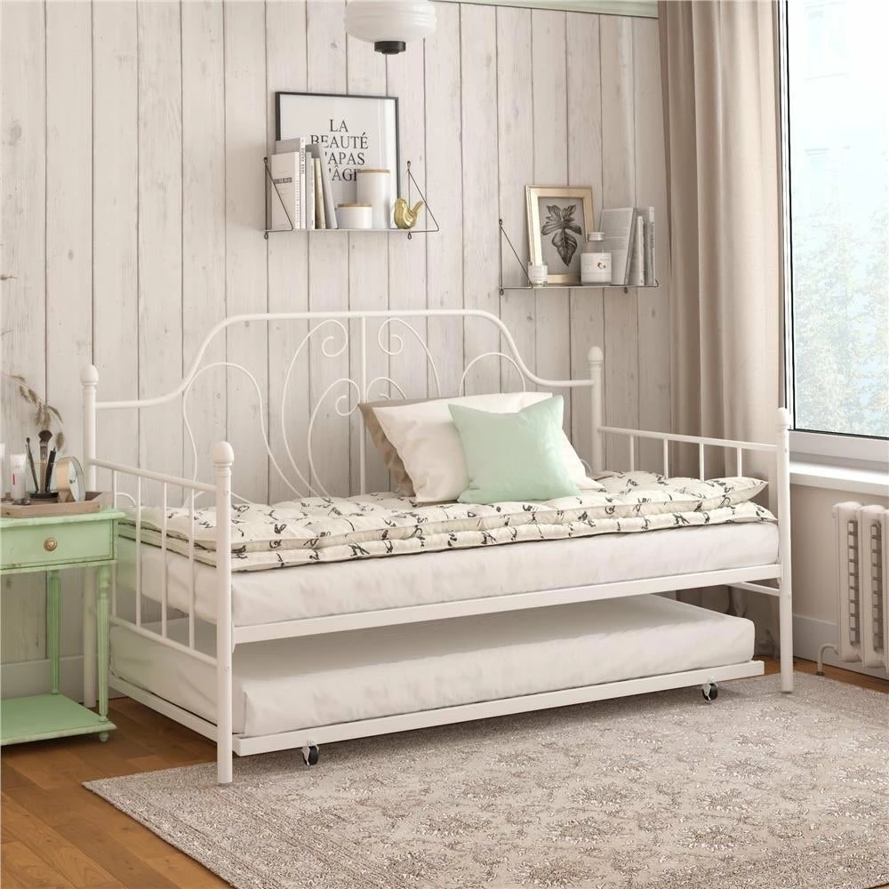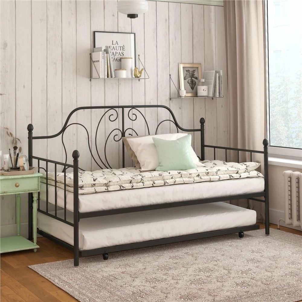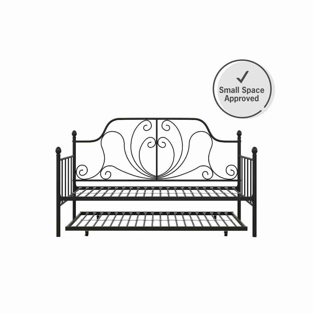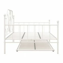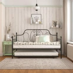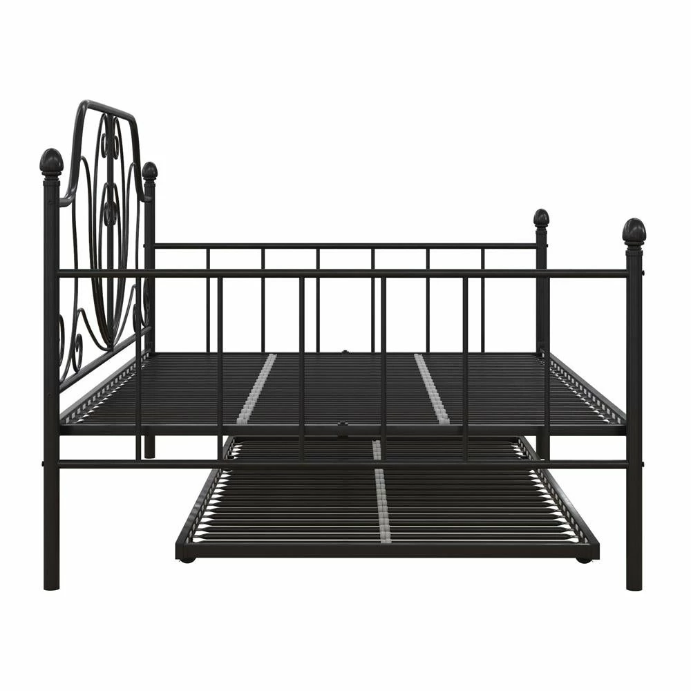 The Avenue Greene Elridge Metal Daybed with Trundle proves that vintage design is not out of style! The beautiful whimsical metal frame is designed with delicate finial details in the backrest to create the perfect centerpiece for your living room, guest bedroom or home office. The daybed’s frame is constructed with metal and features secured slats to provide all the support and stability you need to sleep in complete comfort. In need of extra sleeping space for overnight guests? The Eldrige has a trundle that can be neatly rolled in and out from under the daybed when it is needed. The Avenue Greene Eldrige Metal Daybed with Trundle is versatility at its best. Available in multiple size and color combinations. Box spring or foundation not required. Mattress sold separately.