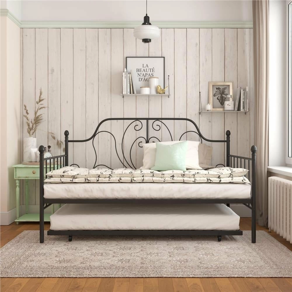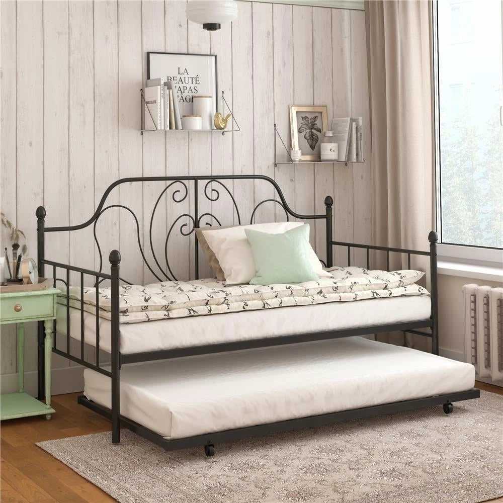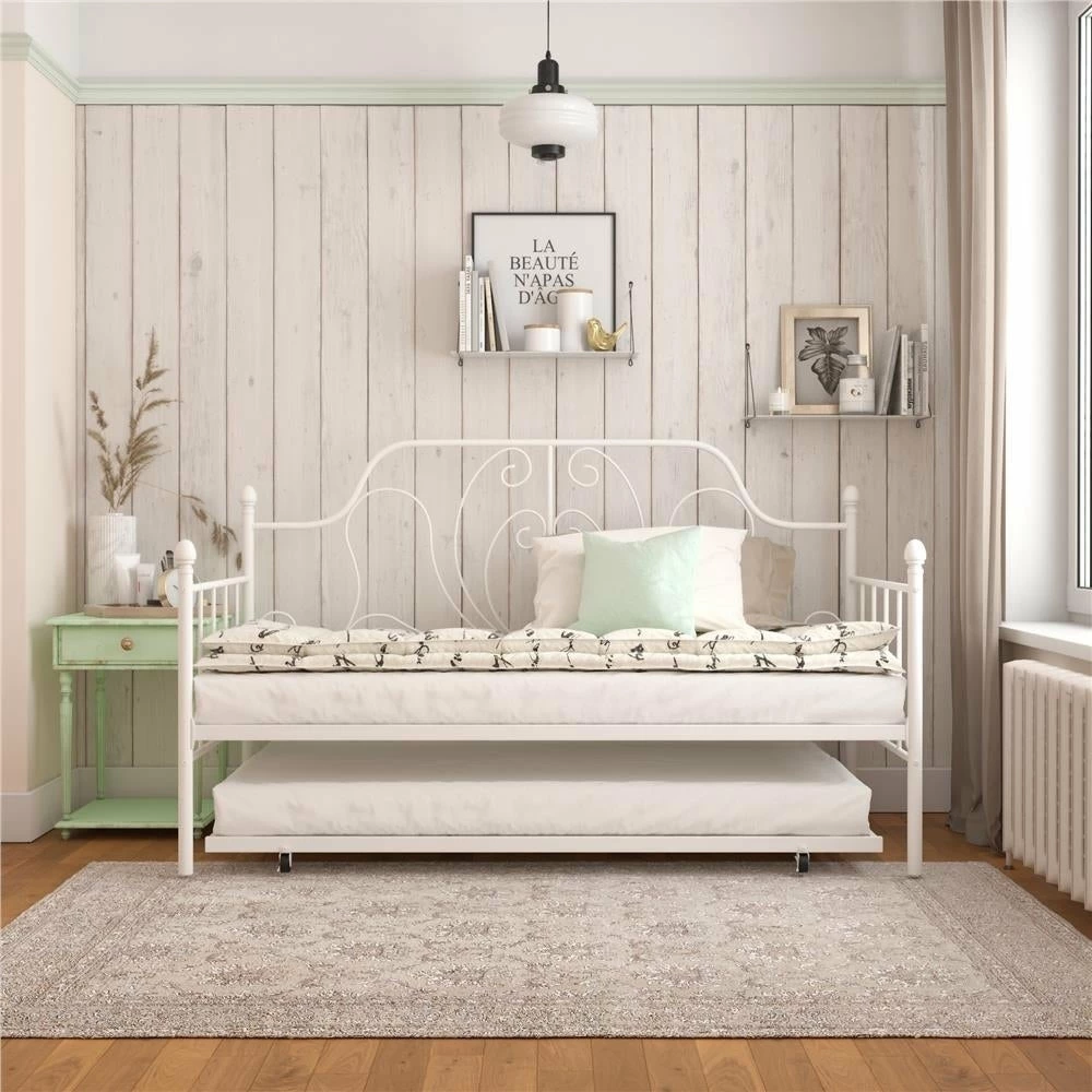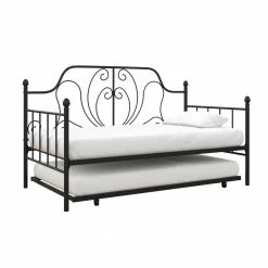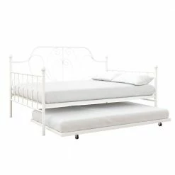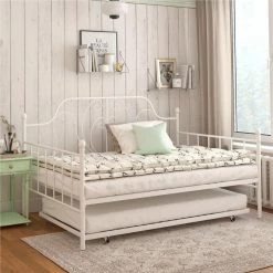 The Avenue Greene Elridge Metal Daybed with Trundle proves that vintage design is not out of style! The beautiful whimsical metal frame is designed with delicate finial details in the backrest to create the perfect centerpiece for your living room, guest bedroom or home office. The daybed’s frame is constructed with metal and features secured slats to provide all the support and stability you need to sleep in complete comfort. In need of extra sleeping space for overnight guests? The Eldrige has a trundle that can be neatly rolled in and out from under the daybed when it is needed. The Avenue Greene Eldrige Metal Daybed with Trundle is versatility at its best. Available in multiple size and color combinations. Box spring or foundation not required. Mattress sold separately.