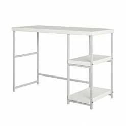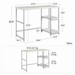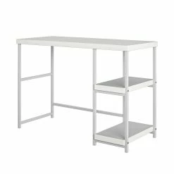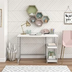 Your child can color and draw to their hearts content on the Avenue Greene Faith Kids Desk. Finish homework or work on art projects on the spacious desktop. The 2 open shelves provide space to store books, binders and craft supplies and keep your work surface clutter free. Made of laminated durable laminated hollow core and particleboard with a sturdy metal frame, the finish seamlessly blends with any dรฉcor. The 2 side shelves are reversible so you can have either white or gray shelves match your child’s style. The Desk meets the CPSIA Juvenile testing requirements to ensure your child’s safety. The Desk ships flat to your door and requires assembly upon opening. Two adults are recommended to assemble. Once assembled, the Desk measures to be 28.98″H x 41.97″W x 17.99″D.
