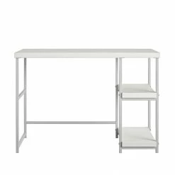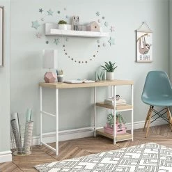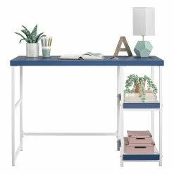 - Made of laminated hollow core and particleboard with a sturdy metal frame, the desk has reversible side shelves to match your child’s style
