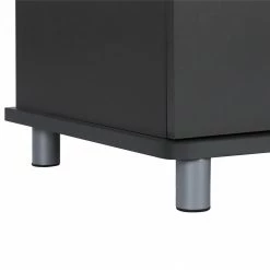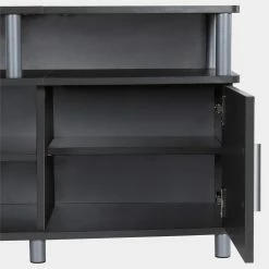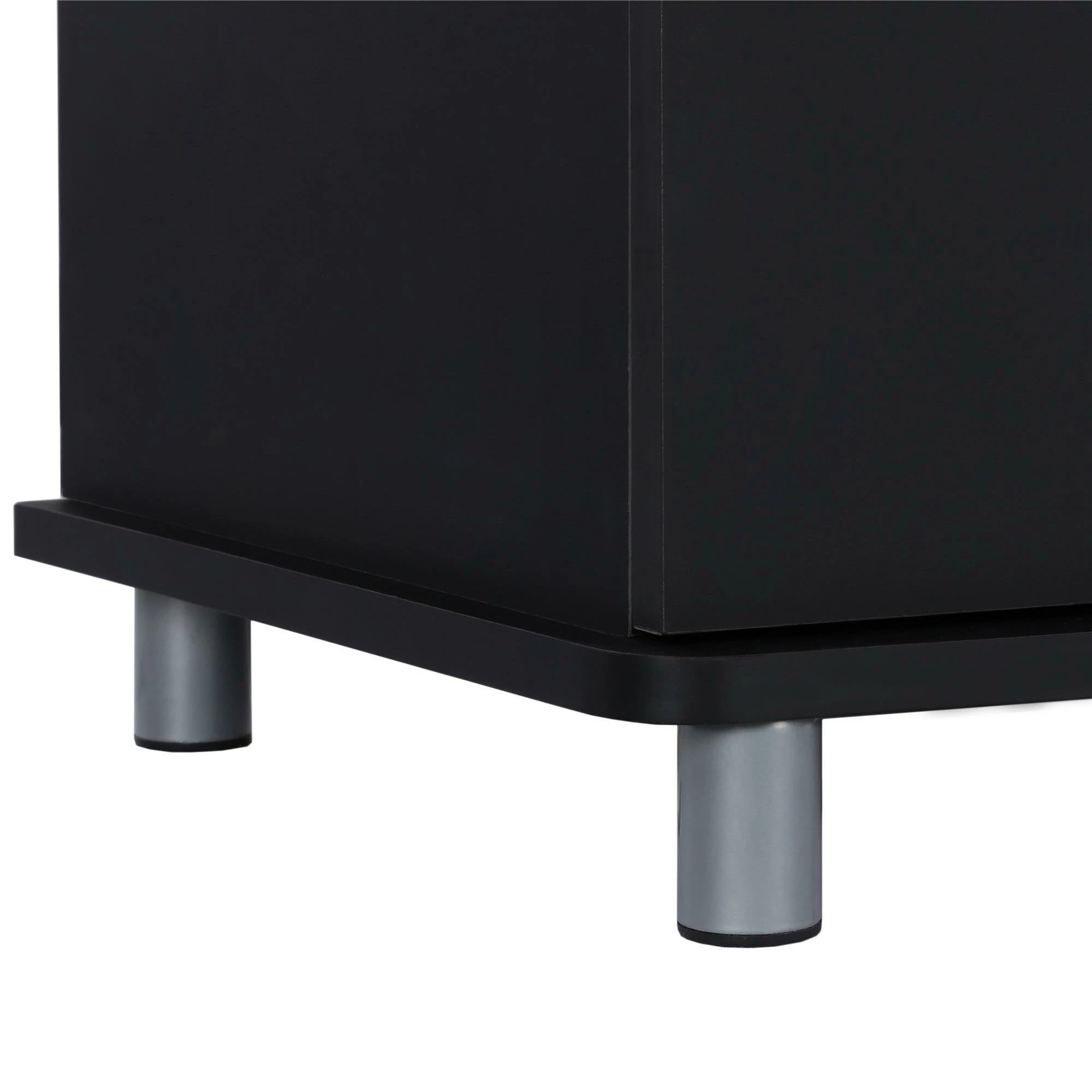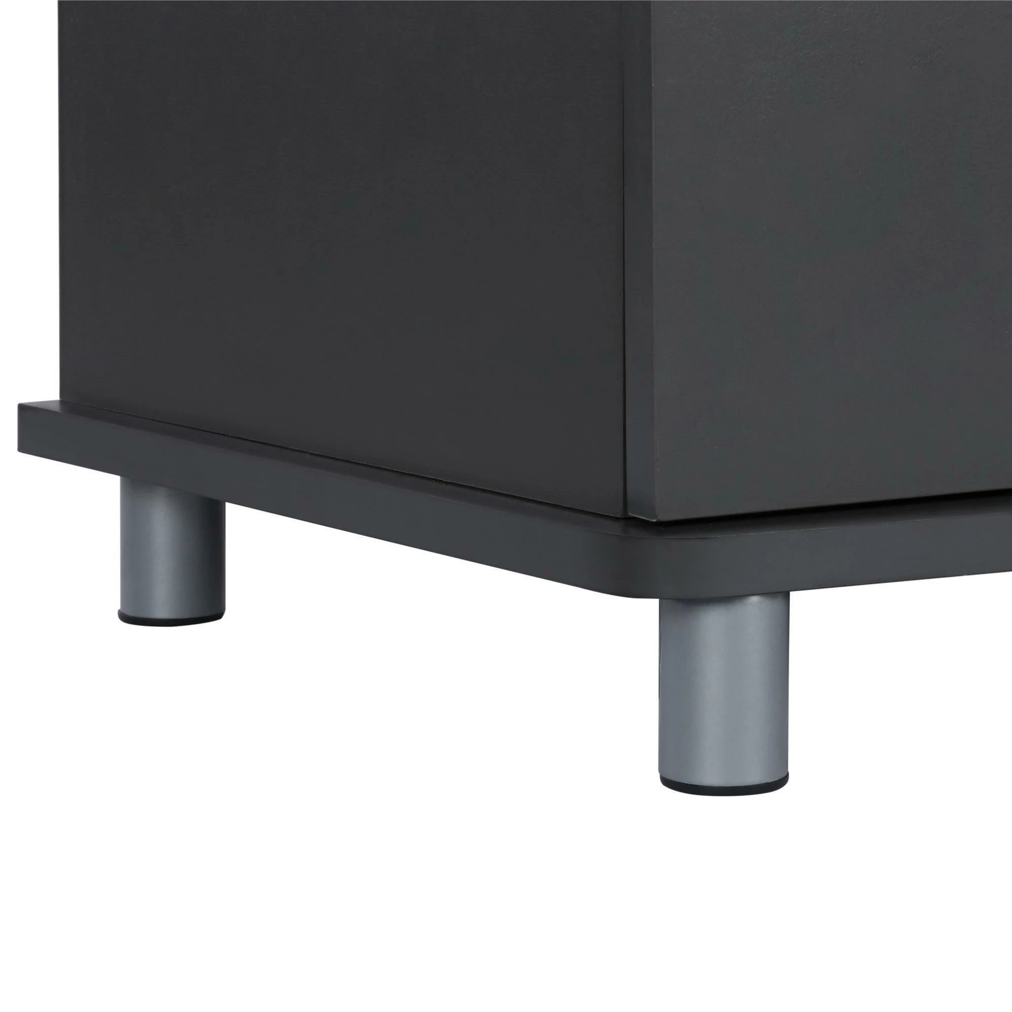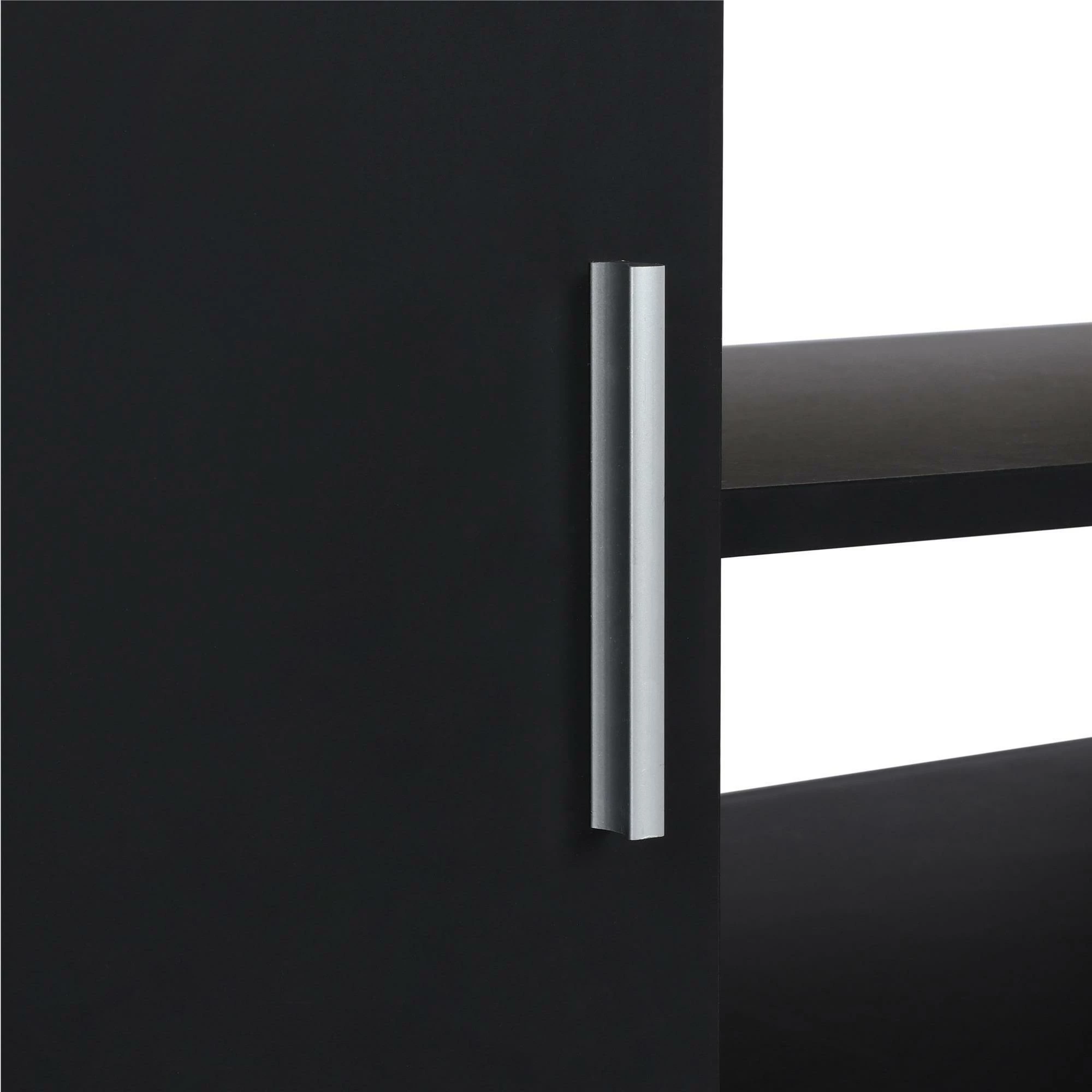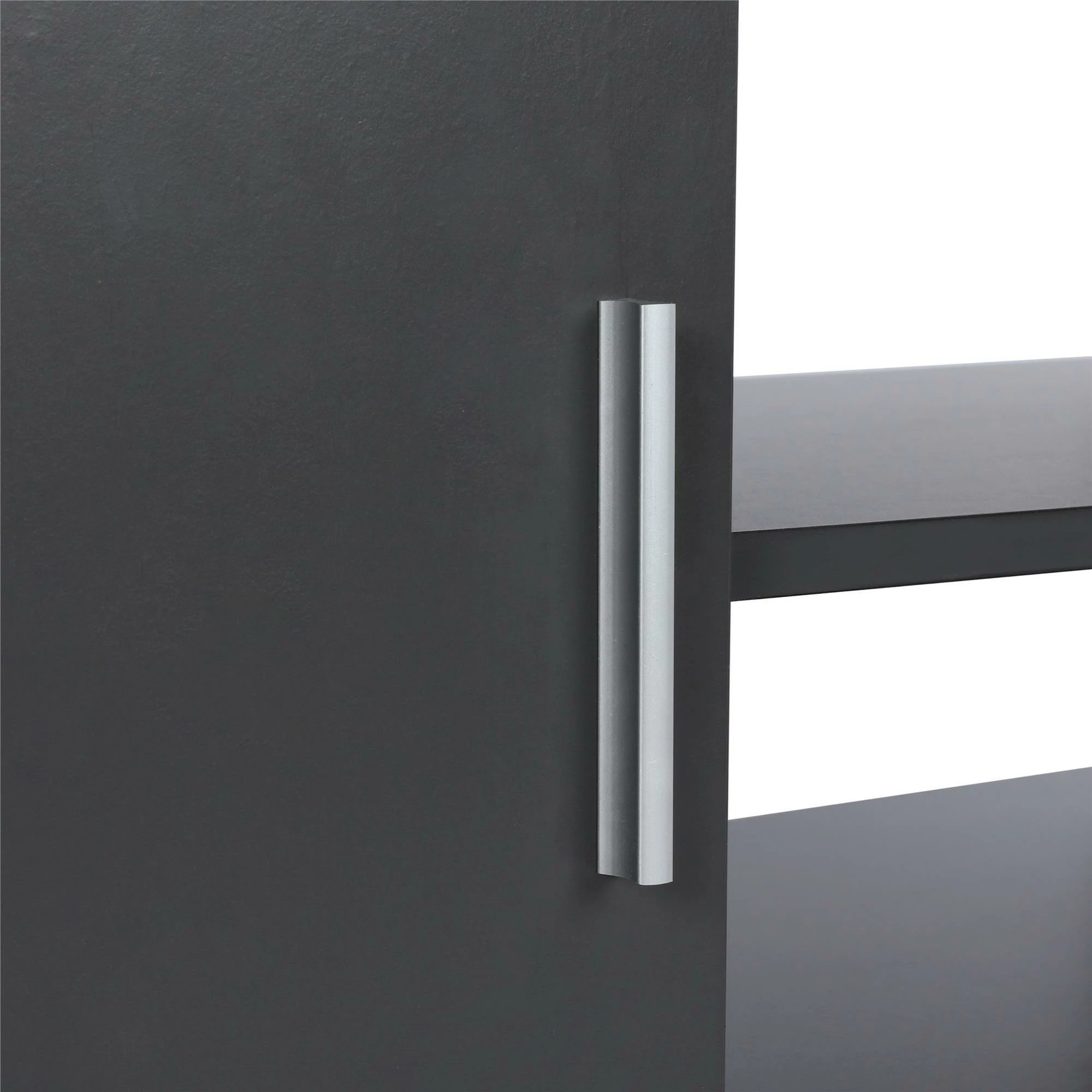 - The matte black or grey finish on sturdy particleboard and MDF is accented by silver metal legs and handles for a modern and industrial style