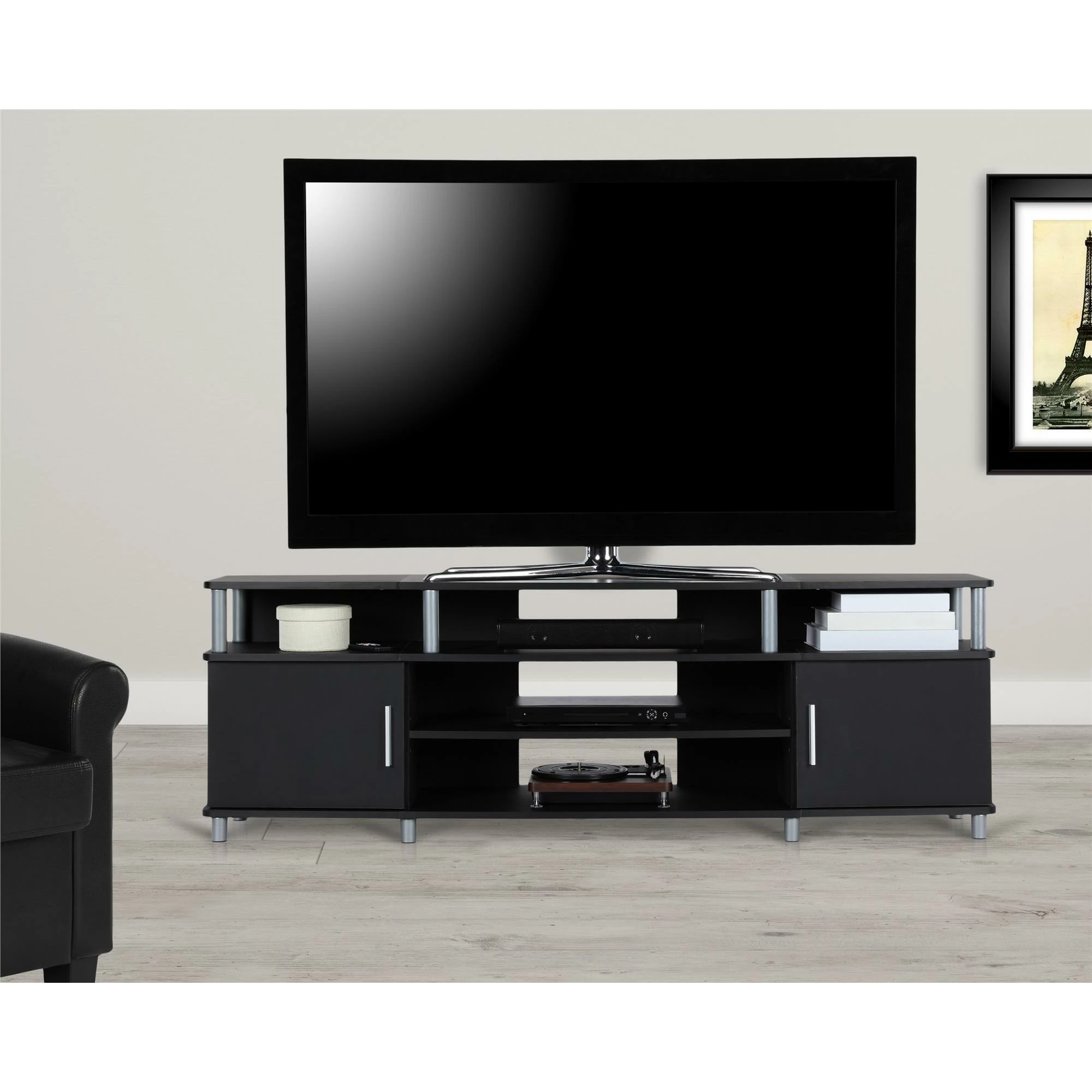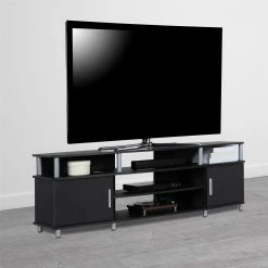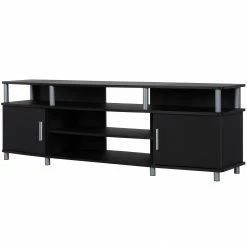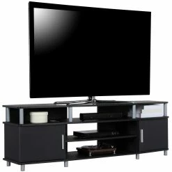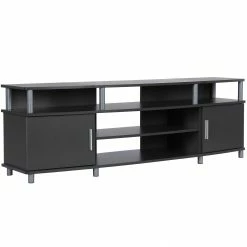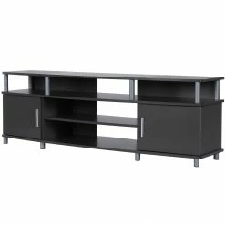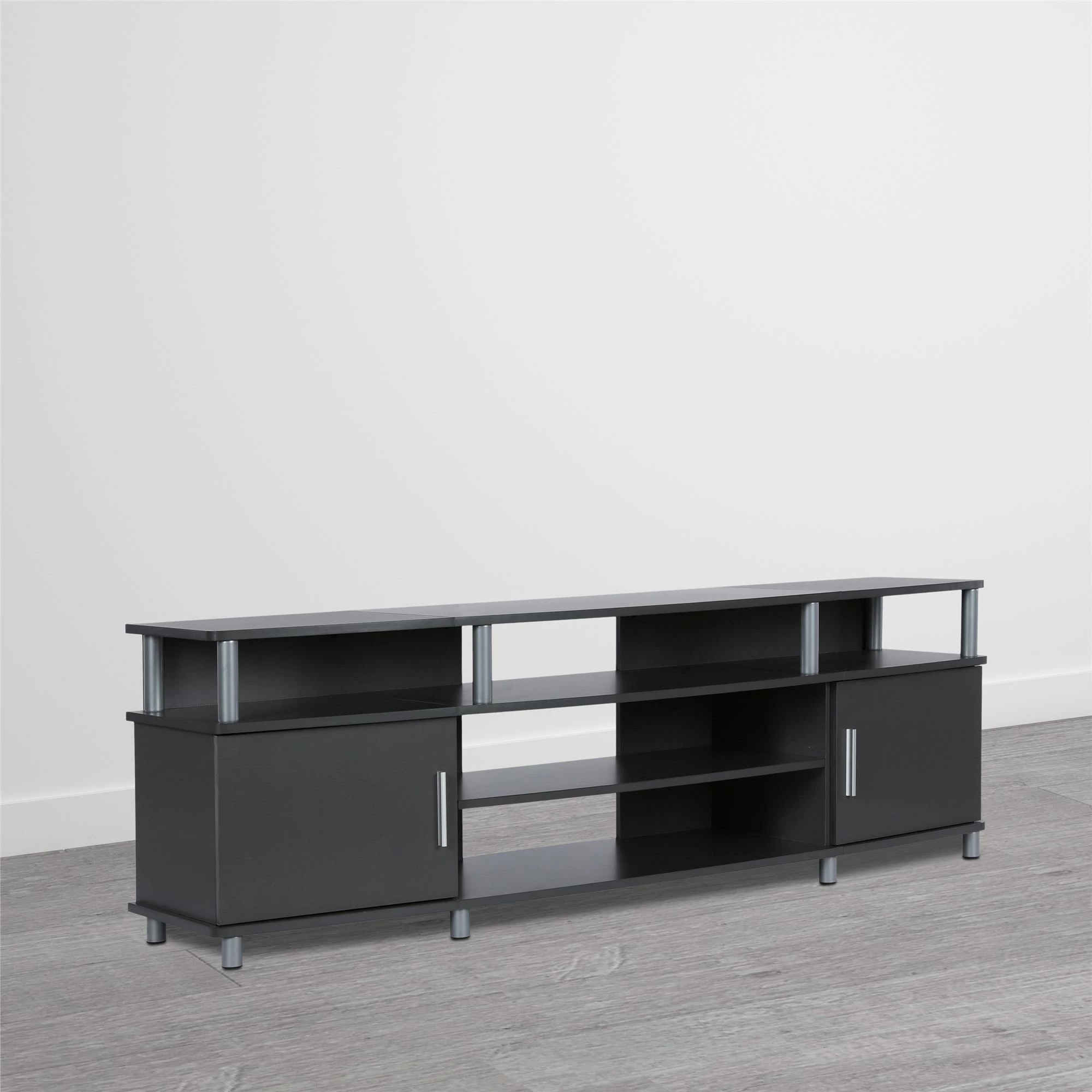 - The open shelves provide plenty of space to keep your cable box, DVD or Blu-Ray player and video game system and still look organized. In addition to the open shelves are 2 closed cabinets to stack your DVDs, Blu-Rays and video games neatly in