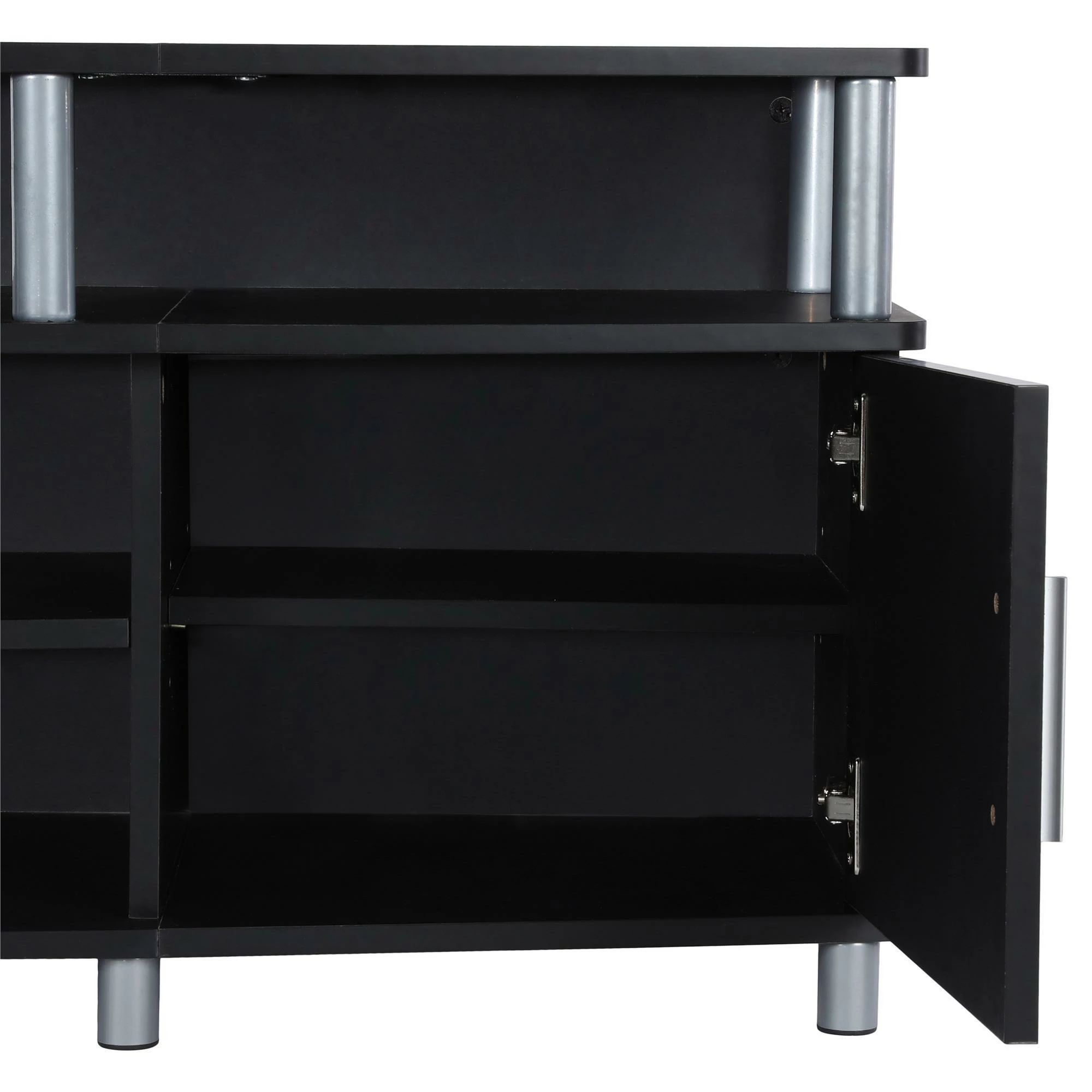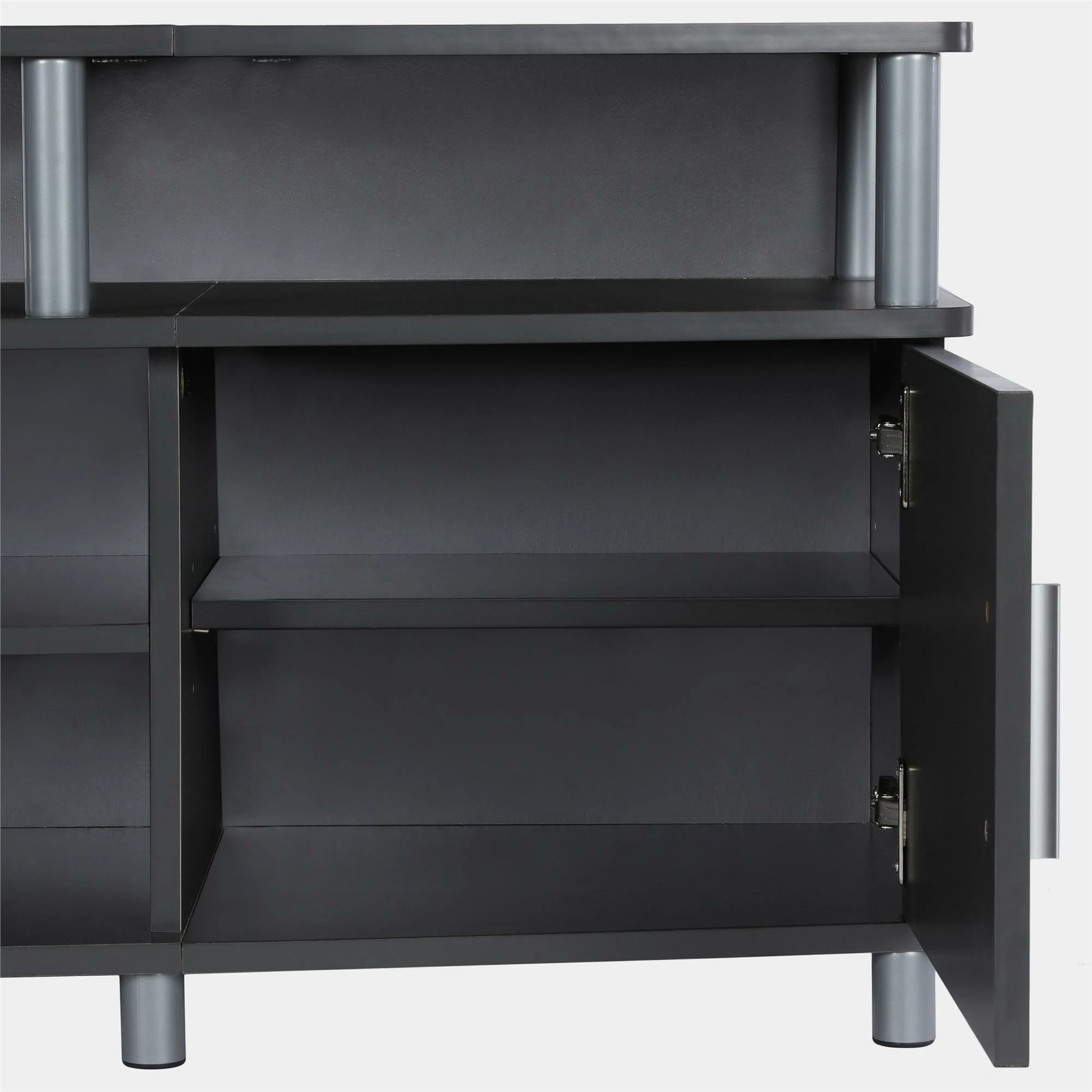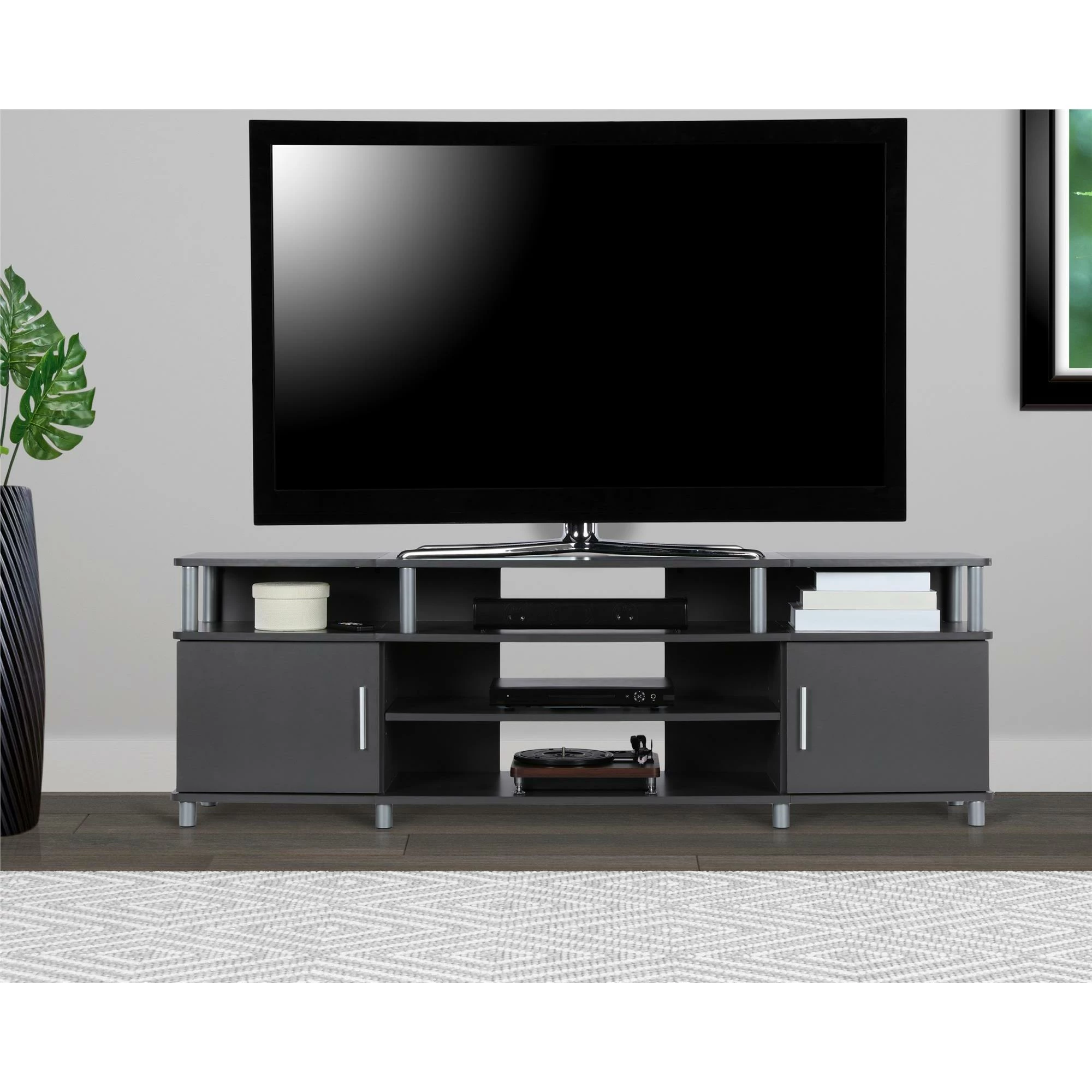 - The open shelves provide plenty of space to keep your cable box, DVD or Blu-Ray player and video game system and still look organized. In addition to the open shelves are 2 closed cabinets to stack your DVDs, Blu-Rays and video games neatly in