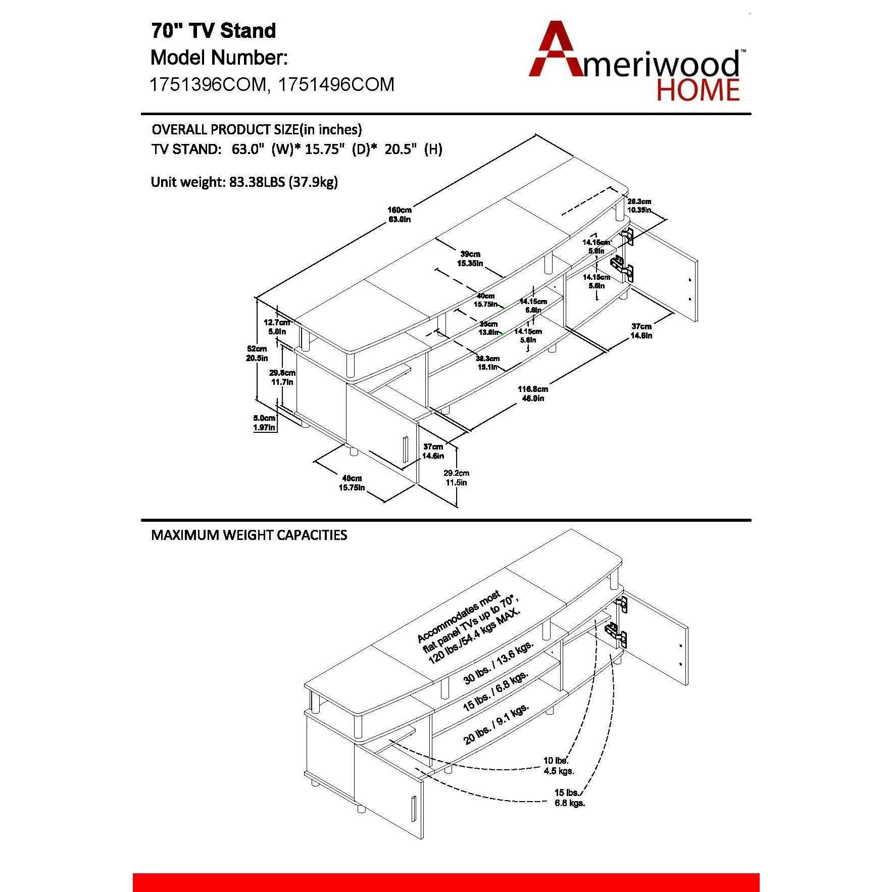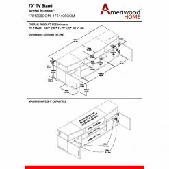 Elevate your entertainment space with the great-looking contemporary Avenue Greene Ford TV Stand. Designed to accommodate up to a 70 inch flat screen TV up to 120 pounds, this TV Stand creates a sleek and stylish showcase for your home theater system. The TV Stand features multiple open shelves for numerous audio components. Two side cabinets provide additional concealed space for storing movies, music, video games, gaming controllers and other items. The Ford allows you to run wires easily and neatly through the large wire management holes in the back of the unit to keep all your components tangle free. The clean lines of this TV Stand makes this piece stand out in any room. After fully assembled, this stand is 20.5 inches high x 63 inches wide x 15.75 inches deep and is recommended to be assembled by 2 adults. This TV stand is constructed of particleboard and metal for a look that fits in with modern day style.