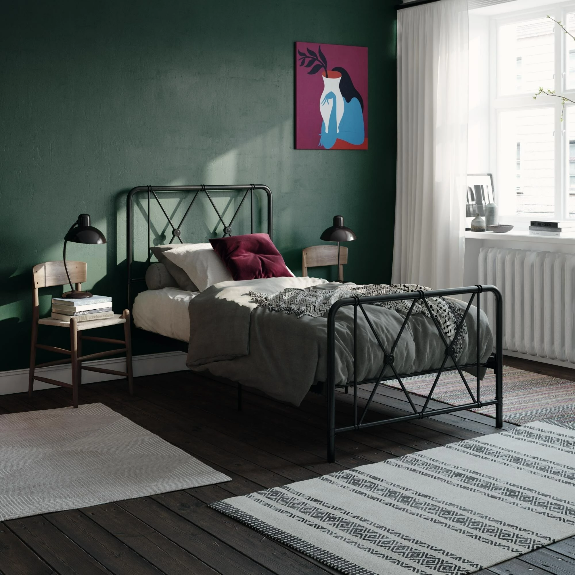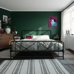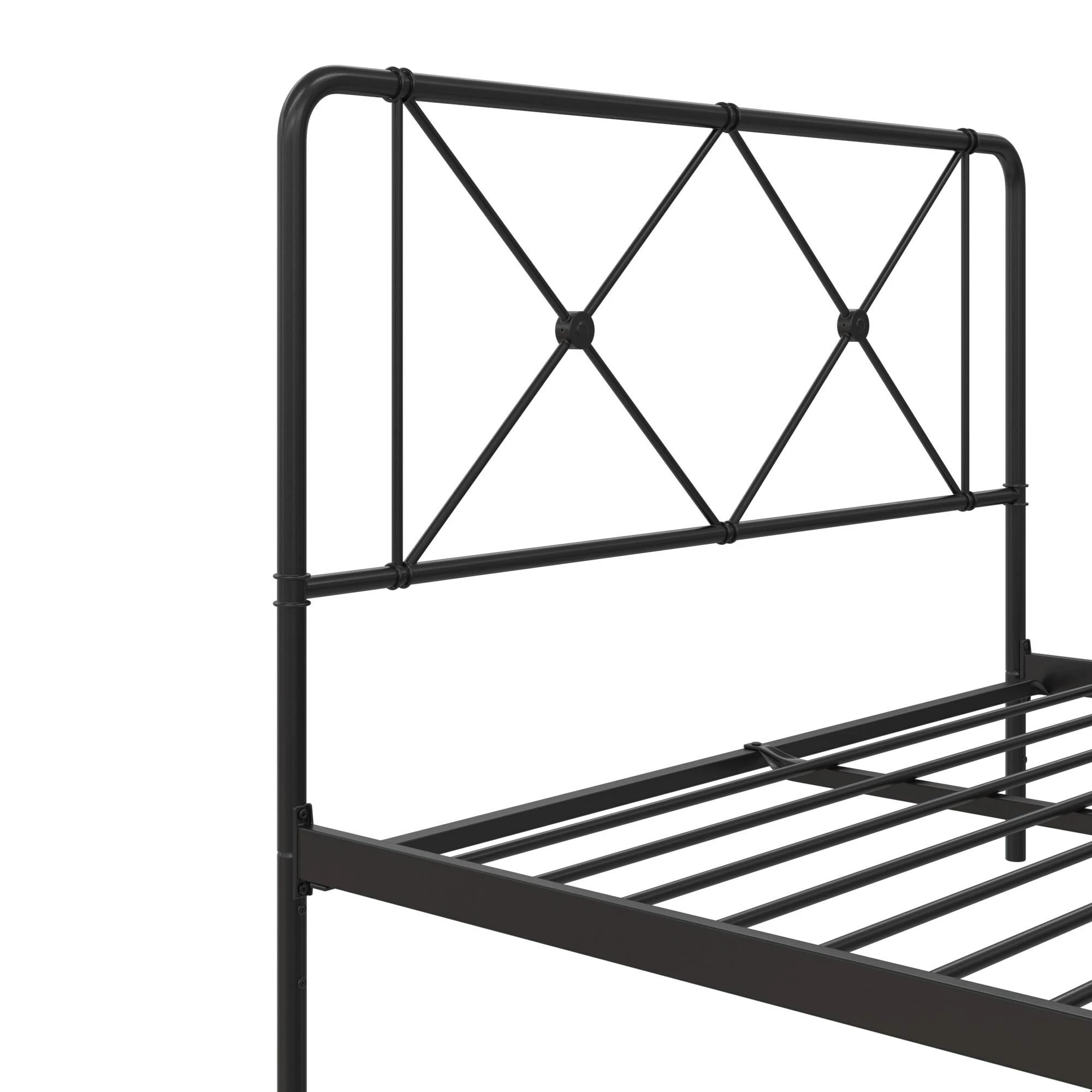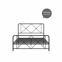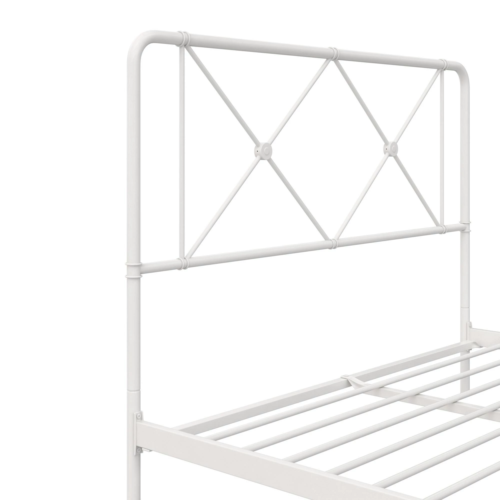 Give your bedroom a fresh look with this farmhouse style bed from Avenue Greene. The curved edges of the headboard and footboard create a soothing tone. The geometric medallion embossed pattern elicits a simple modern feel. Its sturdy metal constructed frame includes strong metal slats, center legs, and side rails that eliminate the need for any cumbersome box spring or foundation. This piece is offered in various sizes and colors.