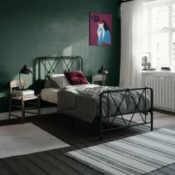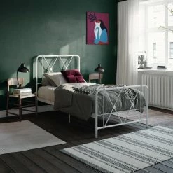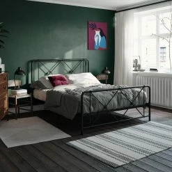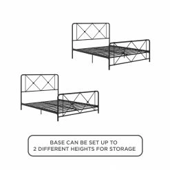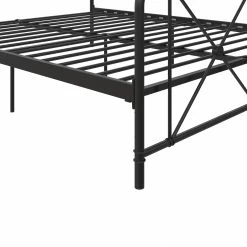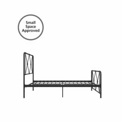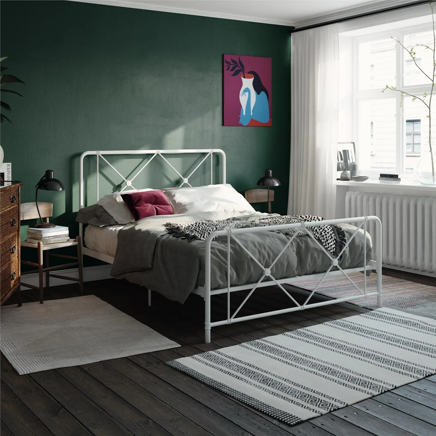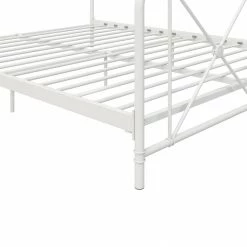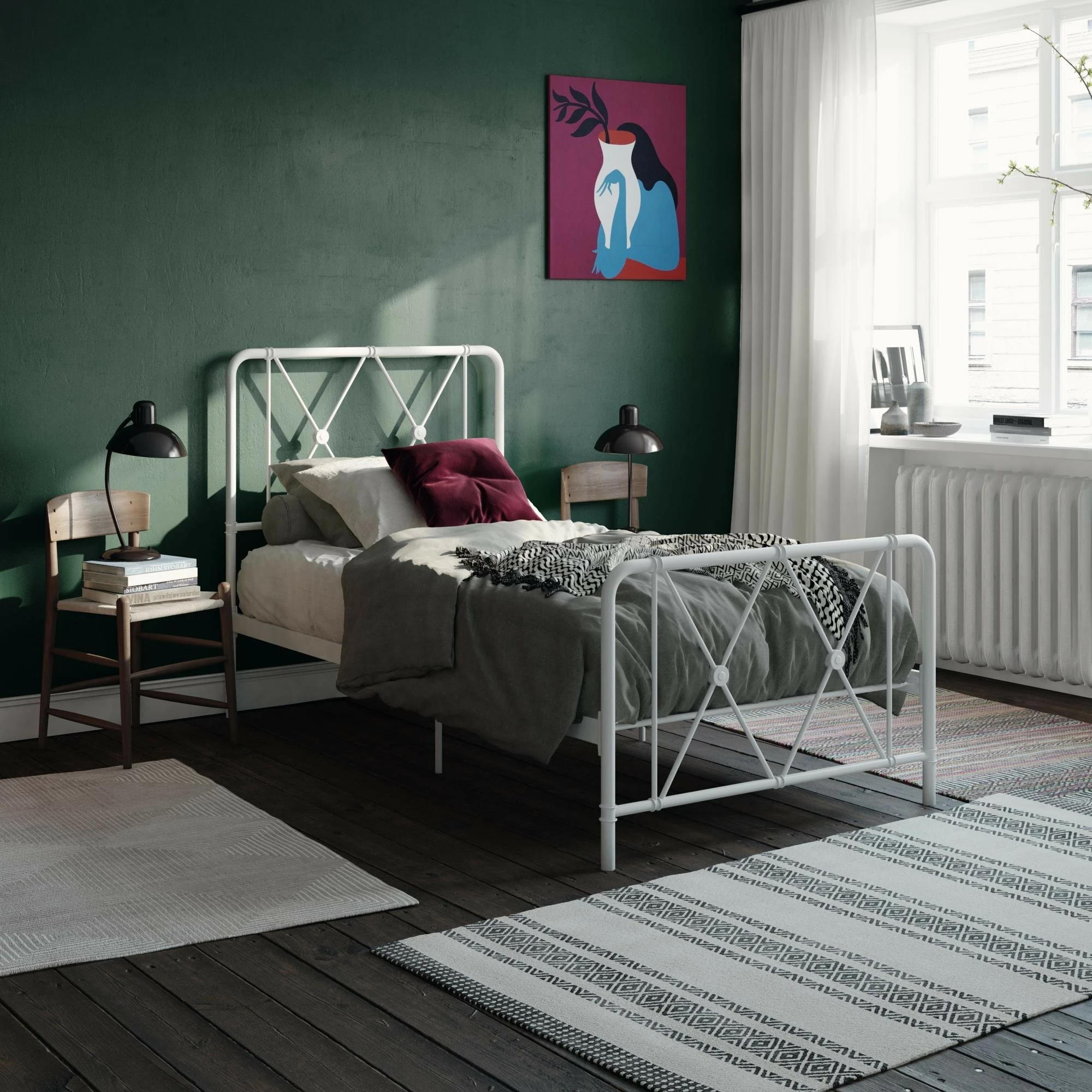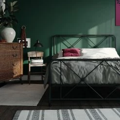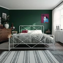 Give your bedroom a fresh look with this farmhouse style bed from Avenue Greene. The curved edges of the headboard and footboard create a soothing tone. The geometric medallion embossed pattern elicits a simple modern feel. Its sturdy metal constructed frame includes strong metal slats, center legs, and side rails that eliminate the need for any cumbersome box spring or foundation. This piece is offered in various sizes and colors.