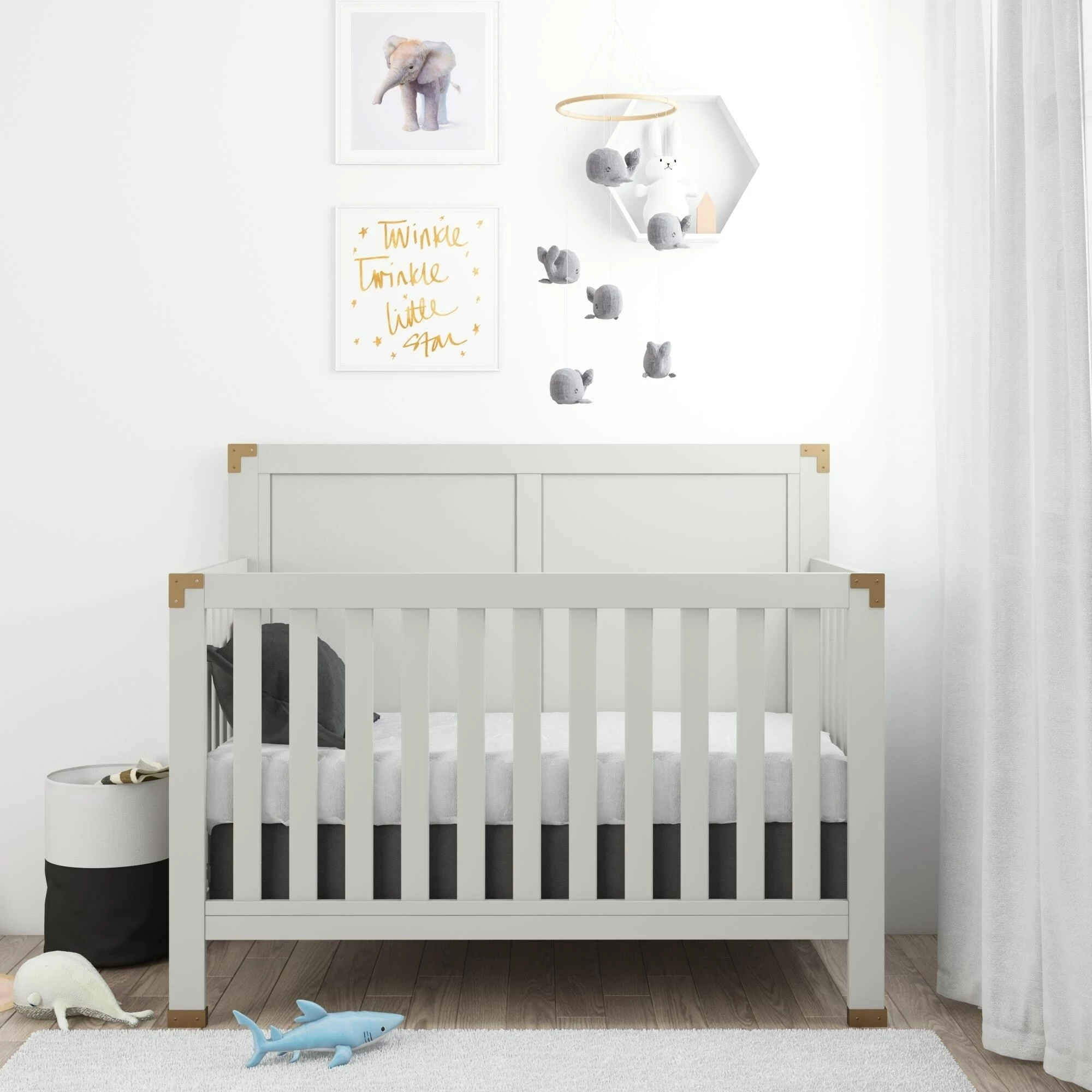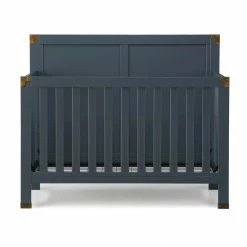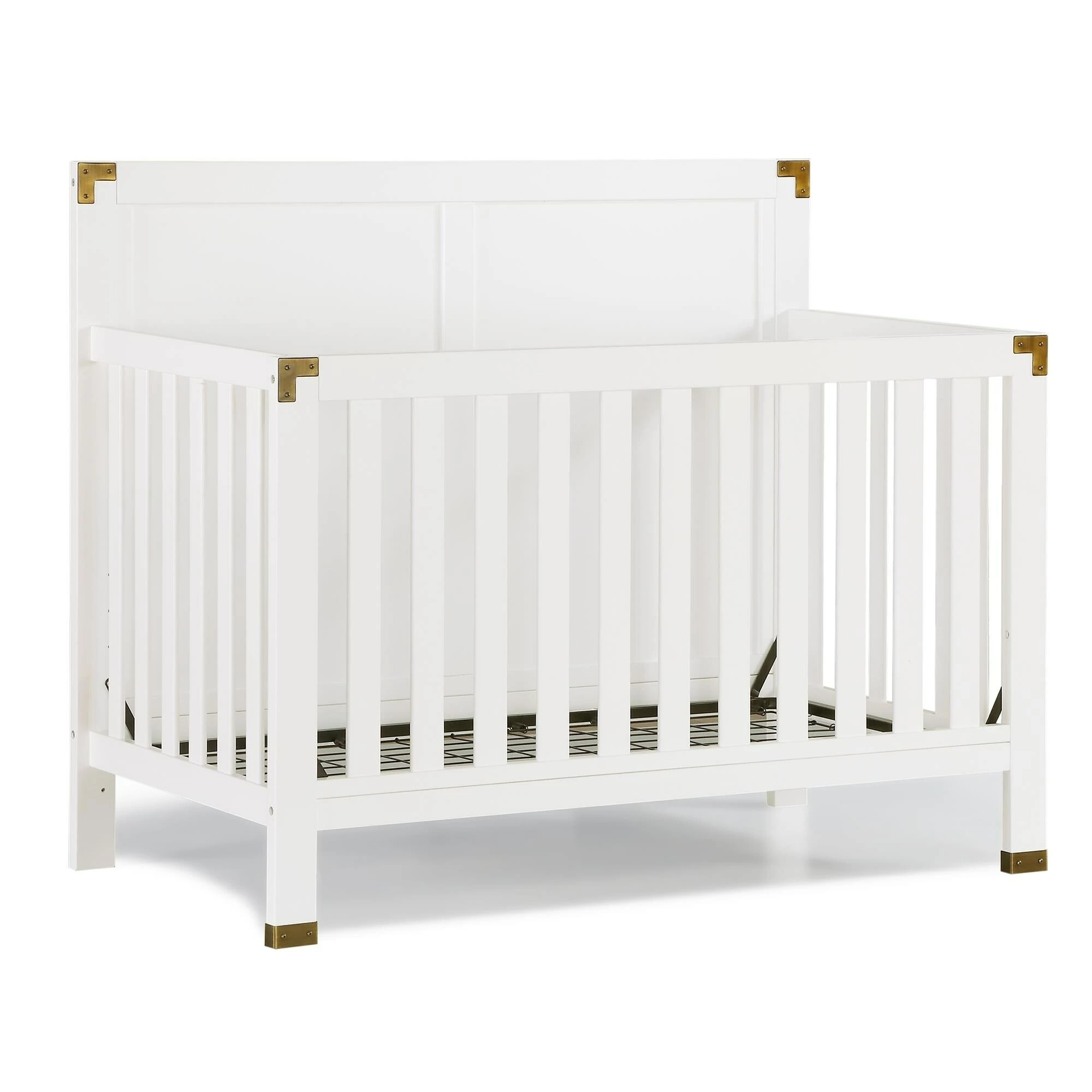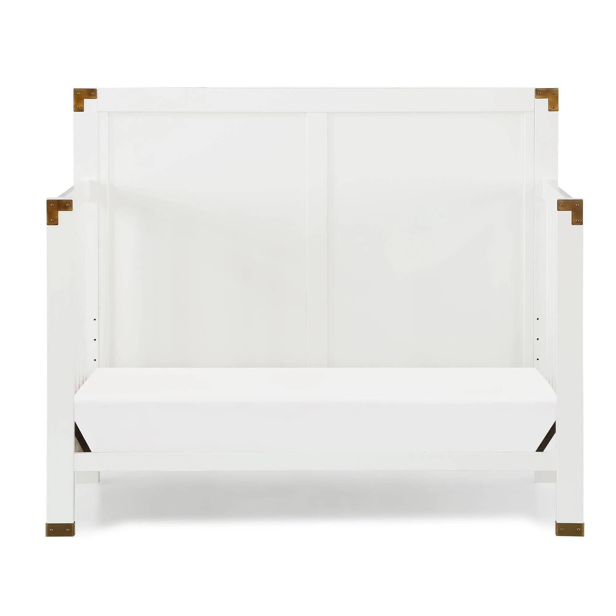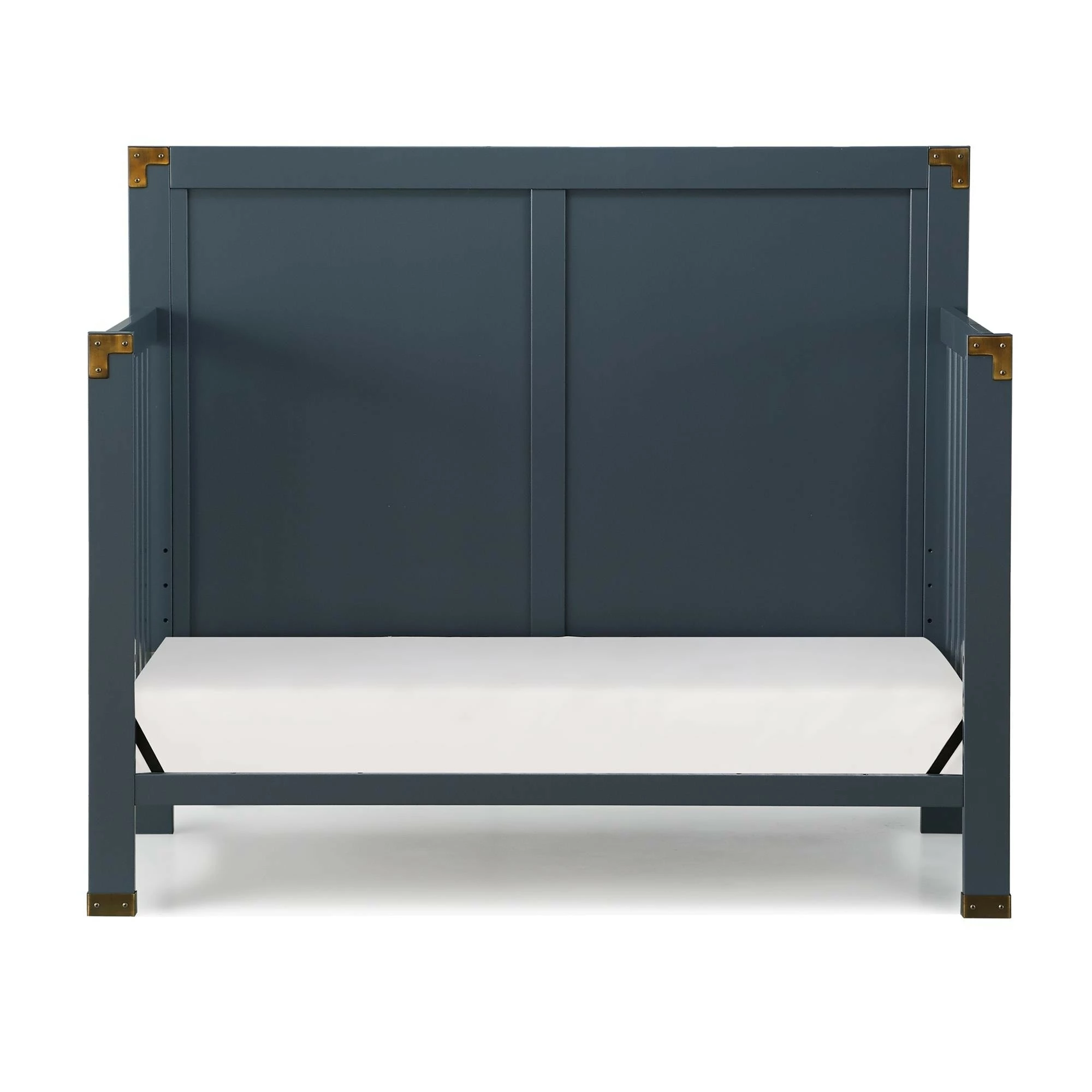 Create a space that is fun and sophisticated with the delightful Jordan 5-in-1 Convertible Crib by Avenue Greene. Combining campaign and modern style, this charismatic crib is crafted with a sturdy wood construction and features a full panel headboard, vertical slats footboard and simple post style legs. Sleek and safe, this crib comes equipped with four mattress positions that allow you to adjust the height of the platform as your child grows. When your child is ready, the Jordan conveniently converts from a crib to a daybed, toddler bed and finally a full size bed. From functionality also sprang great design with modern features such as clean lines, a fresh classic white, graphite grey or graphite blue finish, and campaign style inspired aged brass decor metal plates that accent the corners of both the headboard and footboard. Combine the Jordan 5-in-1 Convertible Crib with the rest of the Avenue Greene Jordan collection to design a playfully sophisticated nursery room that will live, move and grow alongside your child.