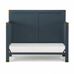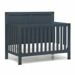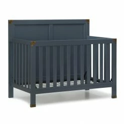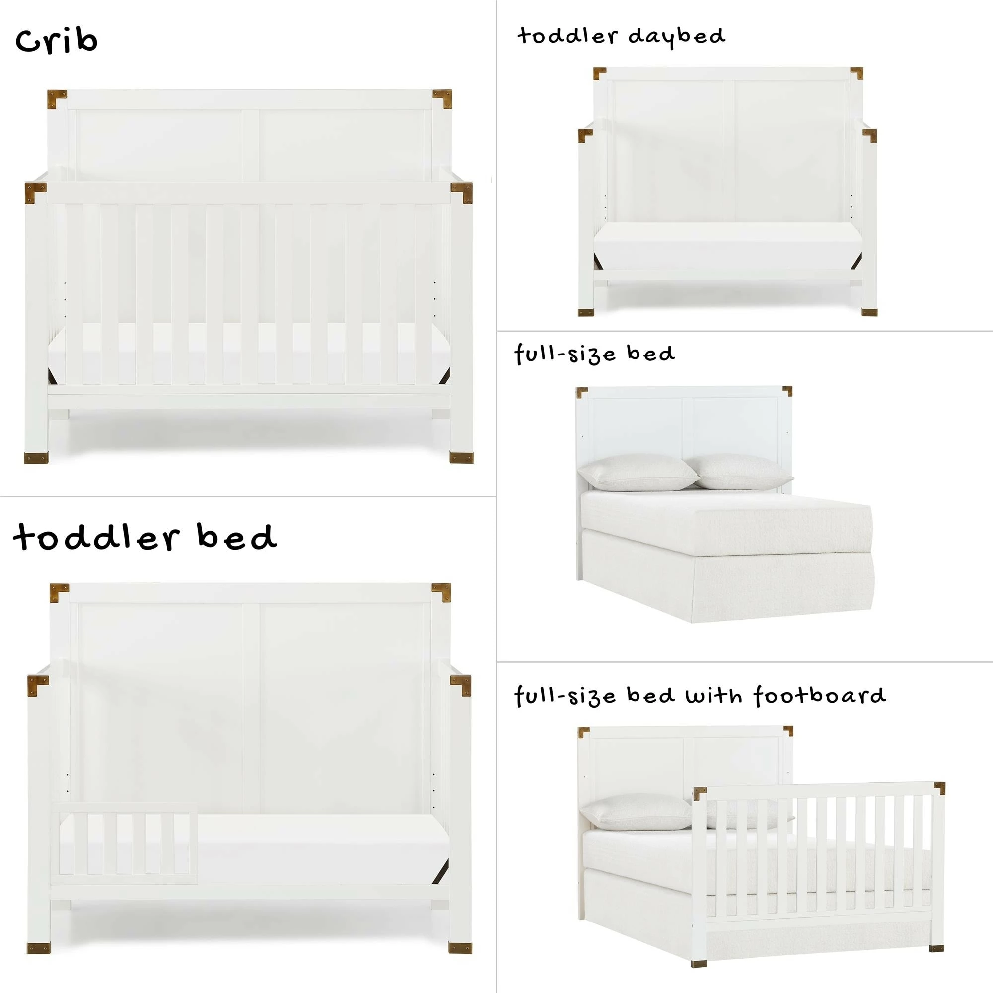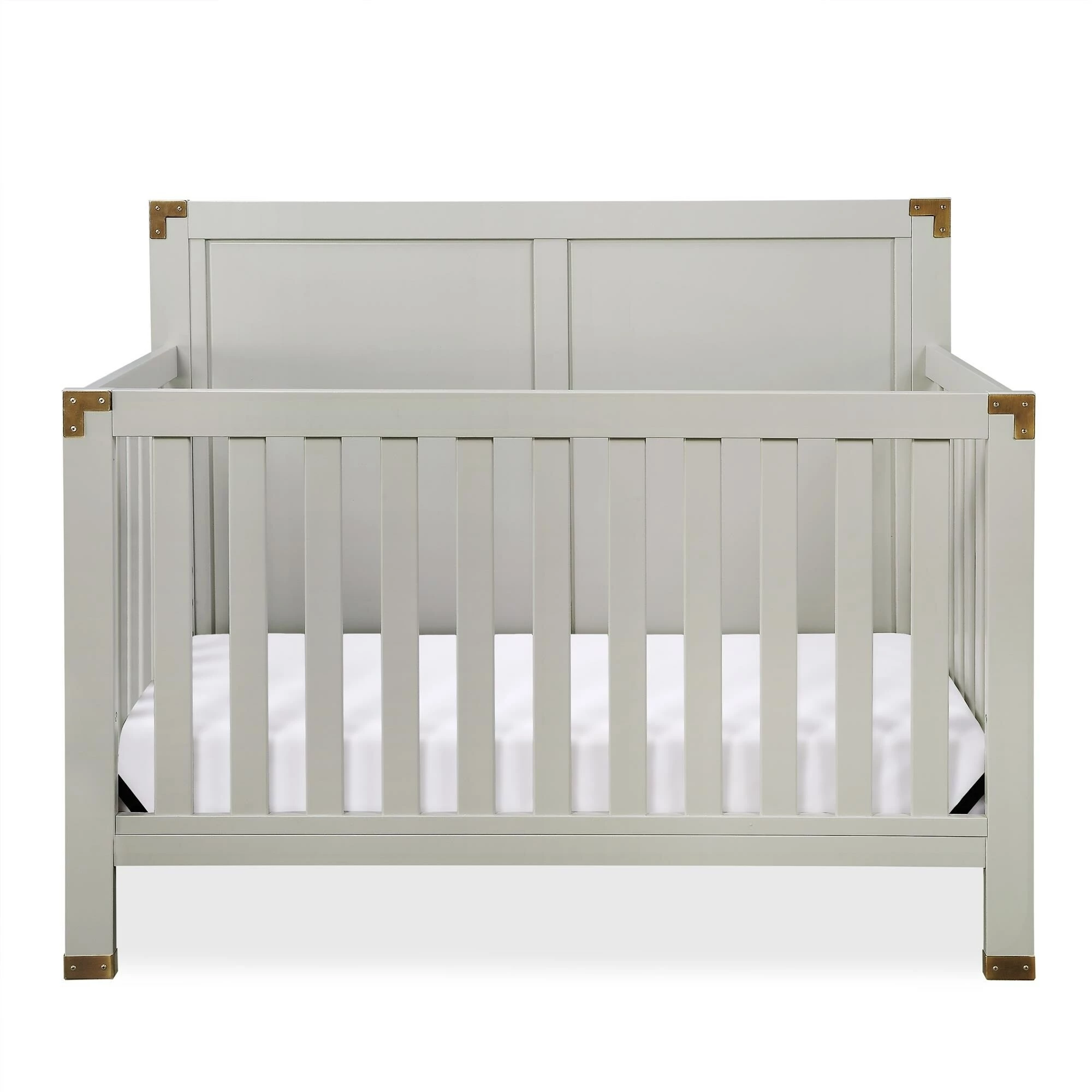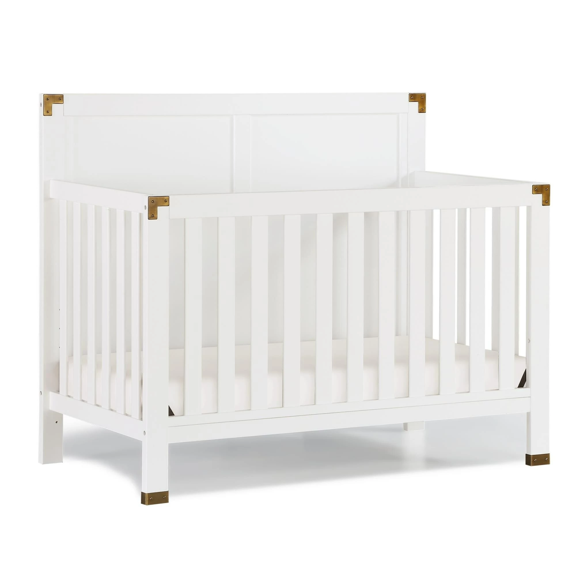 Create a space that is fun and sophisticated with the delightful Jordan 5-in-1 Convertible Crib by Avenue Greene. Combining campaign and modern style, this charismatic crib is crafted with a sturdy wood construction and features a full panel headboard, vertical slats footboard and simple post style legs. Sleek and safe, this crib comes equipped with four mattress positions that allow you to adjust the height of the platform as your child grows. When your child is ready, the Jordan conveniently converts from a crib to a daybed, toddler bed and finally a full size bed. From functionality also sprang great design with modern features such as clean lines, a fresh classic white, graphite grey or graphite blue finish, and campaign style inspired aged brass decor metal plates that accent the corners of both the headboard and footboard. Combine the Jordan 5-in-1 Convertible Crib with the rest of the Avenue Greene Jordan collection to design a playfully sophisticated nursery room that will live, move and grow alongside your child.