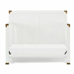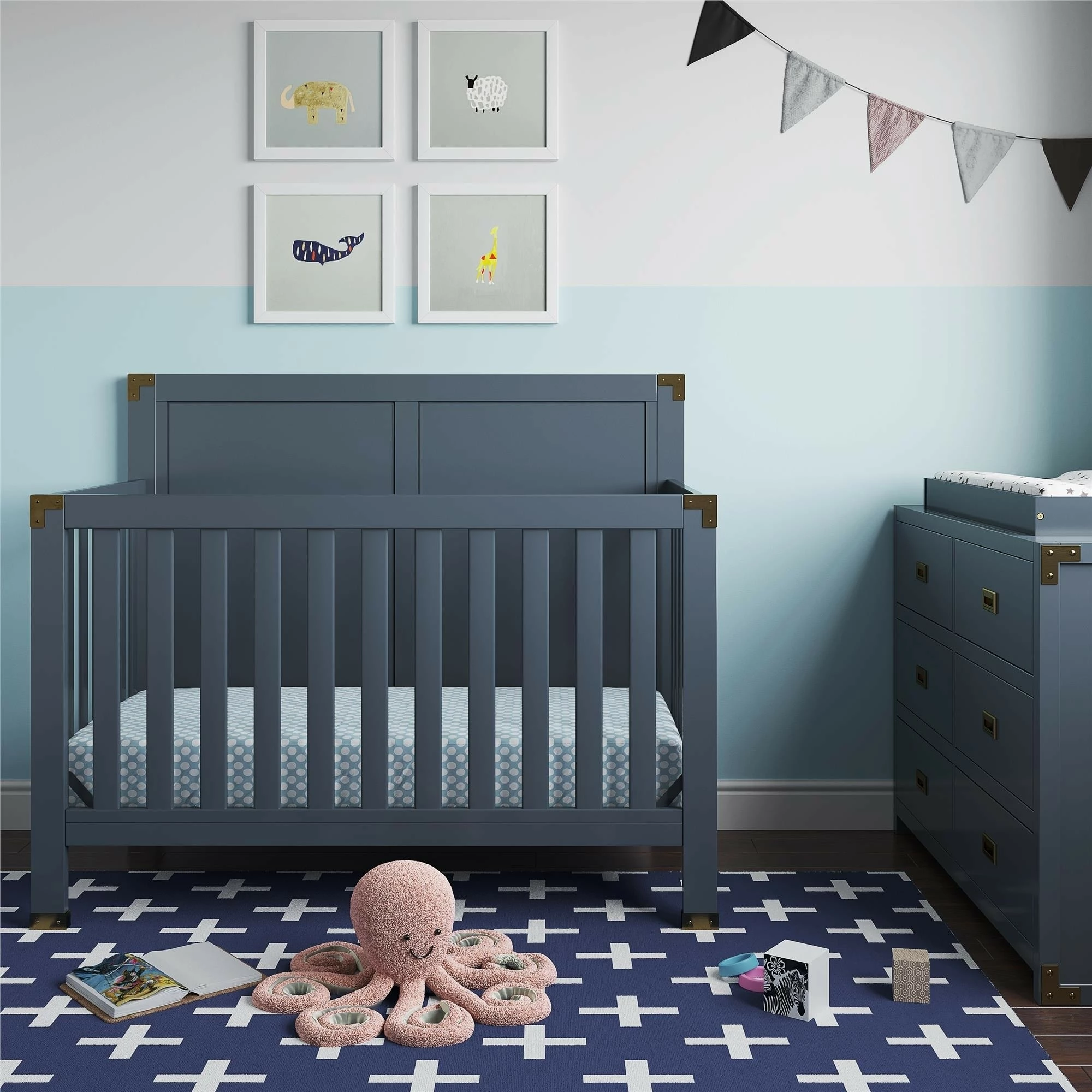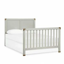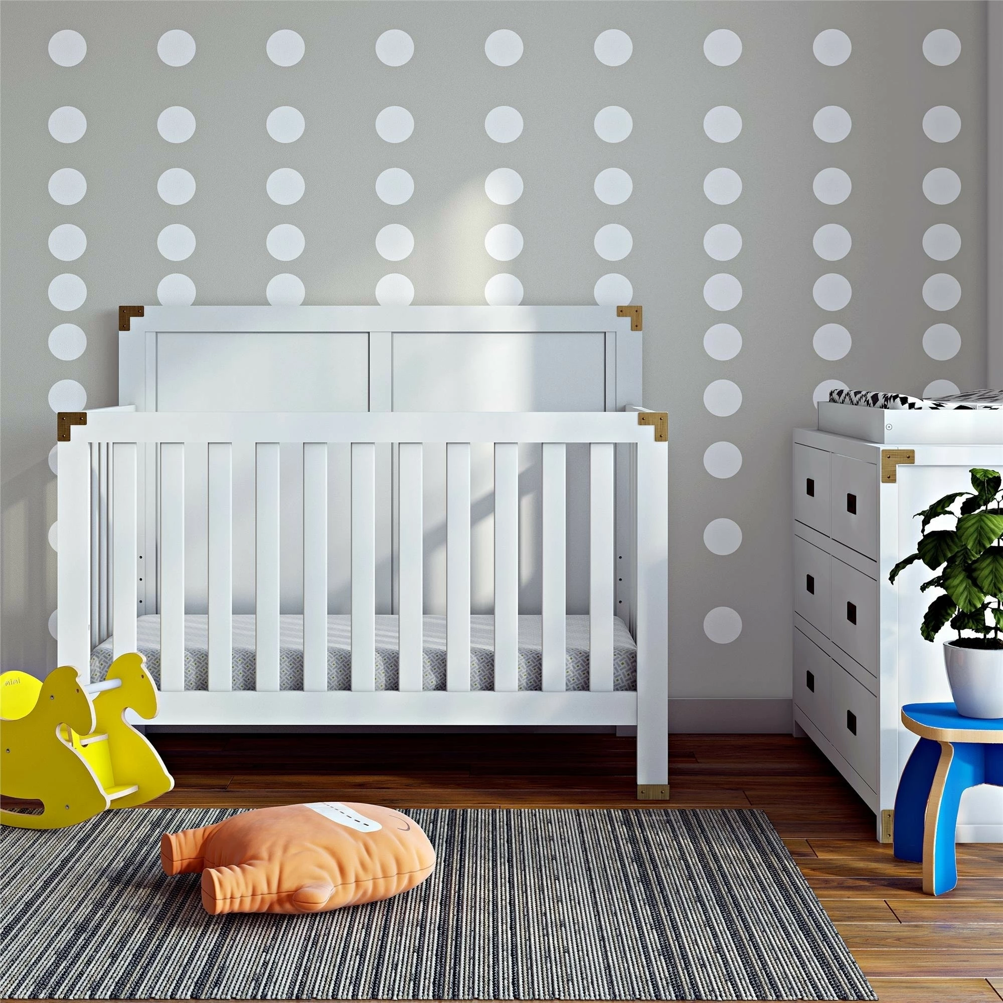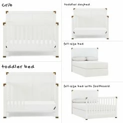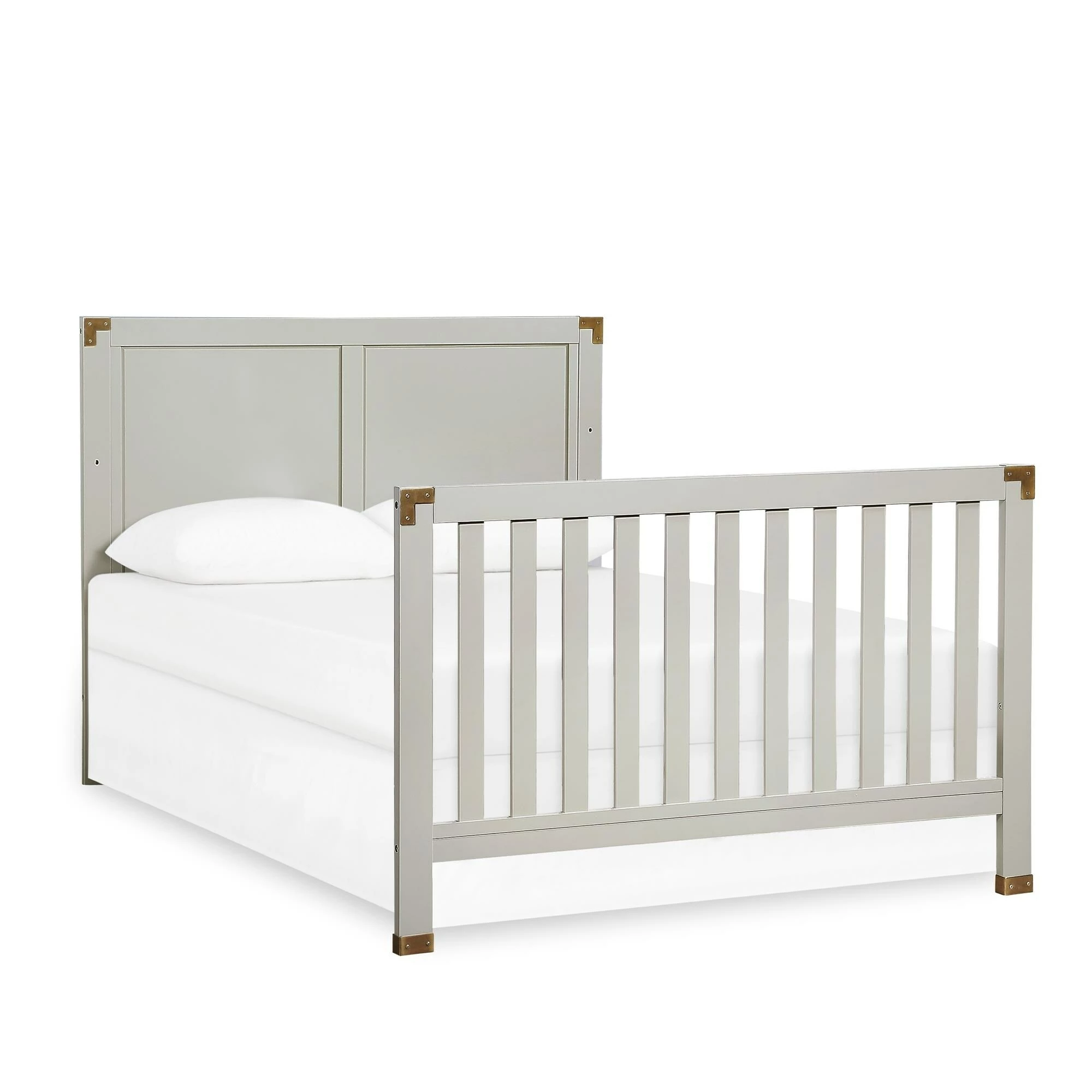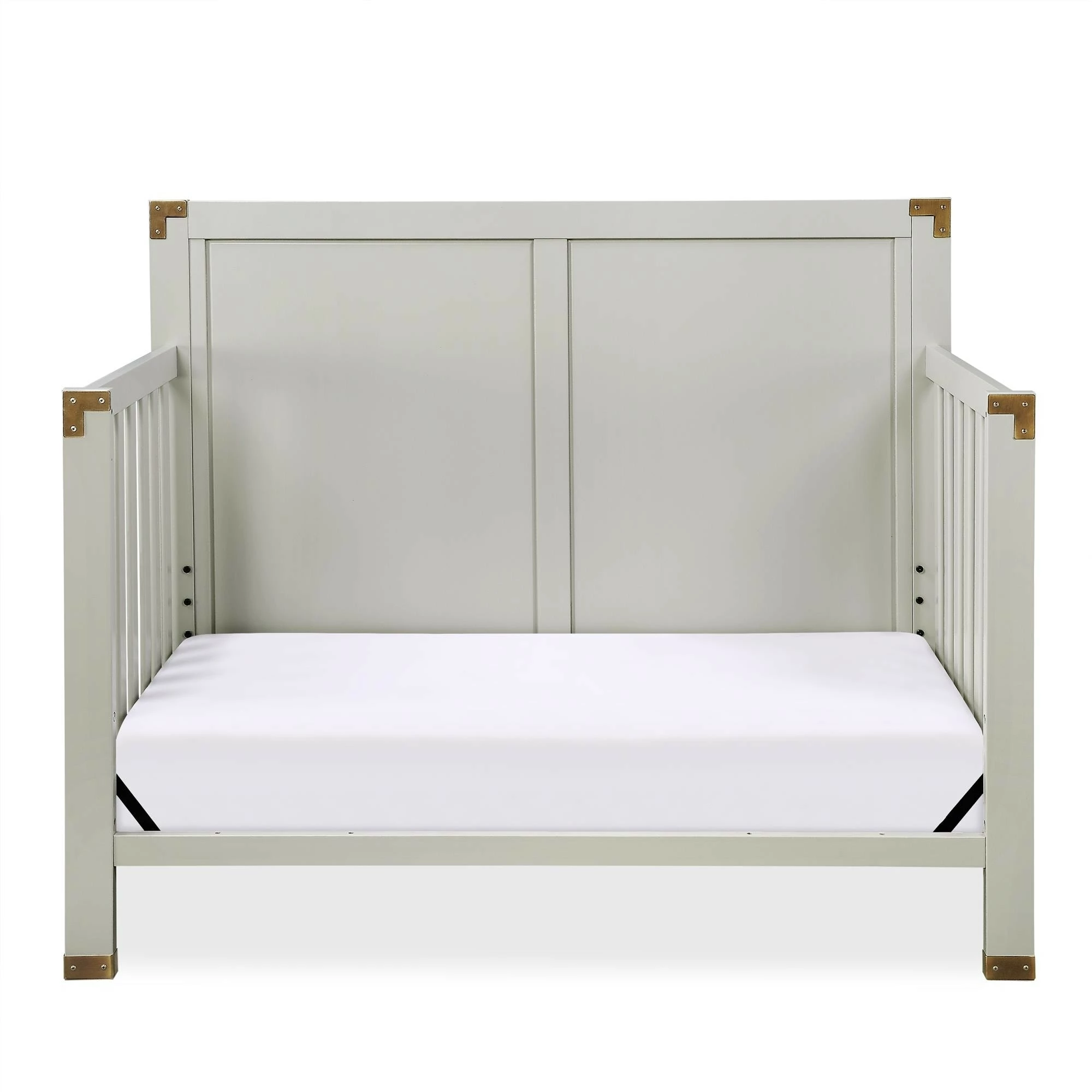 Create a space that is fun and sophisticated with the delightful Jordan 5-in-1 Convertible Crib by Avenue Greene. Combining campaign and modern style, this charismatic crib is crafted with a sturdy wood construction and features a full panel headboard, vertical slats footboard and simple post style legs. Sleek and safe, this crib comes equipped with four mattress positions that allow you to adjust the height of the platform as your child grows. When your child is ready, the Jordan conveniently converts from a crib to a daybed, toddler bed and finally a full size bed. From functionality also sprang great design with modern features such as clean lines, a fresh classic white, graphite grey or graphite blue finish, and campaign style inspired aged brass decor metal plates that accent the corners of both the headboard and footboard. Combine the Jordan 5-in-1 Convertible Crib with the rest of the Avenue Greene Jordan collection to design a playfully sophisticated nursery room that will live, move and grow alongside your child.