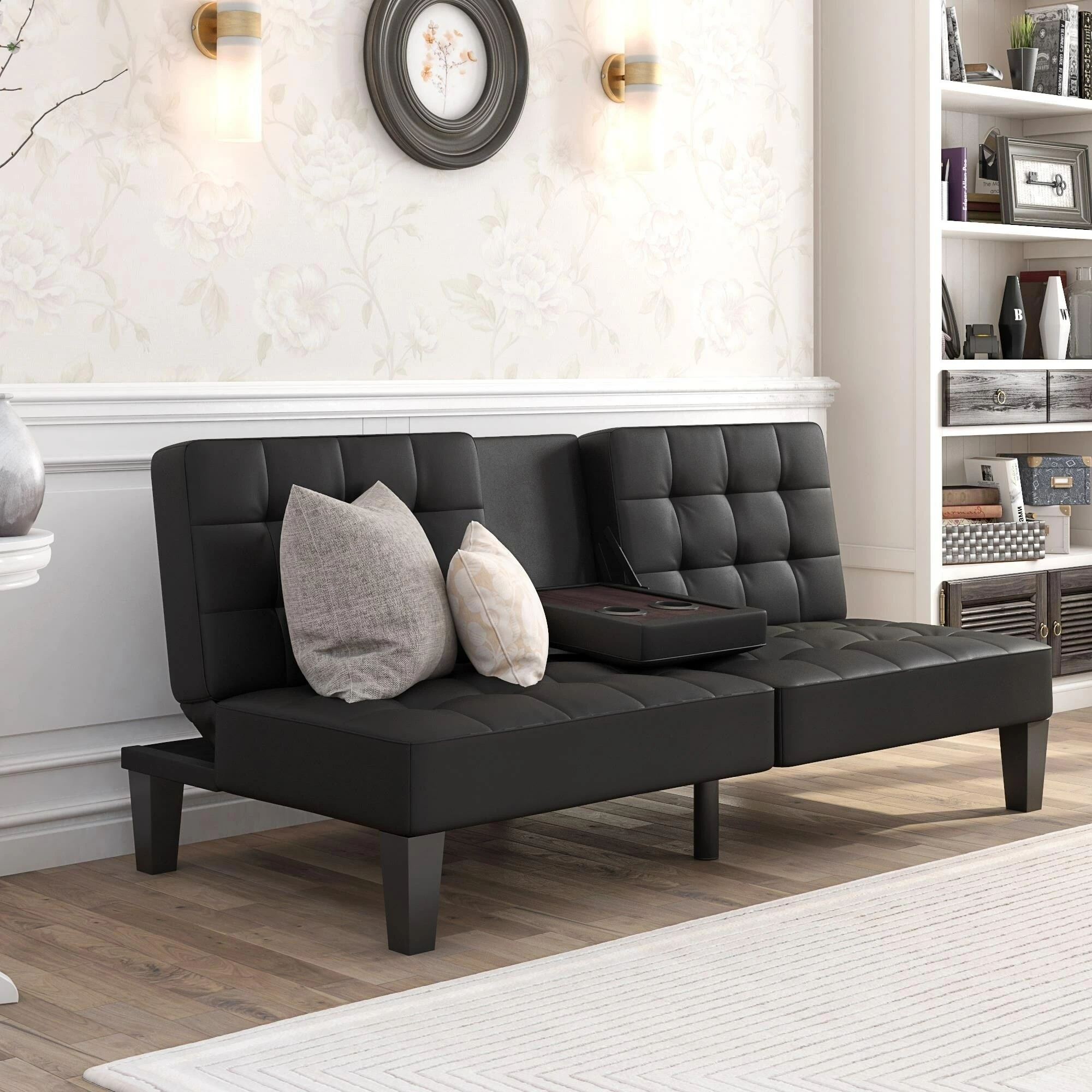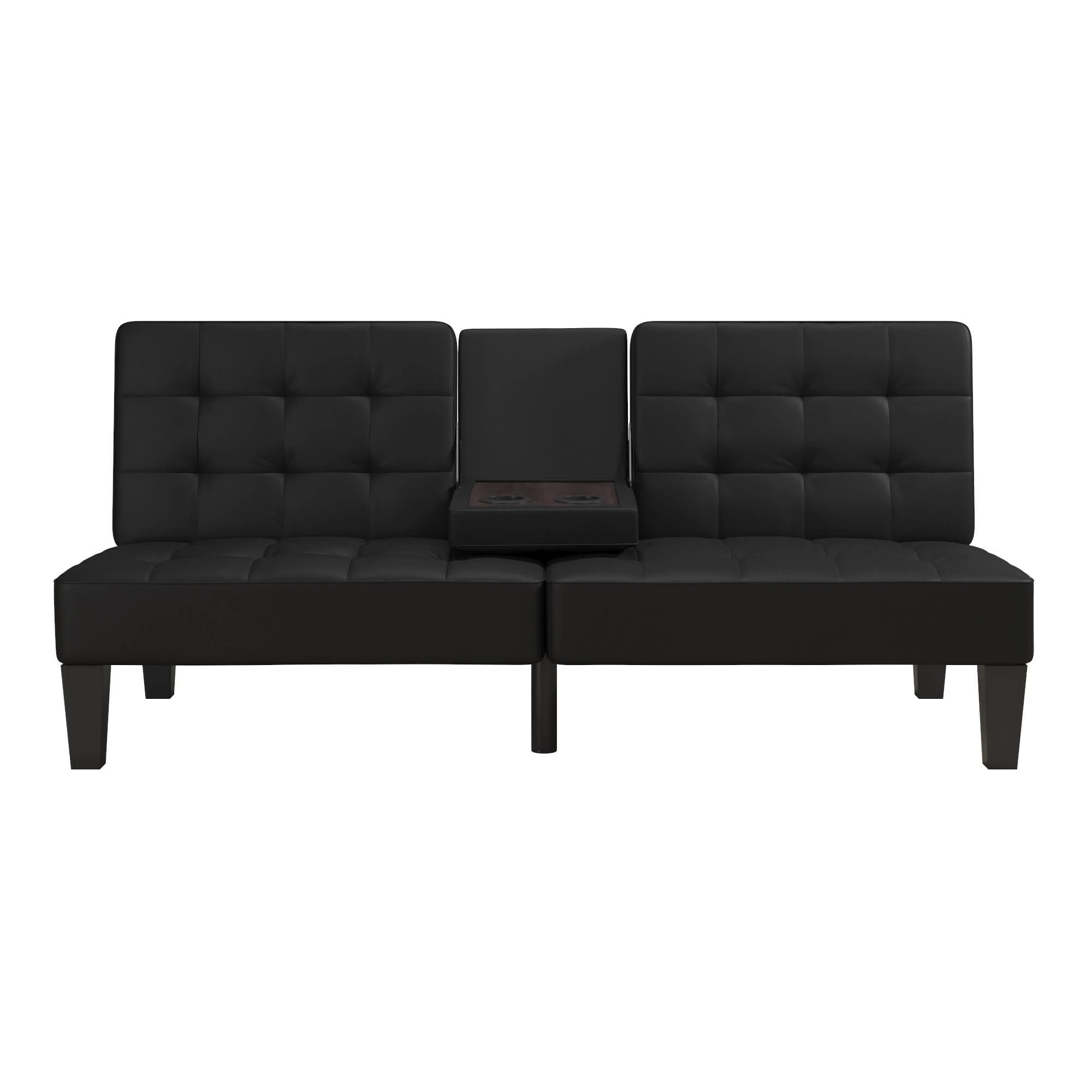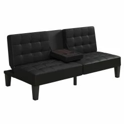 - Multi-position futon for convenient and easy conversion from sofa, to lounger, and to sofa bed. Fold-down cup holder tray that fits two glasses and snacks.
