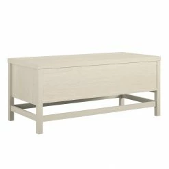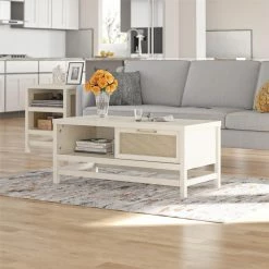 Give your living room a boho-chic upgrade with the Avenue Greene Leeds Coffee Table. The spacious tabletop will keep remotes, snacks, and other movie night essentials within reach. The sliding door creates both concealed and open storage for electronics and reading materials to keep your tabletop clutter-free. Made of laminated MDF and particleboard, the off-white woodgrain finish pairs with the faux rattan door insert for a fun coastal feel. Complete the look with the entire Leeds Collection. (sold separately) The Coffee Table ships flat to your door and requires assembly upon opening. Two adults are recommended to assemble. Once assembled, the Coffee Table measures to be 18.03″H x 41.61″W x 19.49″D.