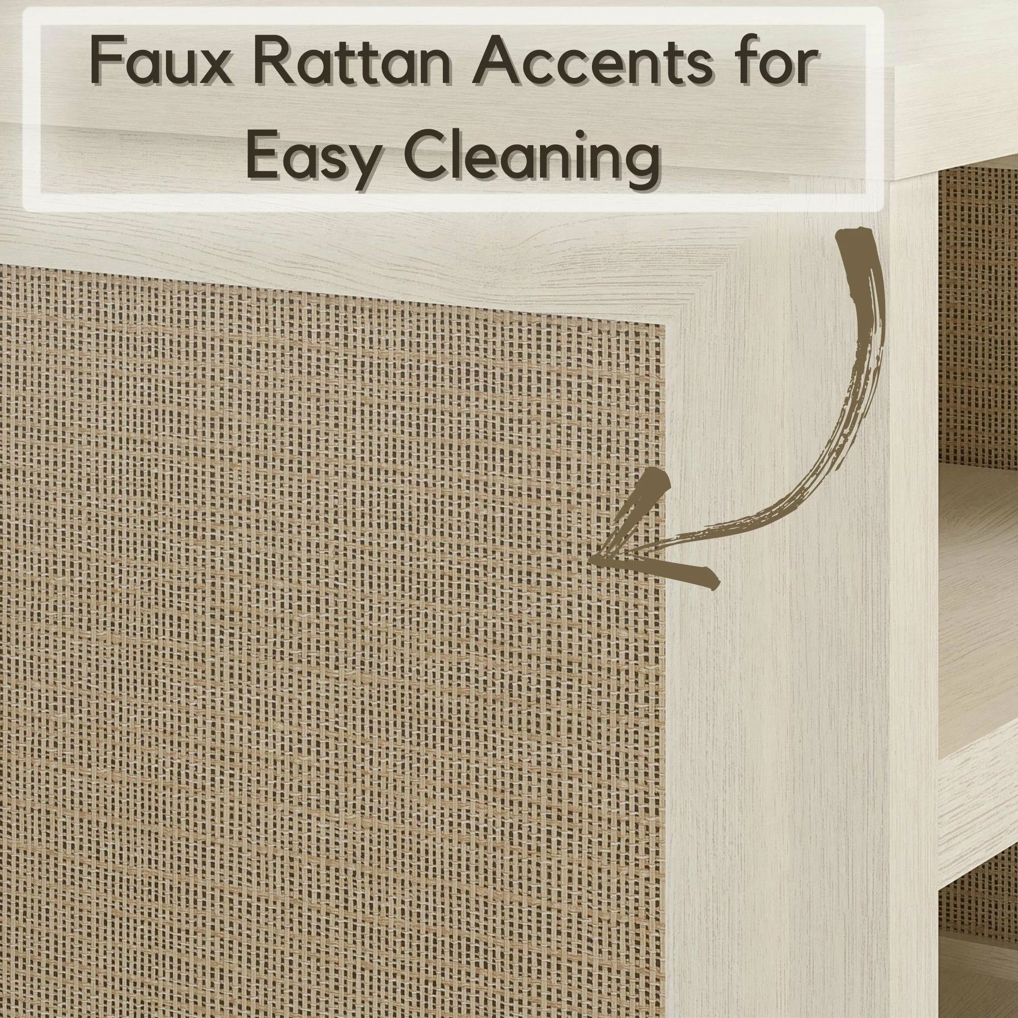 - Made of laminated MDF and particleboard, the off-white woodgrain finish pairs with the faux rattan side panels for a fresh look