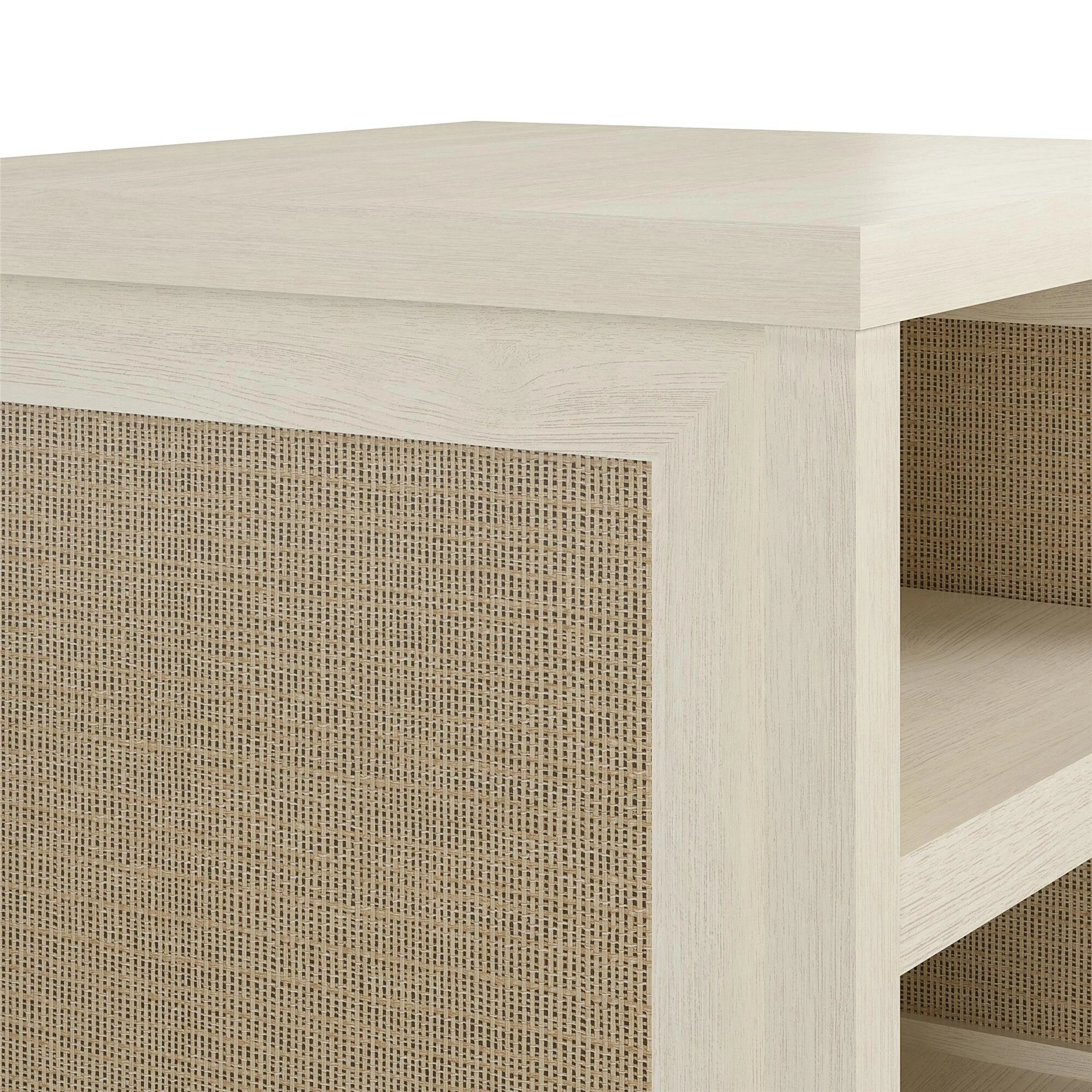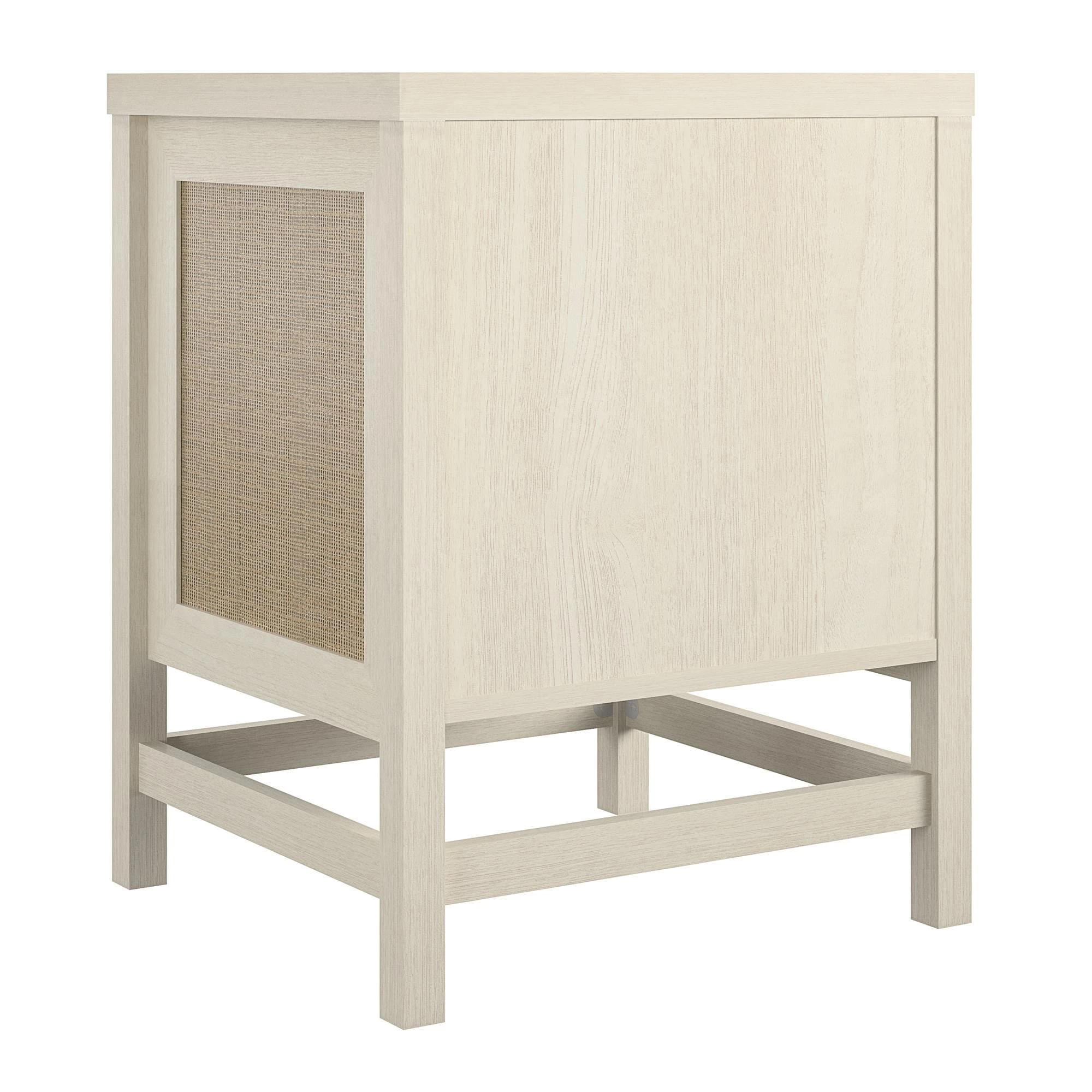 - Made of laminated MDF and particleboard, the off-white woodgrain finish pairs with the faux rattan side panels for a fresh look