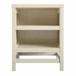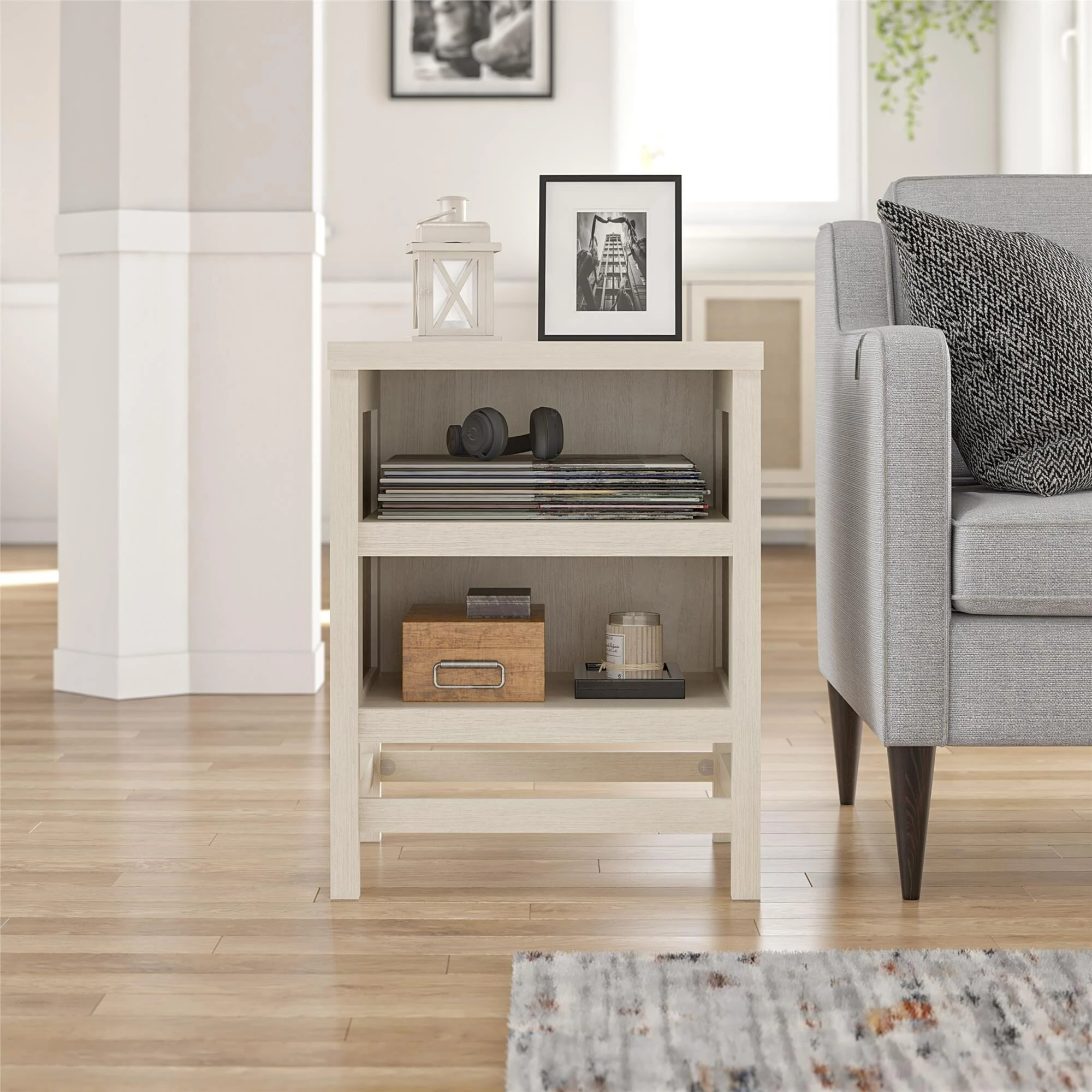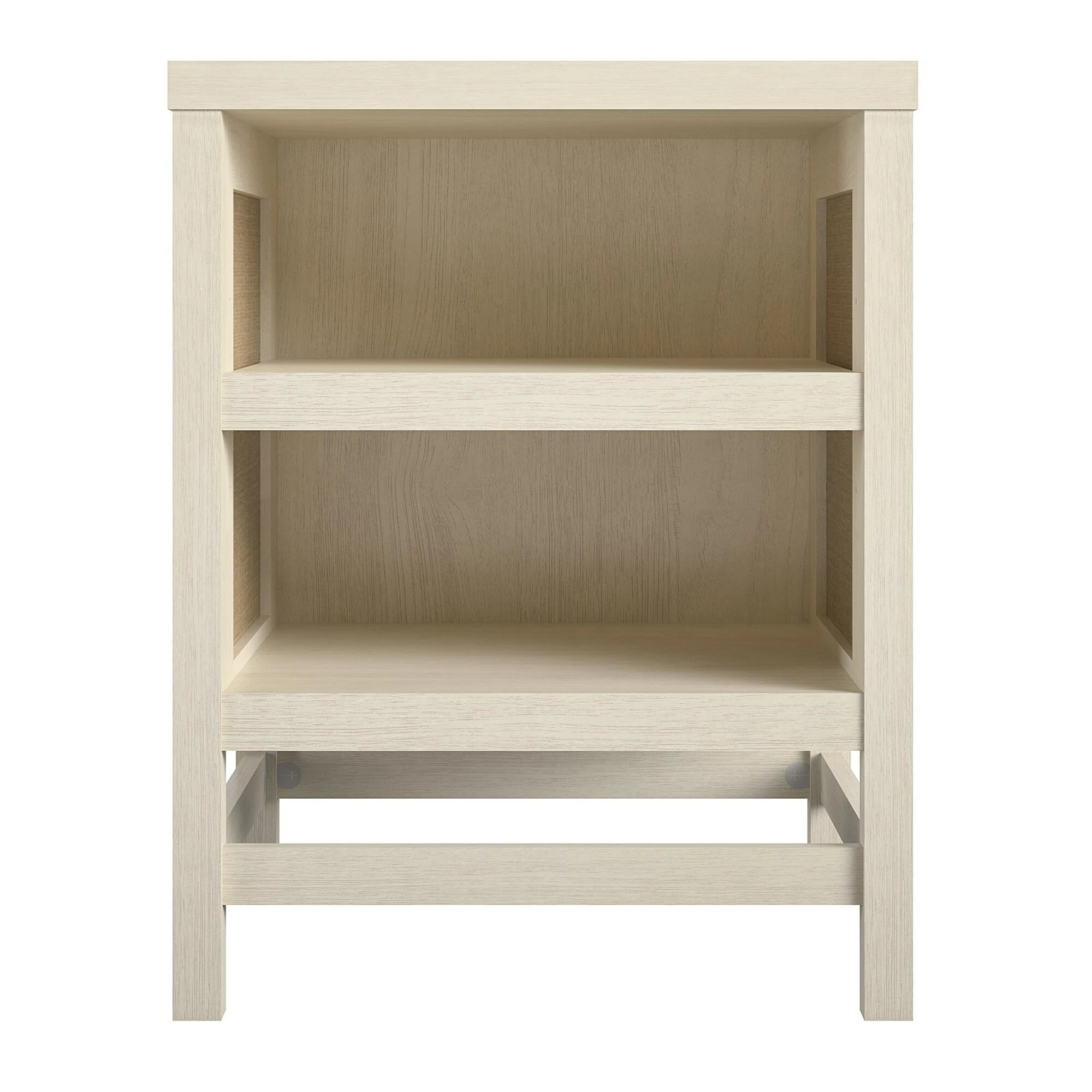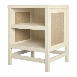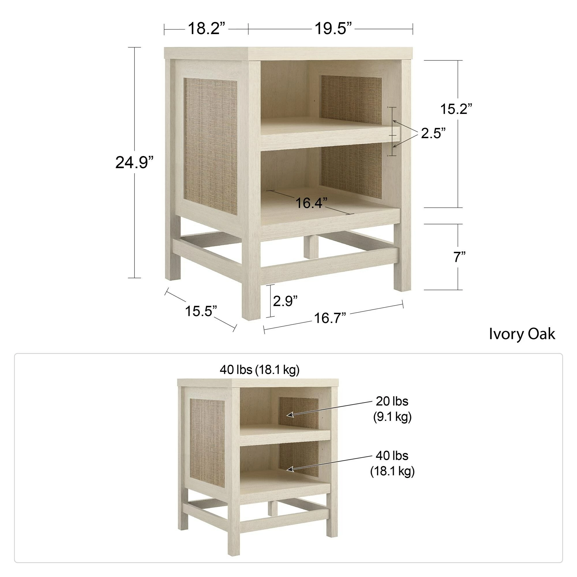 Give your living room a boho-chic upgrade with the Avenue Greene Leeds End Table. The tabletop will keep remotes, snacks, and other movie night essentials within reach. The 2 open shelves, 1 adjustable, are perfect for electronics and reading materials to keep your tabletop clutter-free. Made of laminated MDF and particleboard, the off-white woodgrain finish pairs with the faux rattan side panels for a fun coastal feel. ย Complete the look with the entire Leeds Collection (sold separately) The End Table ships flat to your door and requires assembly upon opening. Two adults are recommended to assemble. Once assembled, the End Table measures to be 24.96″H x 19.49″W x 18.23″D.