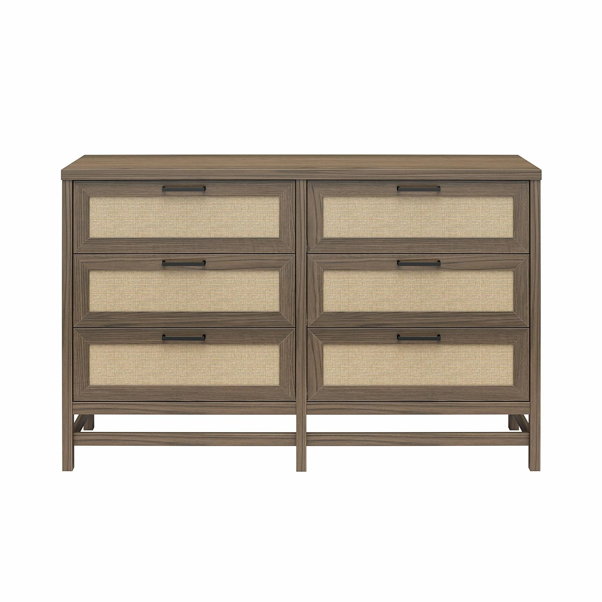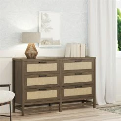 Clean up the clutter in your closet with the boho-chic Avenue Greene Leeds 6 Drawer Dresser. The 6 drawers can store away t-shirts, socks, and jeans to free up space in your closet. Each drawer features durable metal slides for a smooth gliding drawer. Made of laminated MDF and particleboard, the warm brown woodgrain finish pairs with the faux rattan drawer fronts for a fun coastal look. A wall anchor kit is included to secure the Dresser to the wall and prevent tipping injuries. The Dresser ships flat to your door and requires assembly upon opening. Two adults are recommended to assemble. Once assembled, the Dresser measures to be 37.28″H x 59.37″W x 15.67″D.