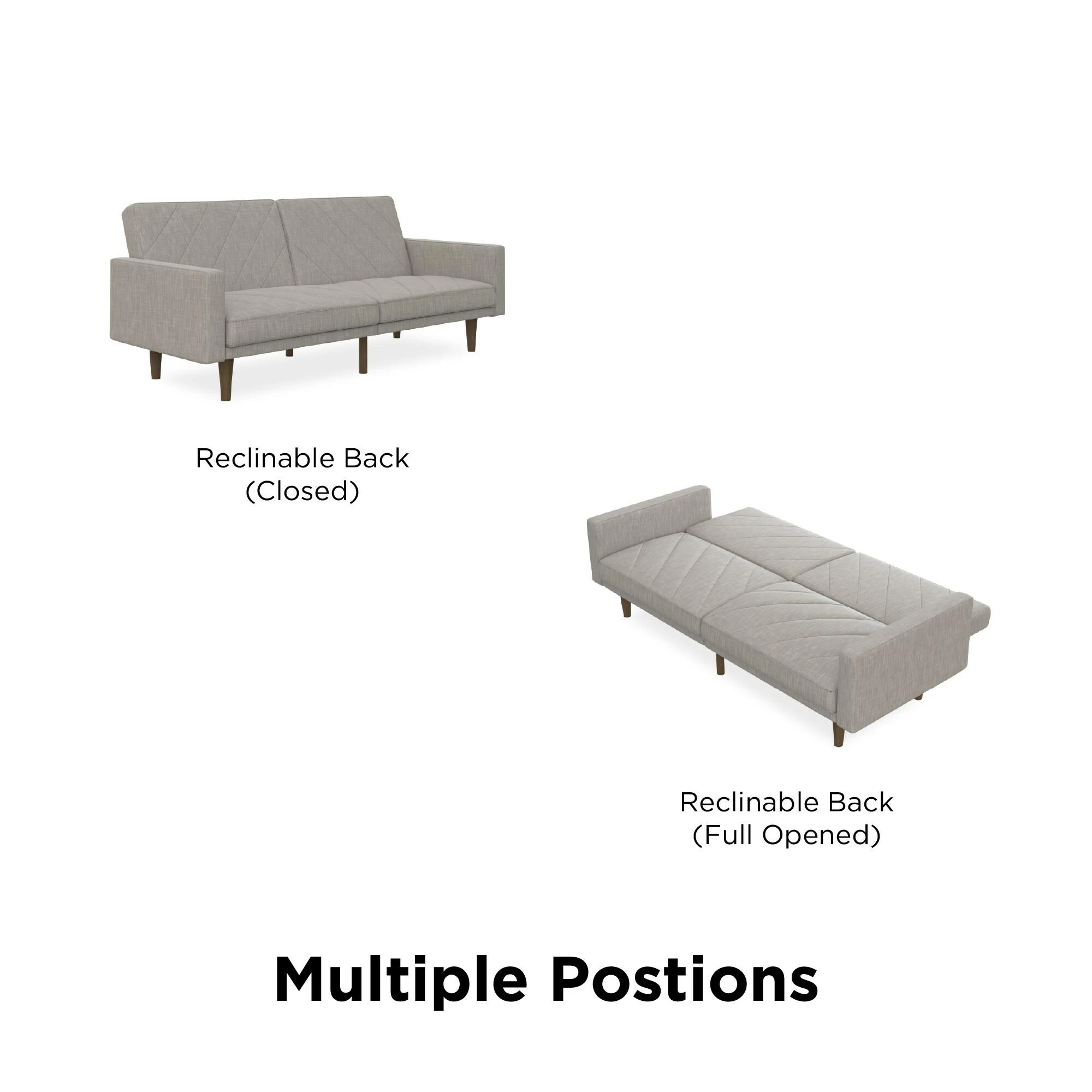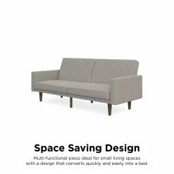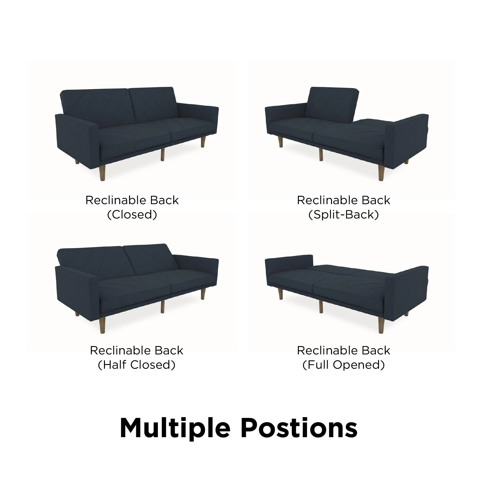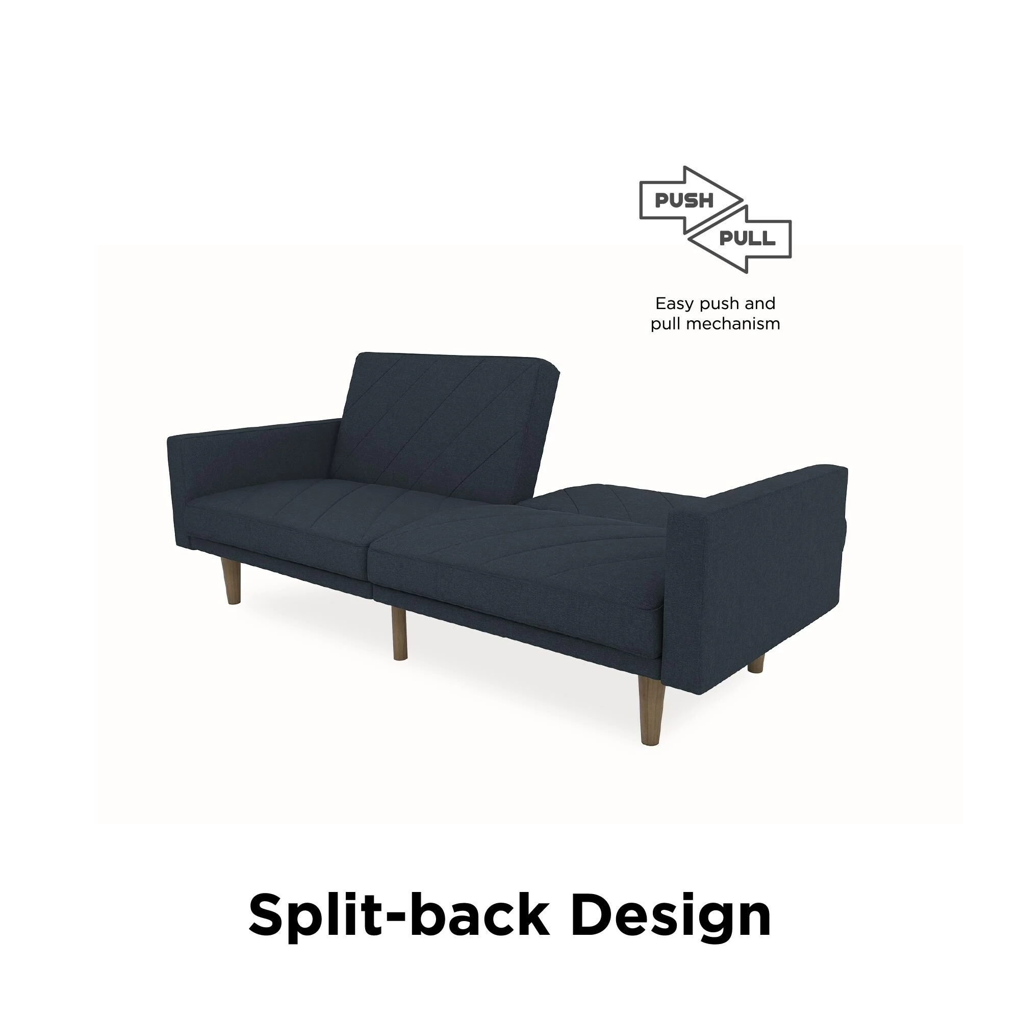 Furnish a small space in attractive multi-functionality with the addition of this linen-upholstered futon. Mid-century styling lends your home a hip vibe, and the split back provides versatile positioning while reading or watching television. This futon features fuss-free conversion for sleeping, and padded feet protect your floors from scratches.