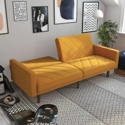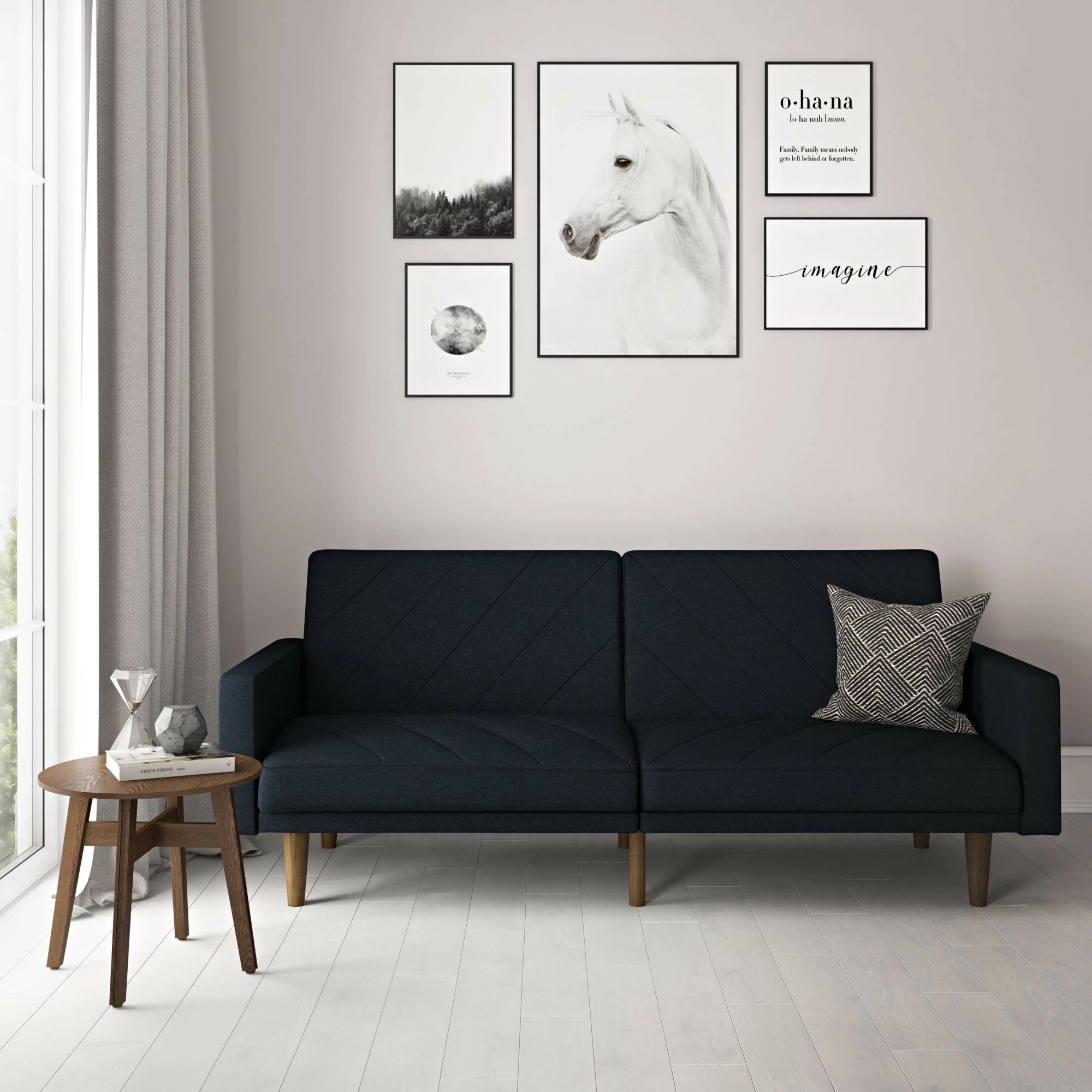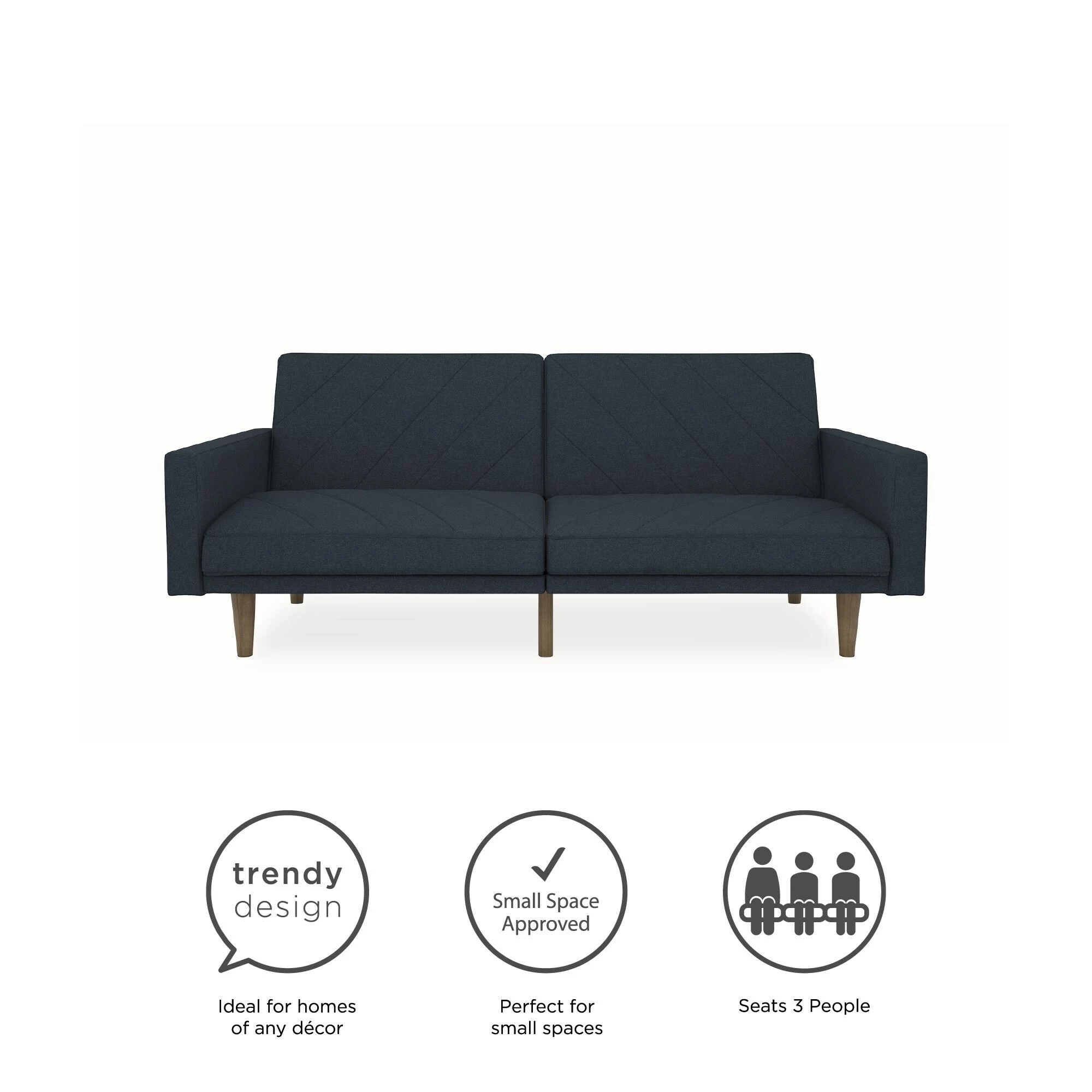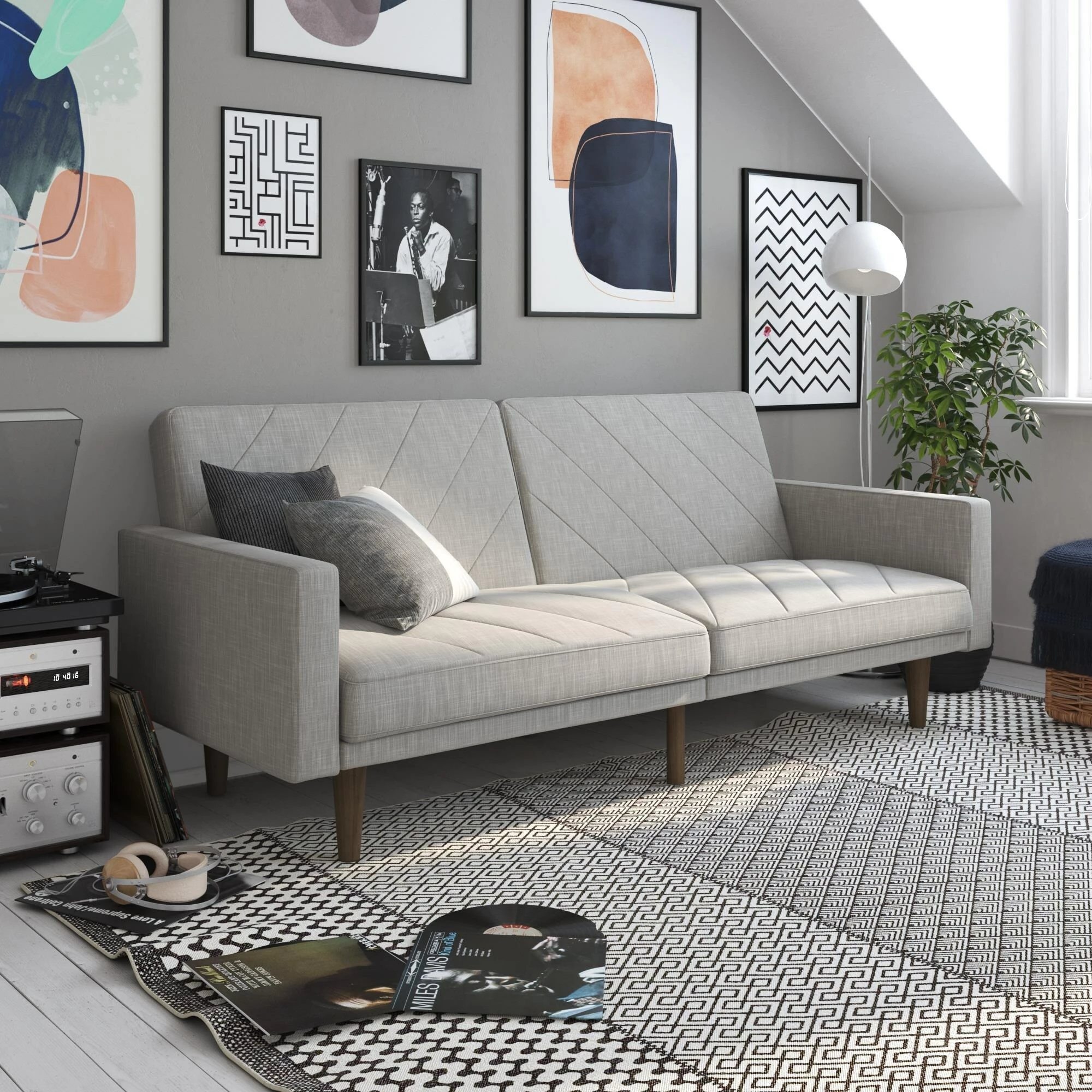 Furnish a small space in attractive multi-functionality with the addition of this linen-upholstered futon. Mid-century styling lends your home a hip vibe, and the split back provides versatile positioning while reading or watching television. This futon features fuss-free conversion for sleeping, and padded feet protect your floors from scratches.