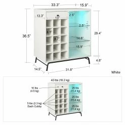 Step away from the ordinary and give your entertainment space a modern makeover with the Avenue Greene Melanie Bar Cabinet. This Beverage Cabinet features LED lighting with 7 different color settings for a fun and funky look for your entertainment space. But the modern touches don’t stop there. The 3 open shelves, 2 glass, can organize glasses, tumblers, and mixers so you have everything you need to get the party started. The 15 open bottle cubbies will offer plenty of space to organize your wine and liquor bottles. The drawer is perfect for storing away utensils, napkins, and other party supplies. This Cabinet has a mix of laminated particleboard and MDF with metal feet and tempered glass shelving. Combined together this Cabinet makes for a very sturdy addition to your room. The Cabient ships flat to your door and requires assembly upon opening. Two adults are recommended to assemble. After assembly, the Cabinet measures to be 36.5″H x 33.25″W x 15.875″D.