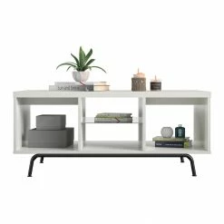 Step away from the ordinary and give your living room a modern makeover with the Avenue Greene Melanie Coffee Table. All of the shelving can be accessed from either side of the Coffee Table so you always have easy access to reading material, remotes, or other electronics. The middle shelf is made of tempered glass for a fun and modern look for your space. The 2 larger side shelves are ideal for books and magazines or displaying photos and decorations. This Table has a mix of laminated particleboard and MDF with metal feet and tempered glass shelving. Combined together this Table makes for a very sturdy addition to your room. The Table ships flat to your door and requires assembly upon opening. Two adults are recommended to assemble. After assembly, the Table measures to be 18″H x 42″W x 23.5″D.