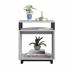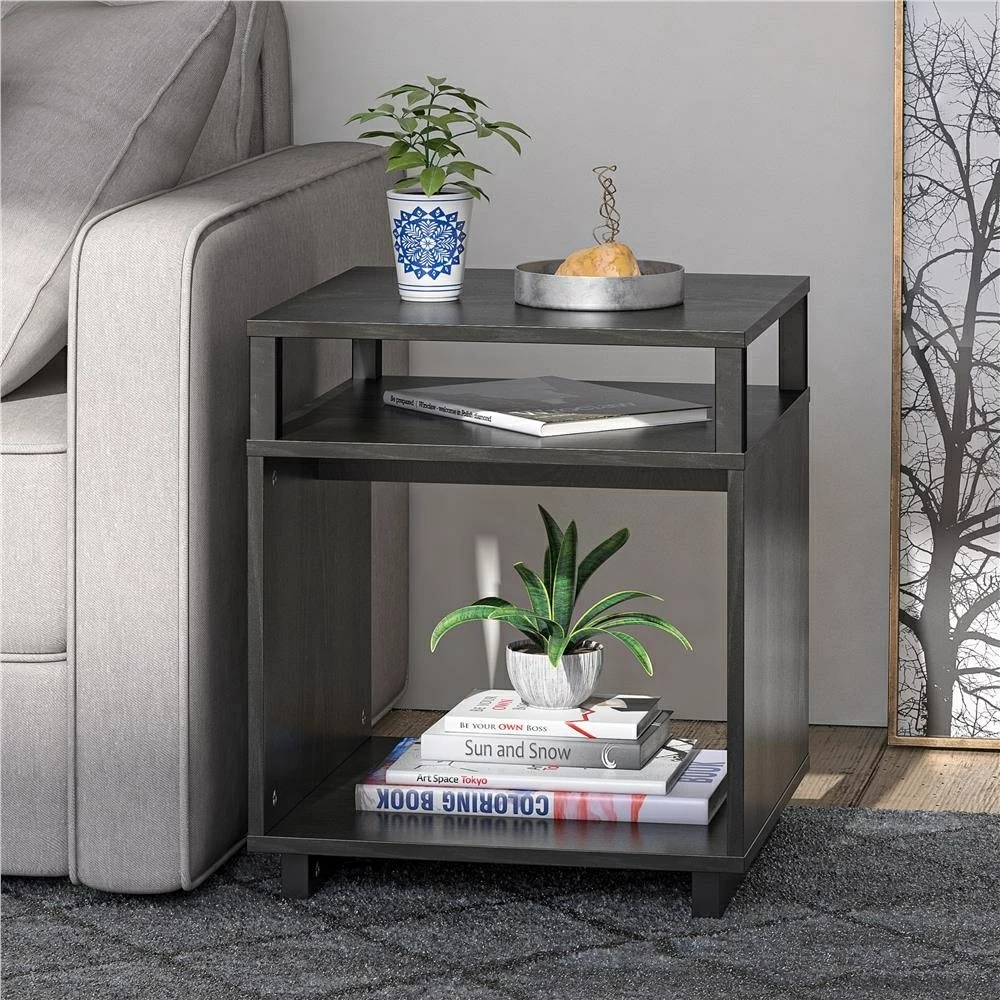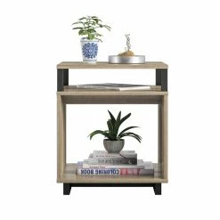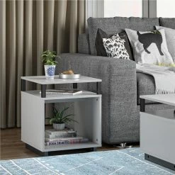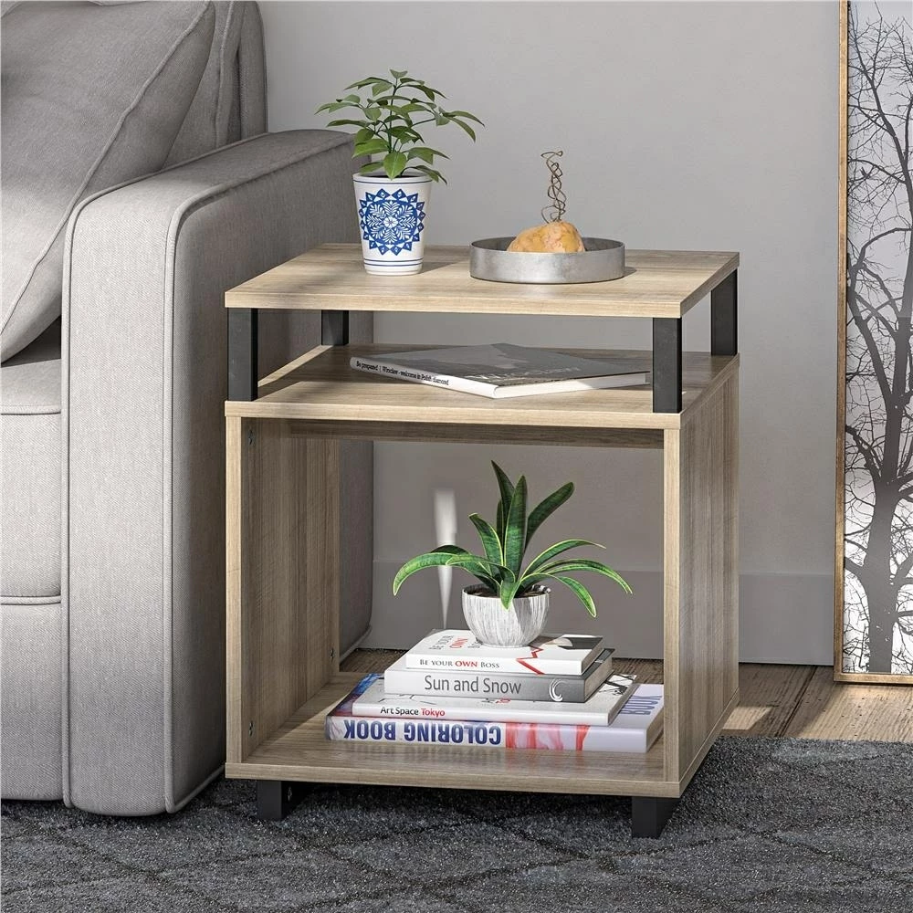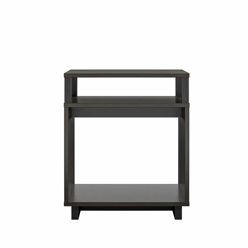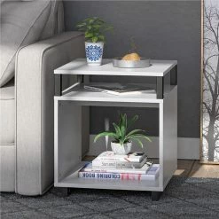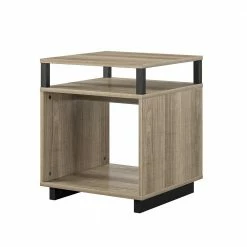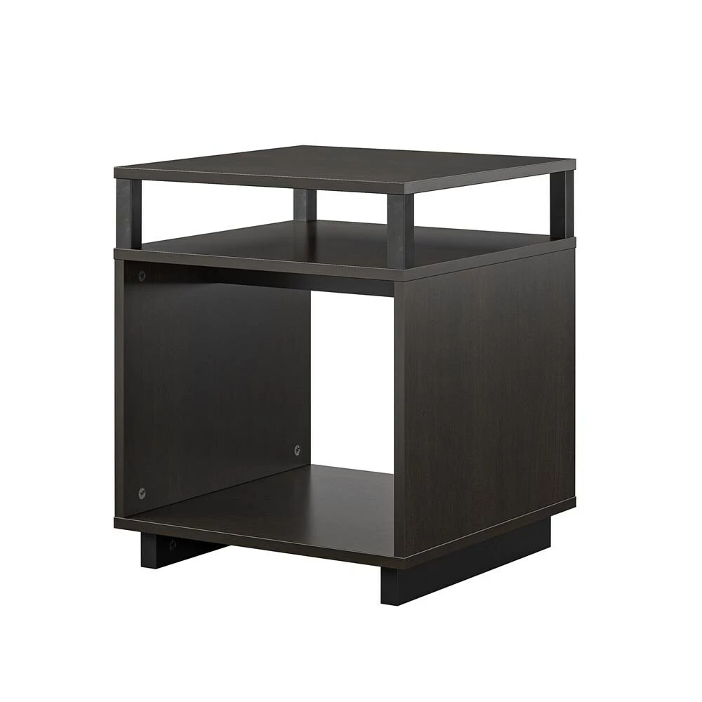 Get more table space for your living room or den with the Avenue Greene Naperville End Table. The finish on the laminated particleboard is accented by the metal accents for a contemporary feel. The table top is perfect for a reading lamp, electronics, and remotes to keep essentials within reach. The Table offers a smaller shelf and larger lower shelf to organize all of your books and magazines or to display family photos and decorations. The open back makes it easy to plug in any devices so you can keep your cell phone and hand held games charged. The End Table ships flat to your door and requires assembly upon opening. Two adults are recommended to assemble. Once assembled, the End Table measures to be 20.47?H x 17.4?W x 17.4?D.