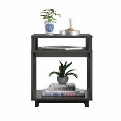 - The 2 open shelves and table top can organize all of your electronics and reading materials so you have everything you need within reach