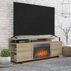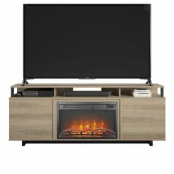 This TV stand can accommodate TVs up to 65 inches wide or 120 lbs. The finish on the laminated particleboard and metal accents give the stand a modern, updated feel, while its 23-inch electric fireplace insert flaunts a realistic flame effect that can be used with or without heat.