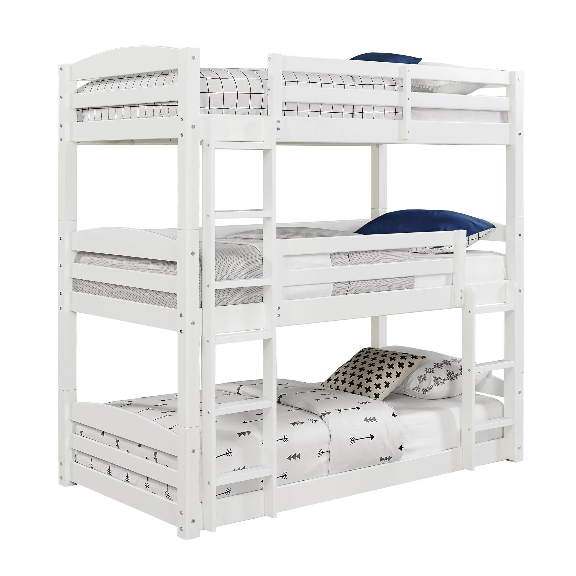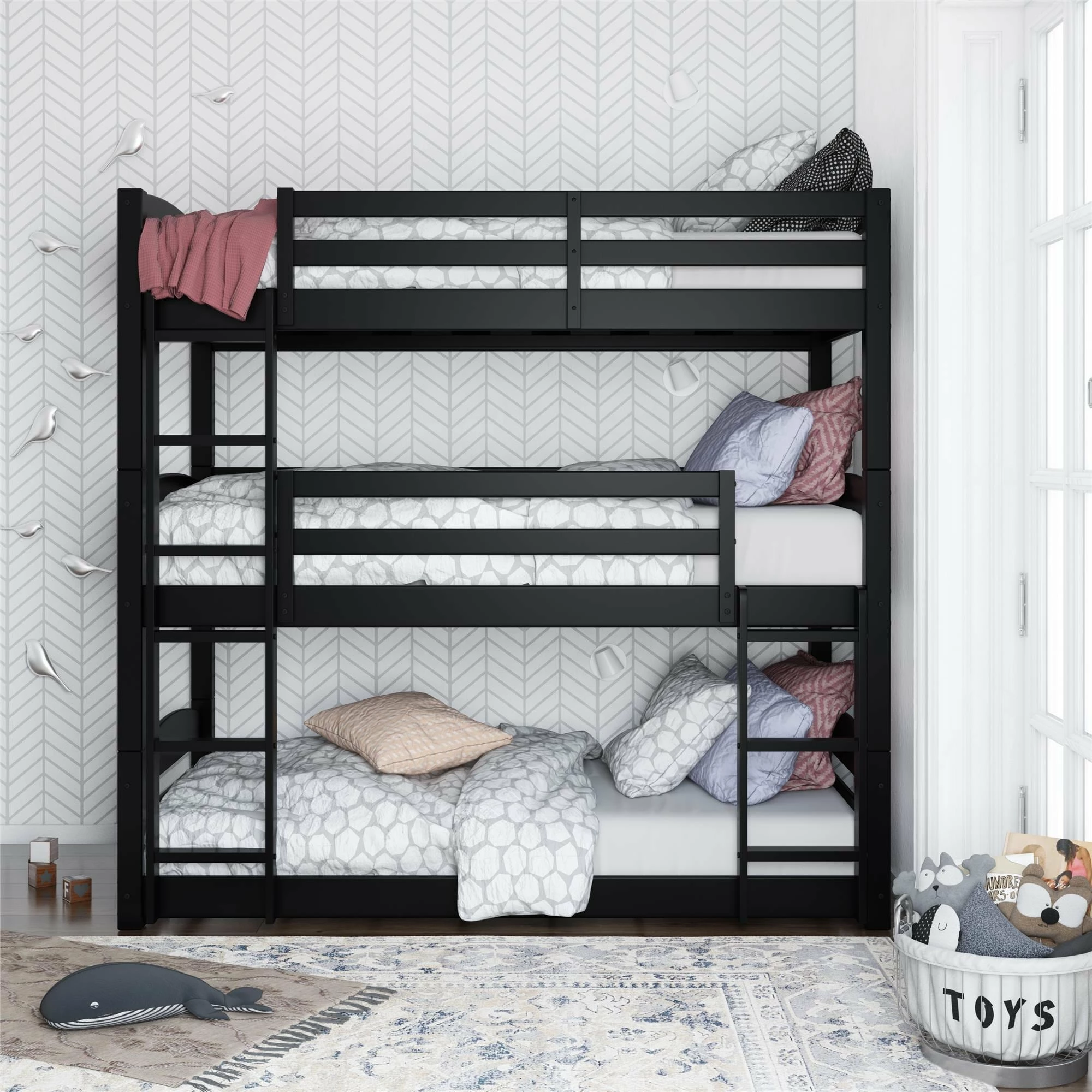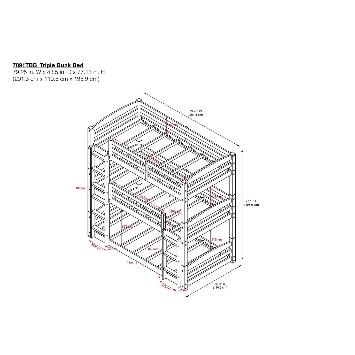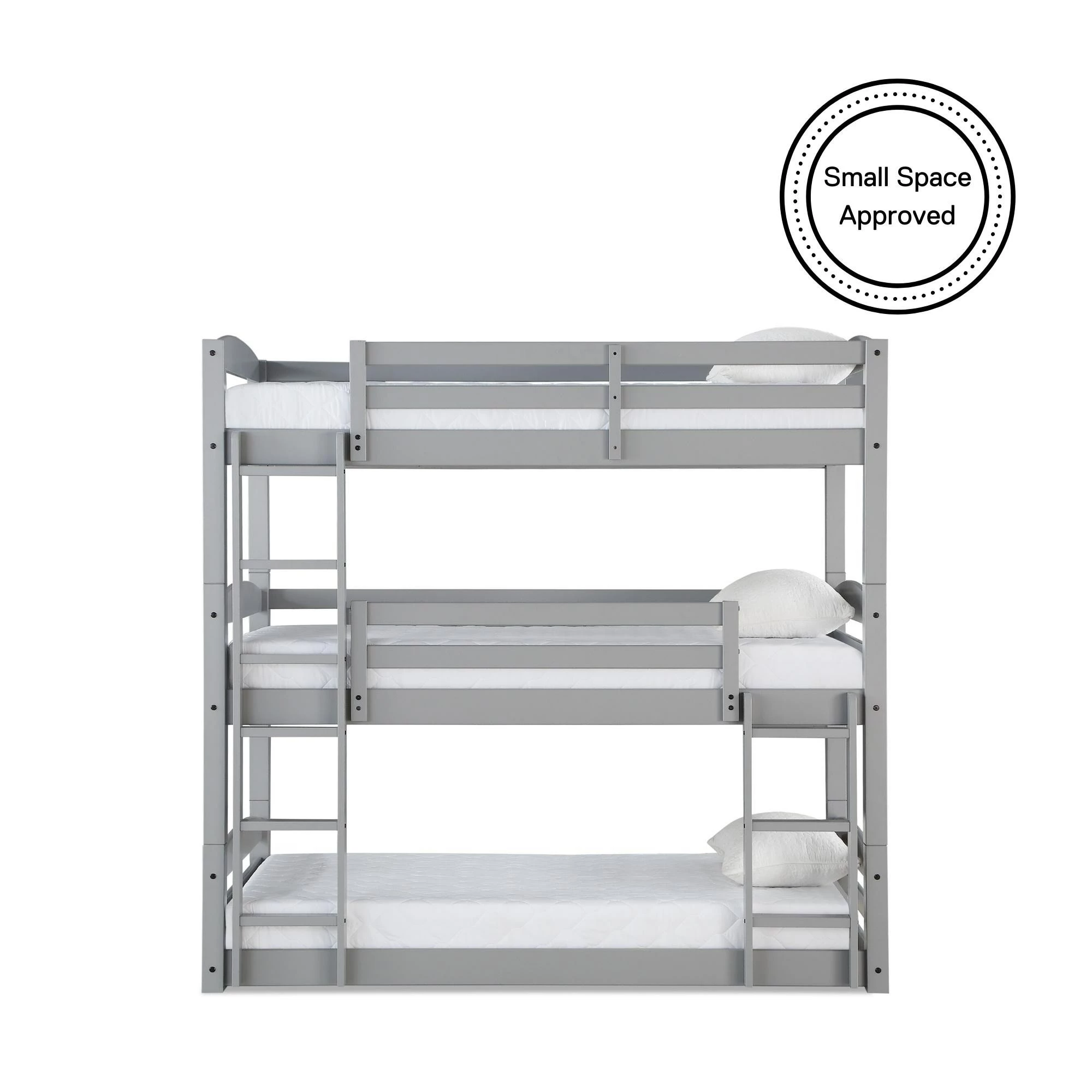 - Space-saving design triple bunk bed that is ideal for any small living space. Optimal support and safety with the built-in ladders for safe, dependable access to upper bunks.