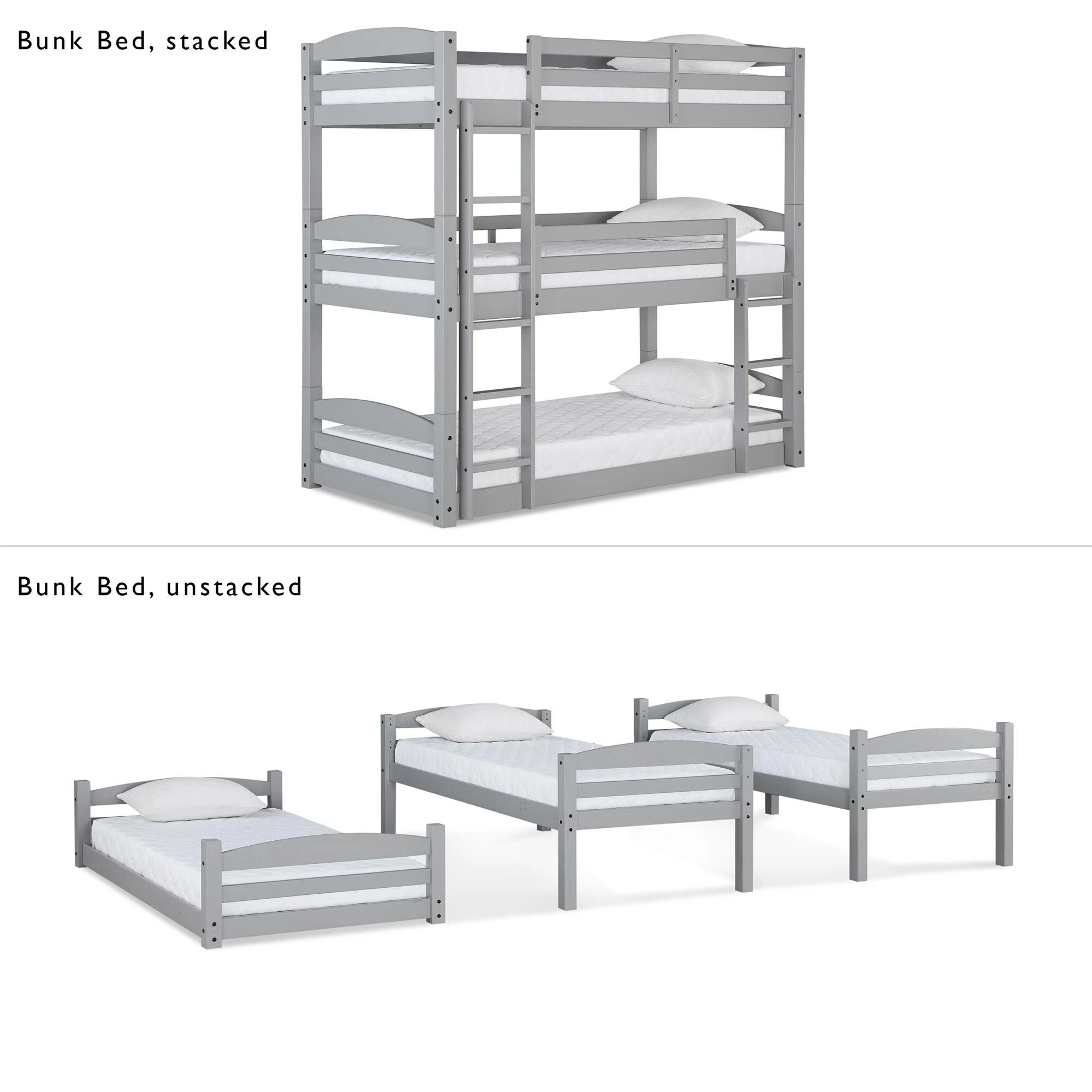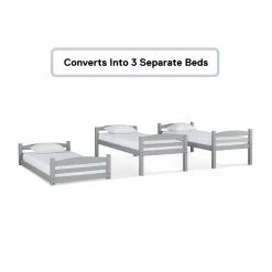 - Designed with a sturdy solid wood construction. Versatile bed with convertible feature. Can transform into a bunk bed and daybed or three stand-alone twin beds.