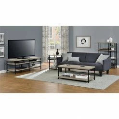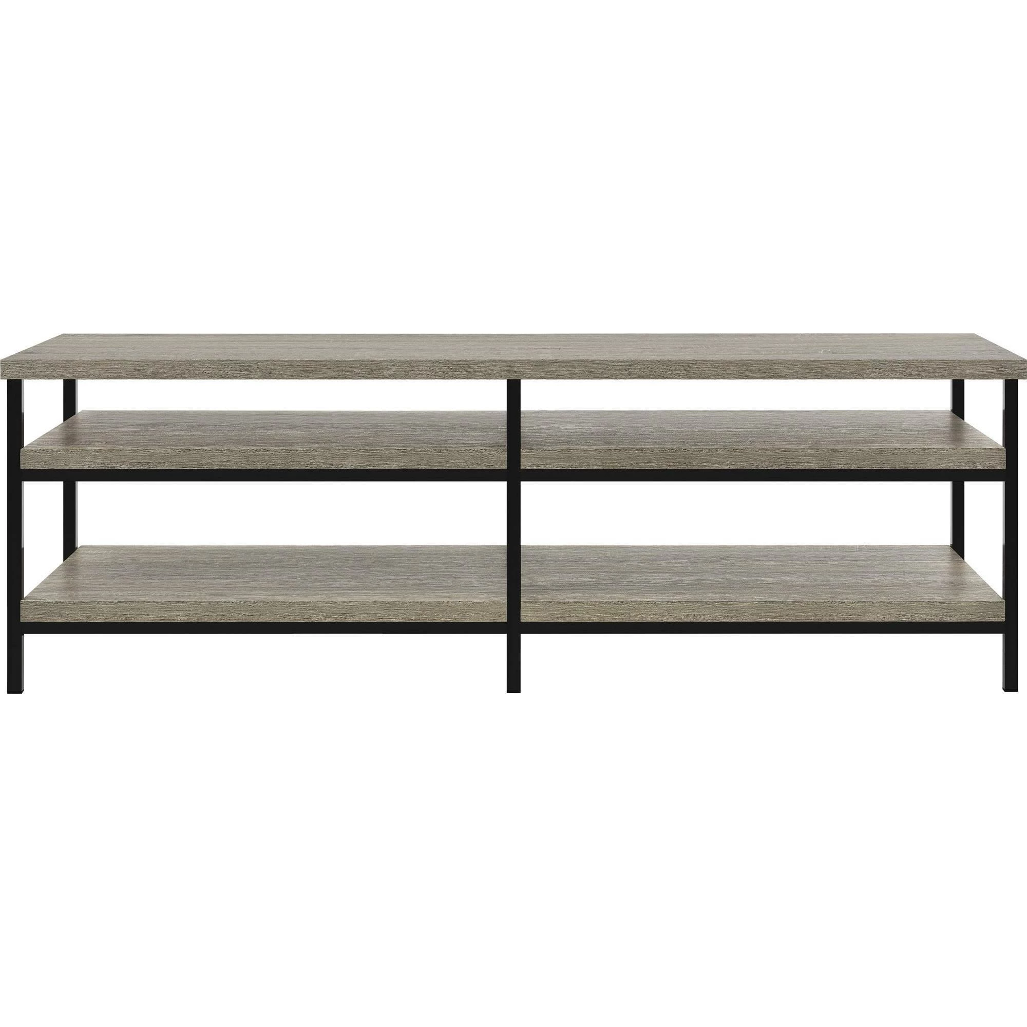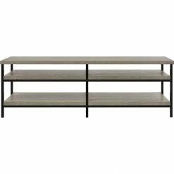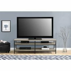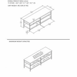 Organize all your media with the Avenue Greene Northway TV Stand. The Stand can accommodate most flat screen TVs up to 60″ wide or 100 lbs. This modern TV Stand features 4 spacious shelves to fit all of your components, from your DVD player to your gaming system. The open concept allows proper air circulation to prevent your equipment from overheating and makes plugging in devices simple. Bring this appealing design into your living room, family room or media room. Made of laminated hollow core with a powder-coated metal frame for a sturdy build that will bring an instant upgrade to any space. The TV Stand ships flat to your door and requires assembly upon opening. Two adults are recommended to assemble. Once assembled, the Stand measures to be 19.7″H x 60″W x 17.7″D.