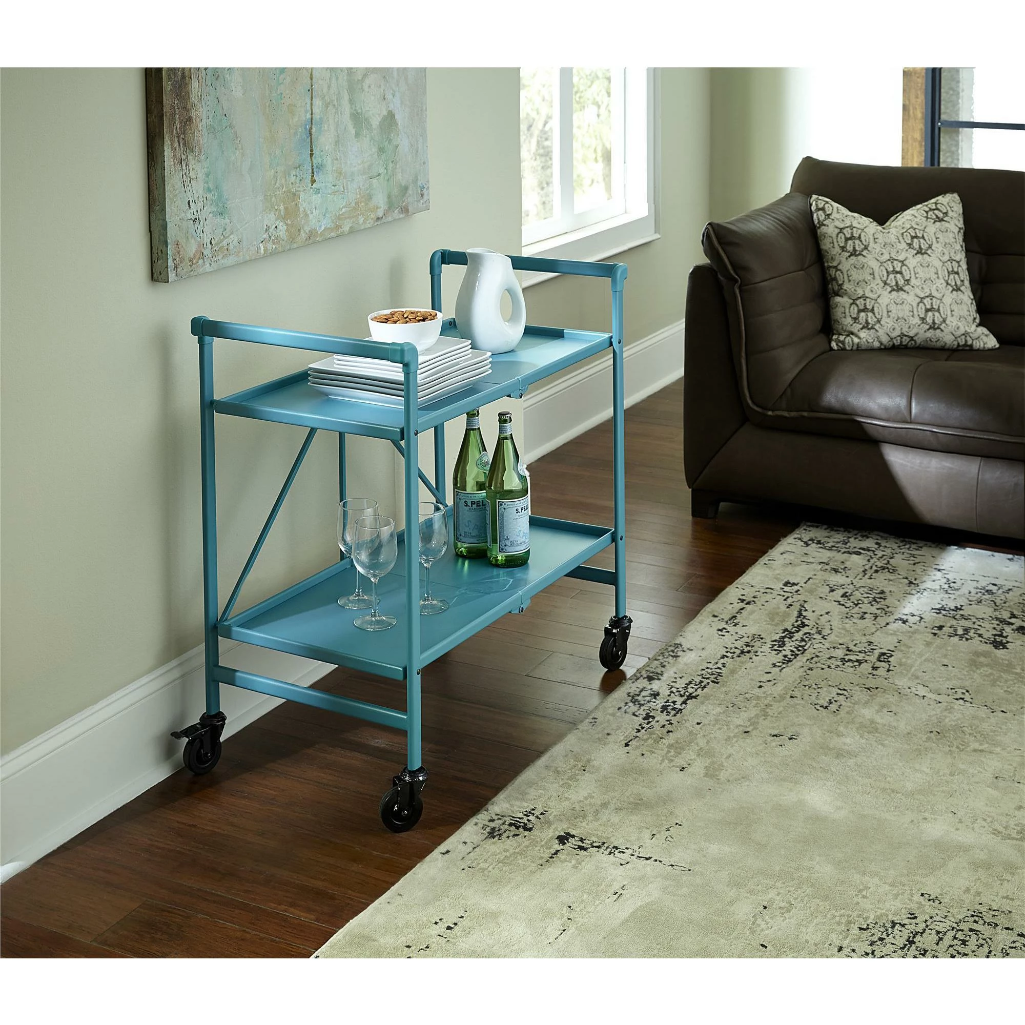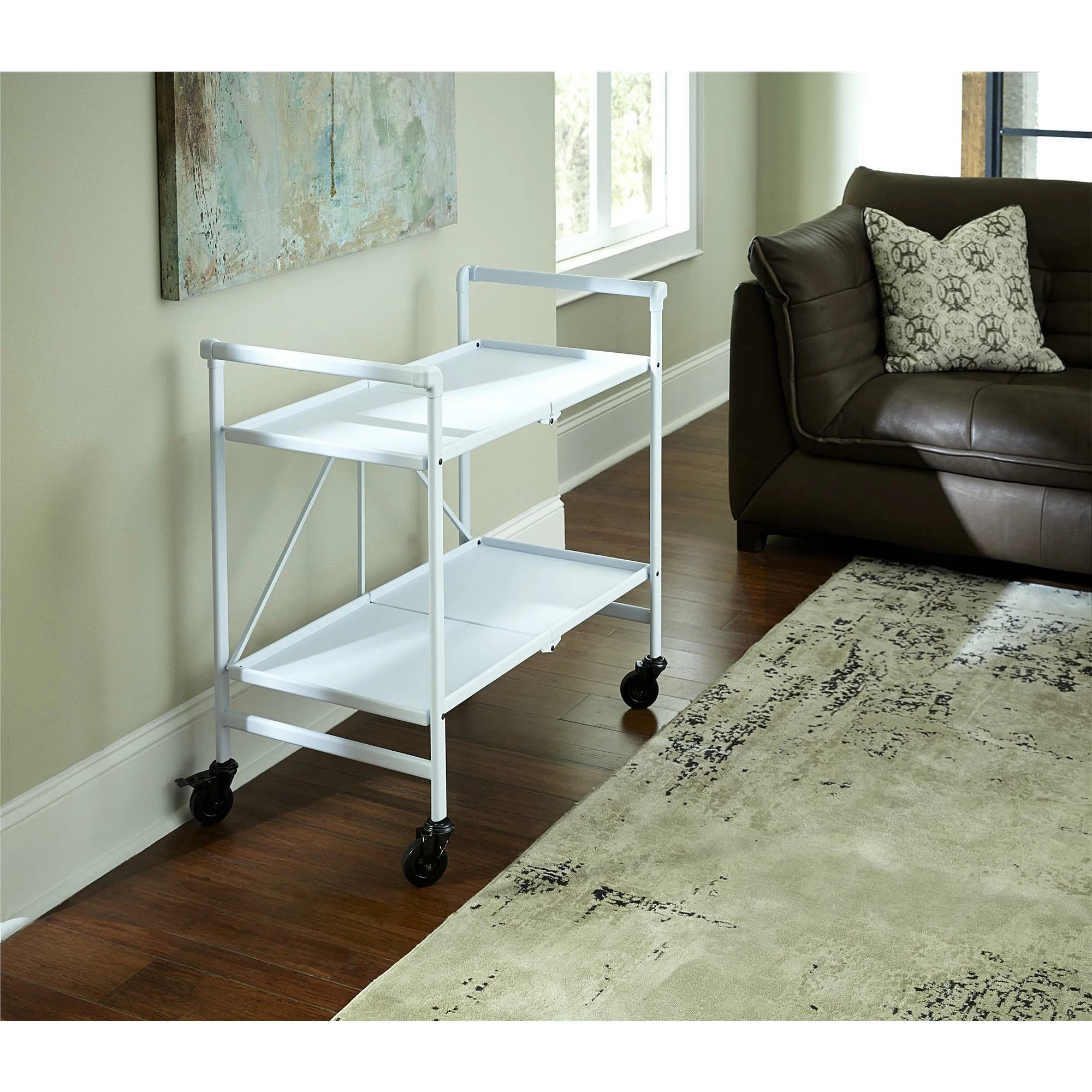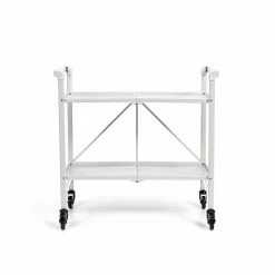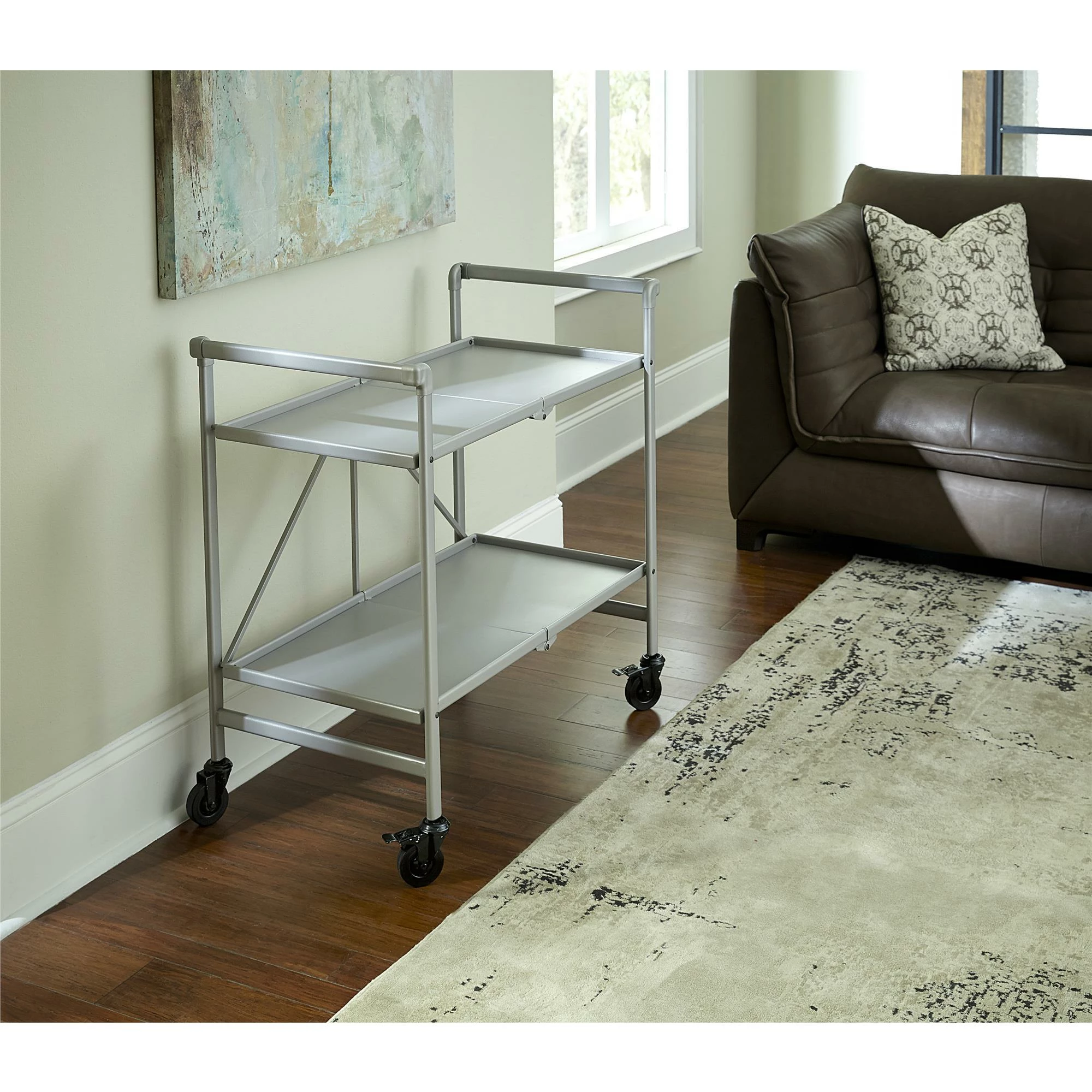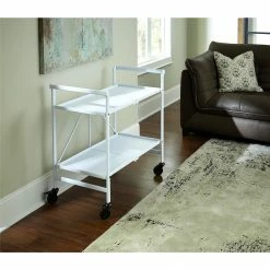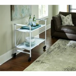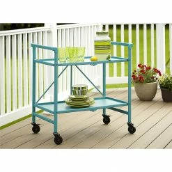 Serve your guests in any room with ease by employing this powder-coated steel serving cart on wheels. This folding cart features two solid metal shelves, each capable of holding up to 75 pounds, and it has locking casters to keep it from rolling away when you’re pouring drinks.