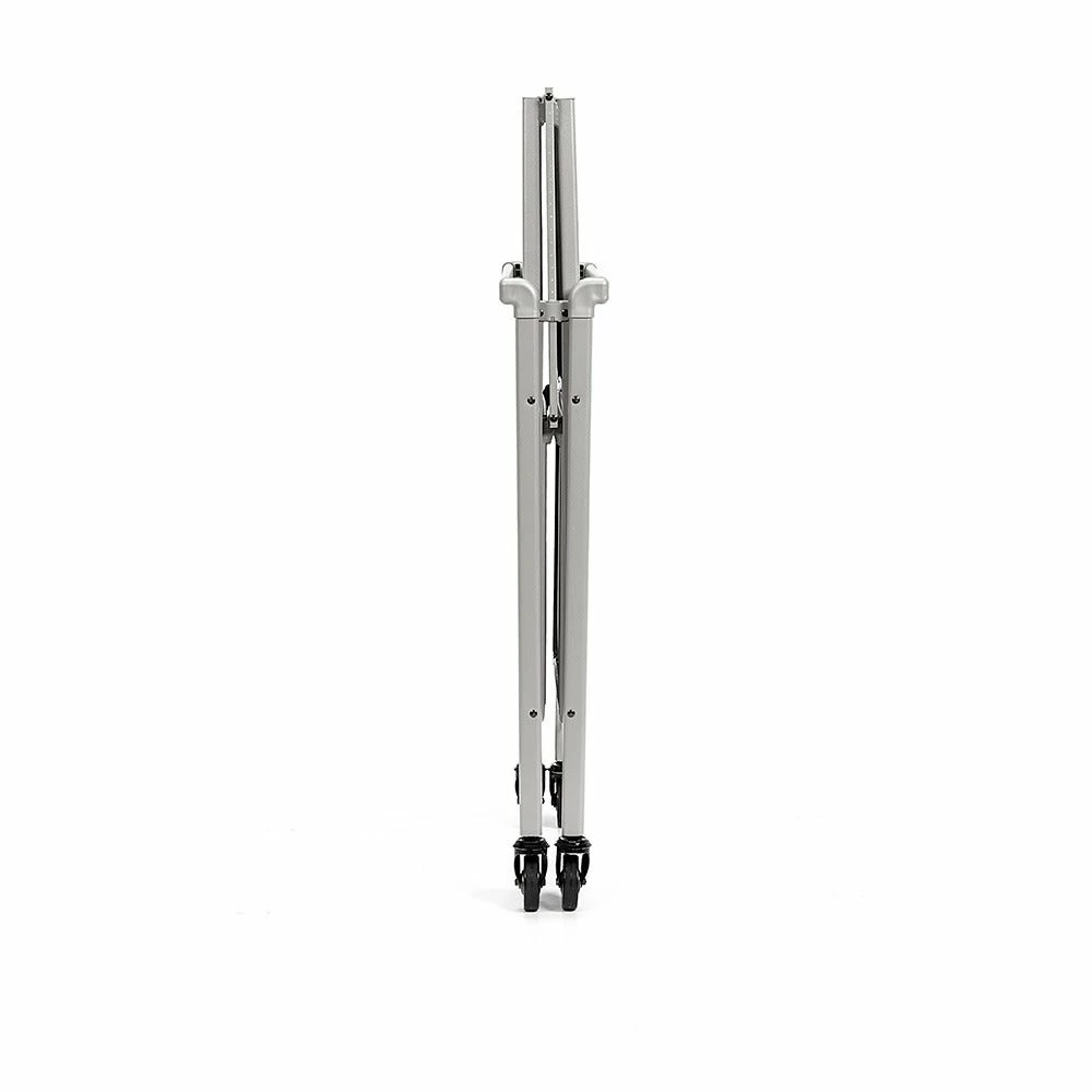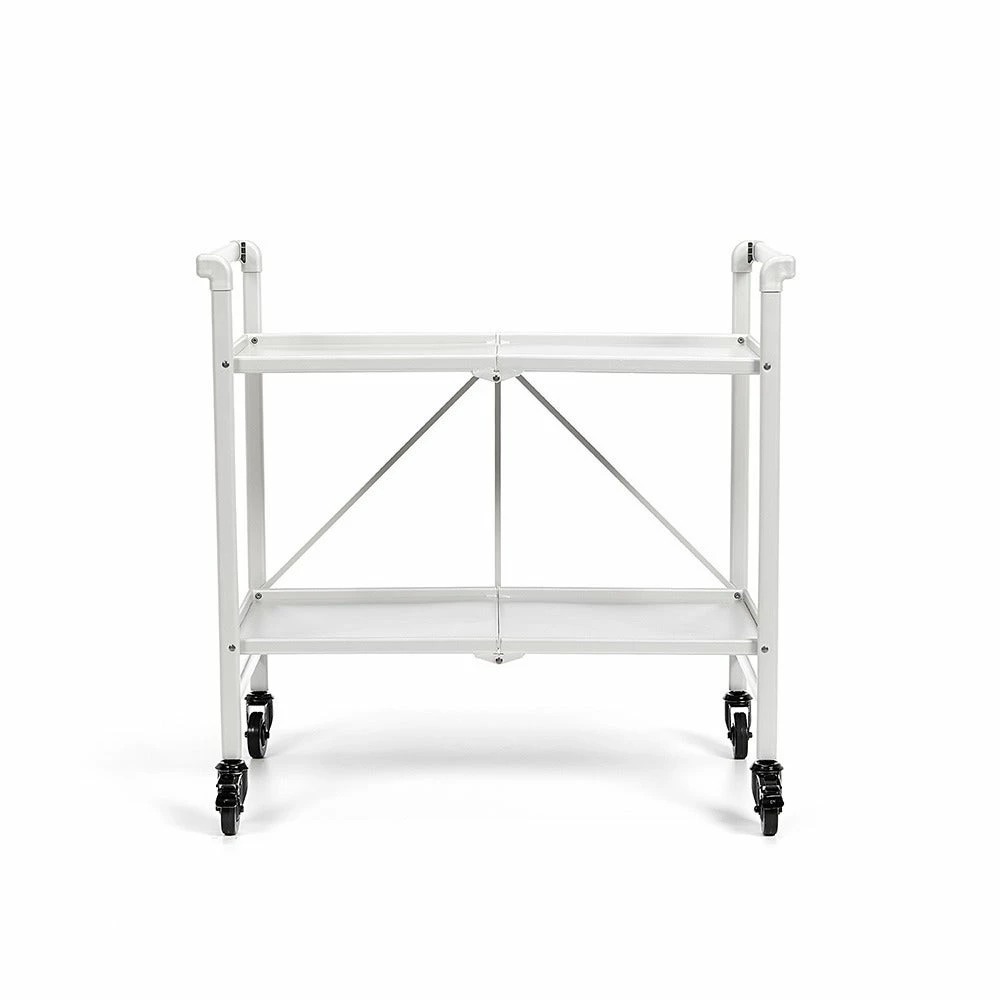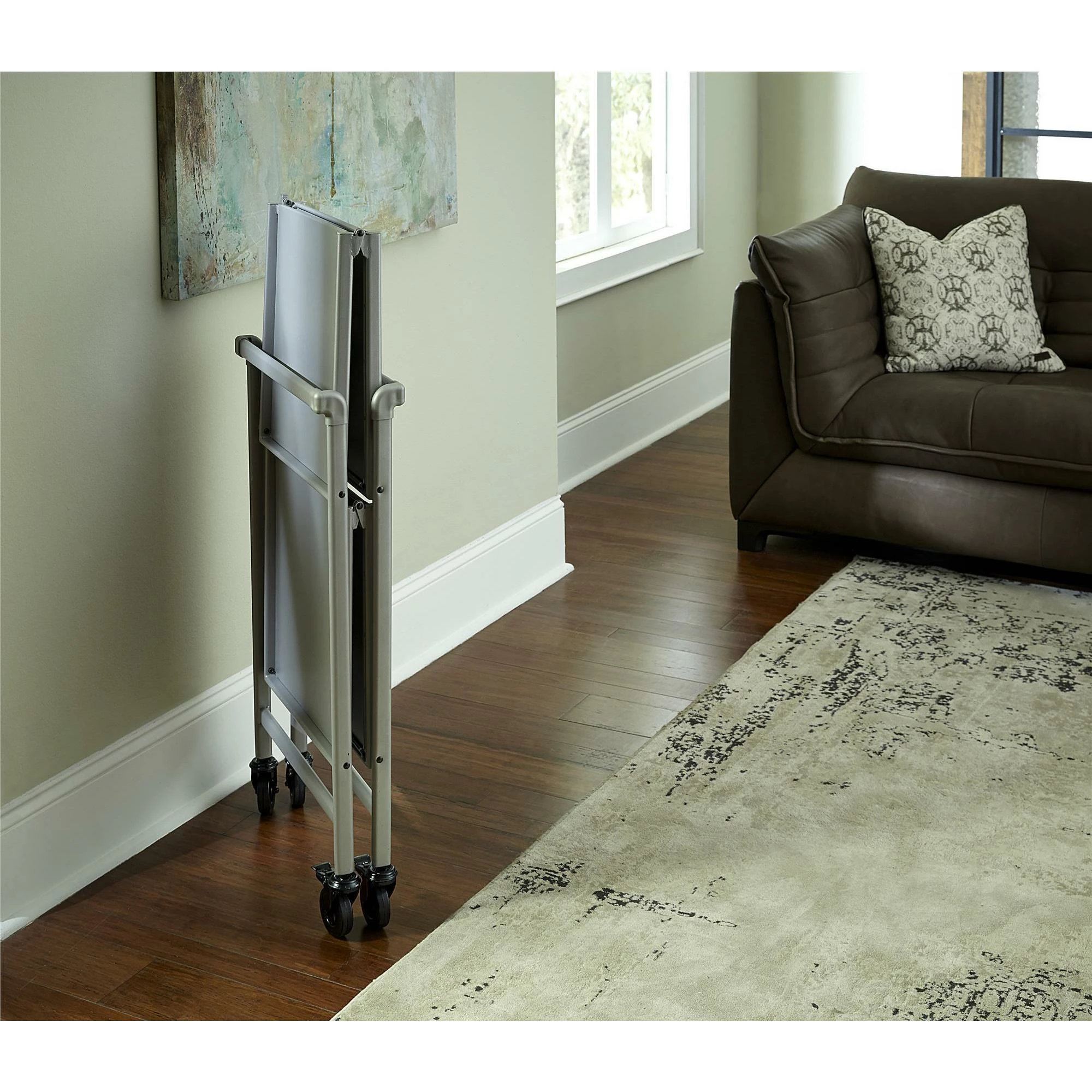 Serve your guests in any room with ease by employing this powder-coated steel serving cart on wheels. This folding cart features two solid metal shelves, each capable of holding up to 75 pounds, and it has locking casters to keep it from rolling away when you’re pouring drinks.