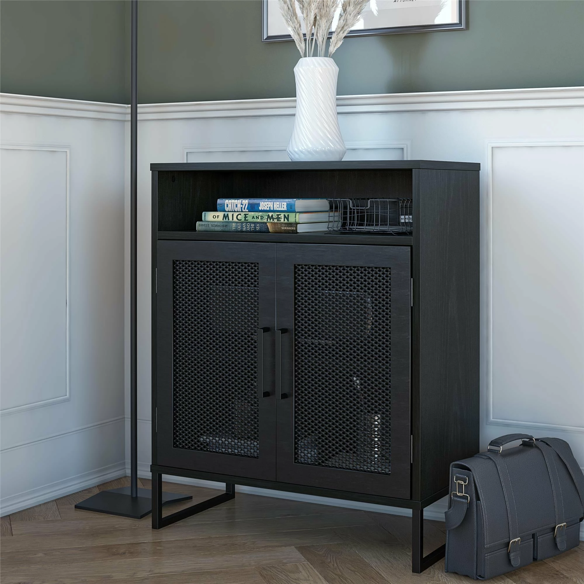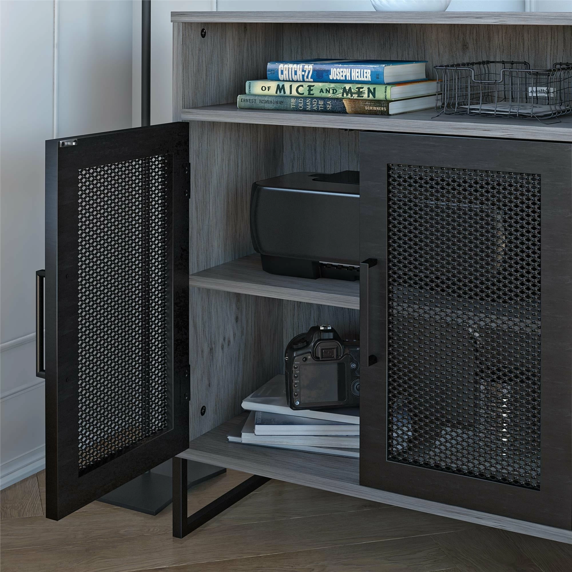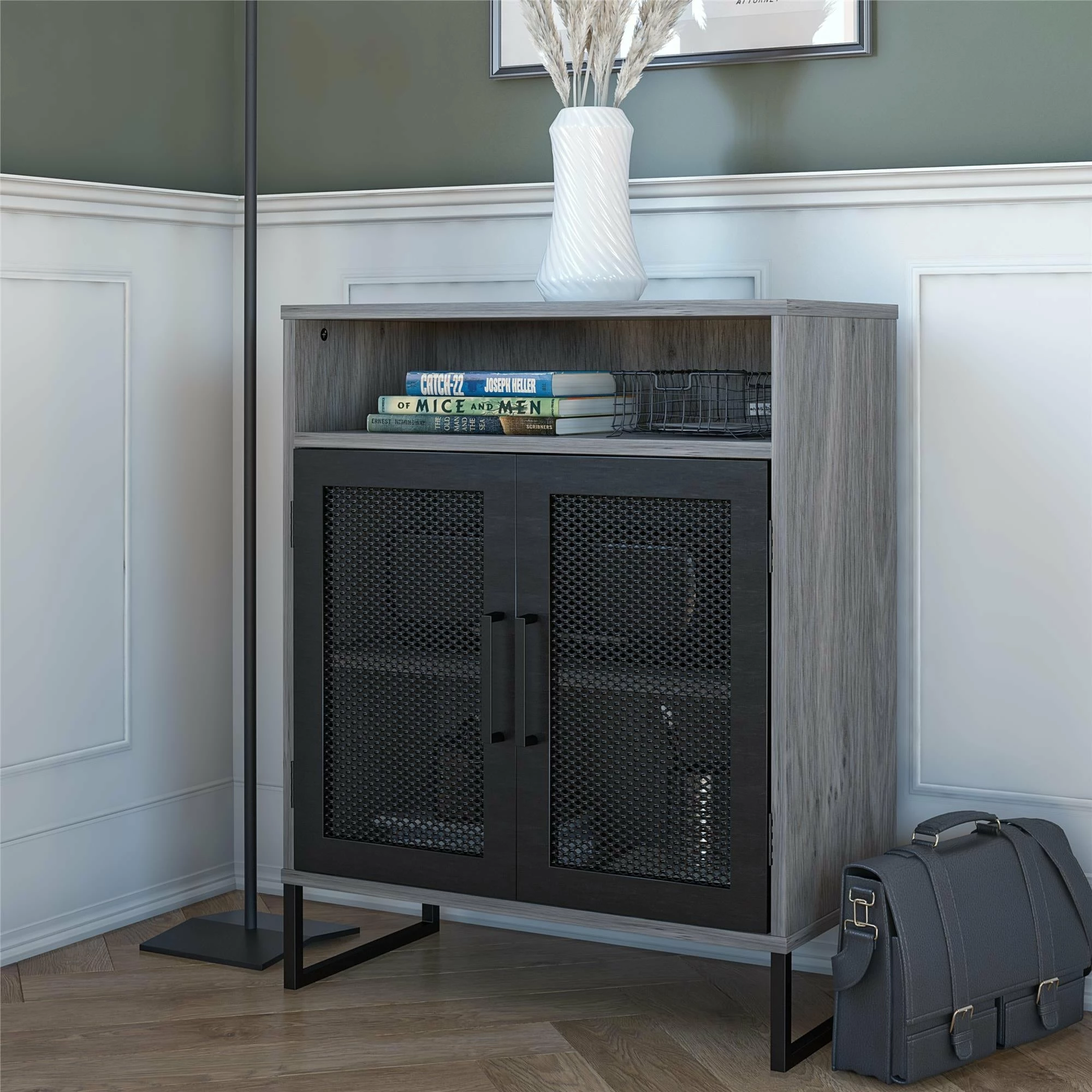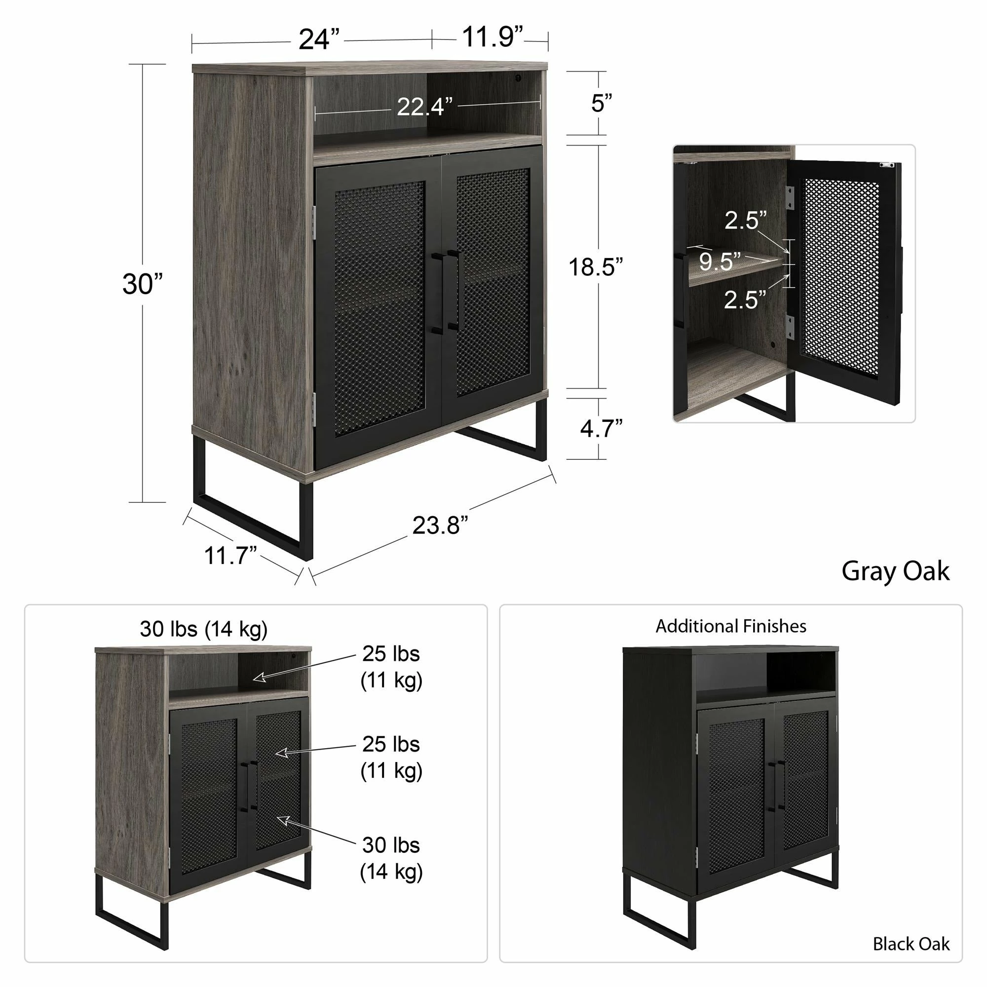 Streamline and organize your home office or dorm room with the Avenue Greene Picardy Storage Cabinet. ย Made of durable laminated MDF, particle board and sturdy powder coated metal, the black or grey oak finish and black metal legs gives your space a modern upgrade you crave, at an affordable cost you can stomach. ย The Picardy Storage Cabinet, with its two doors and three shelves, make a great addition to your work or study space, but its style and crisp design make for a perfect solution in any room where extra storage is desired. ย The top of the cabinet has been constructed with heavy loads in mind, holding up to 30 lbs., which far exceeds the necessary weight of your average home printer. ย An open cubby just below the top is ideal for storing extra printer paper, pens or notepads, and the two spacious shelves below allow you to tuck away essentials out of sight to keep your home looking neat and clutter free. ย The metal mesh cabinet doors are carefully crafted with a magnetic catch for a smooth and secure close every time. ย The top shelf behind the cabinet doors can be adjusted or removed for exceptionally tall, to exceptionally small item storage. ย The cabinet ships flat to your door in one box. ย Two adults recommended to assemble. ย Once assembled the cabinet measures to be 24″ W x 11.9″ D x 30″ H and weighs 35.36 lbs.